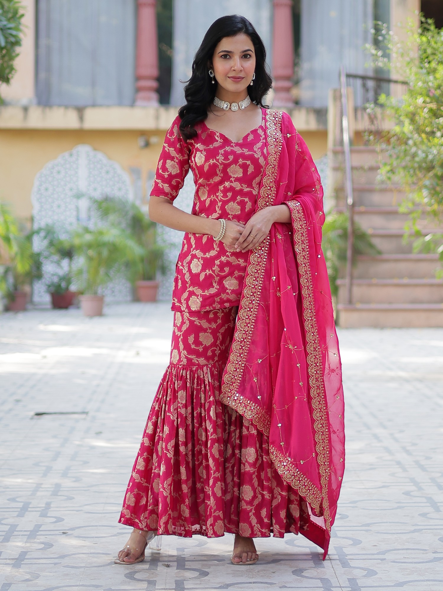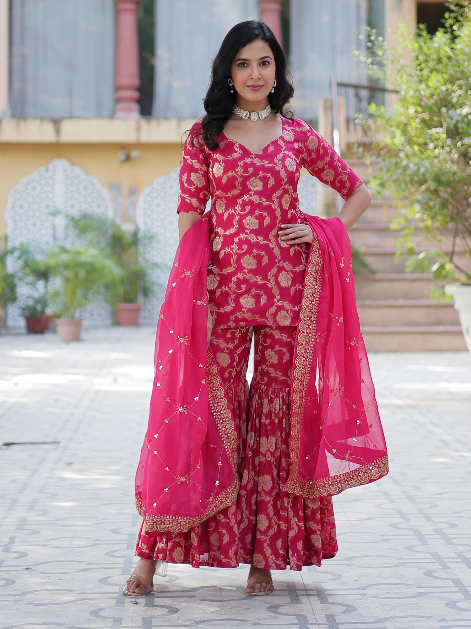 Step into a world of vibrant colors and intricate designs with this stunning three-piece ensemble. The radiant hue instantly brightens any room, while the delicate floral print adds a touch of classic femininity. Crafted for comfort and style, this outfit is perfect for festive occasions, family gatherings, or adding a touch of glamour to your everyday look. The soft, flowing fabric drapes beautifully, ensuring you look and feel your best. This design seamlessly blends traditional aesthetics with modern sensibilities, creating a look that is both timeless and effortlessly chic.