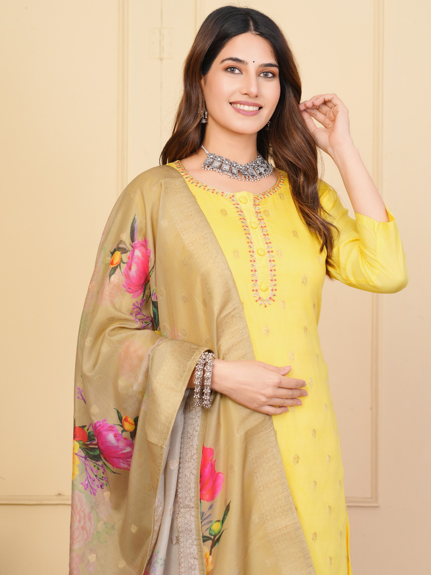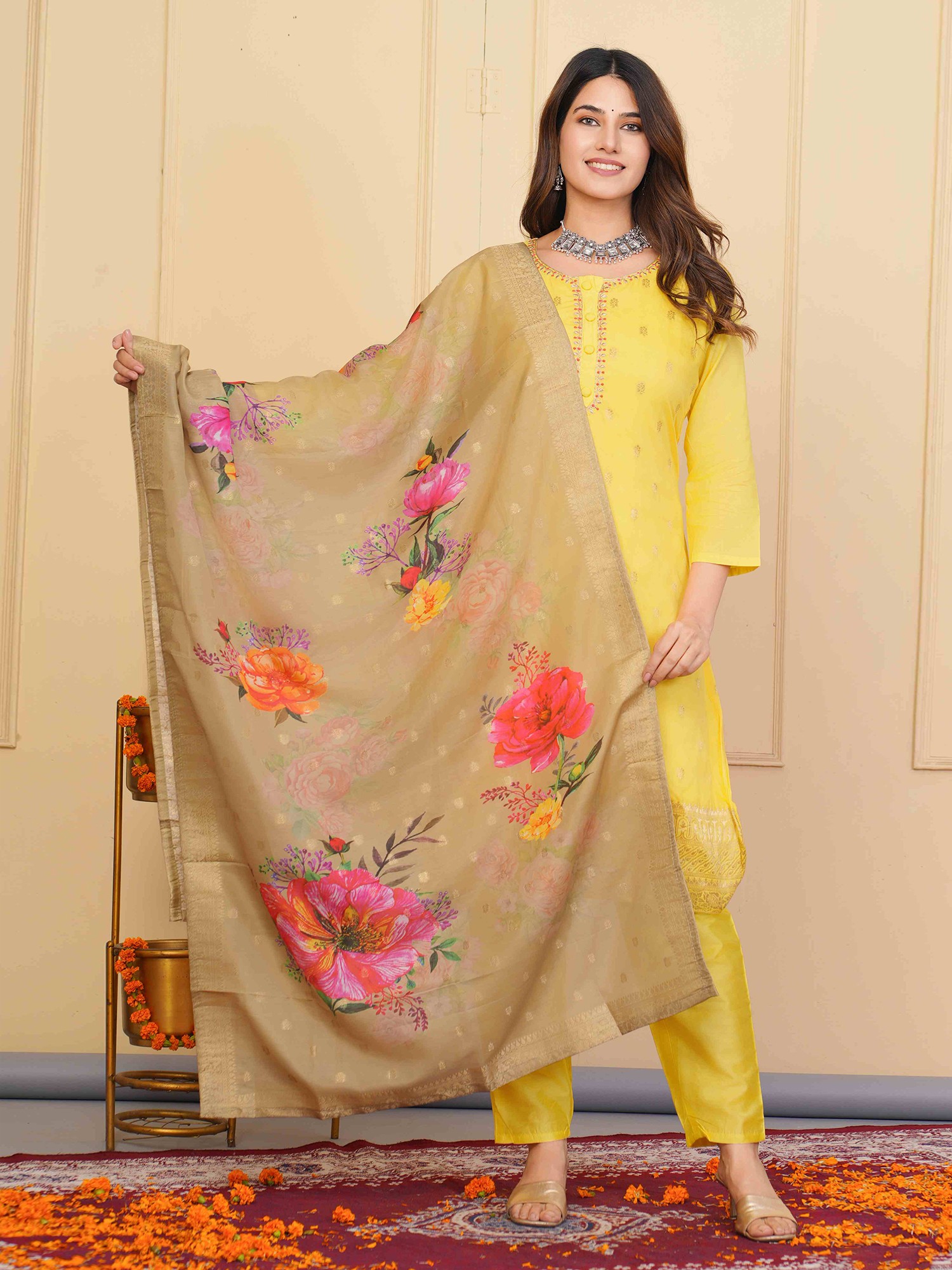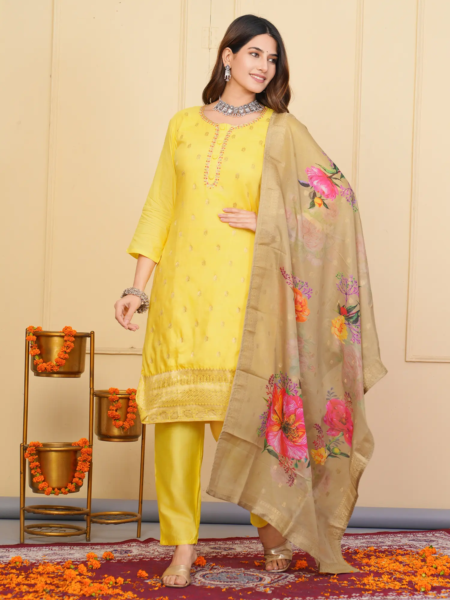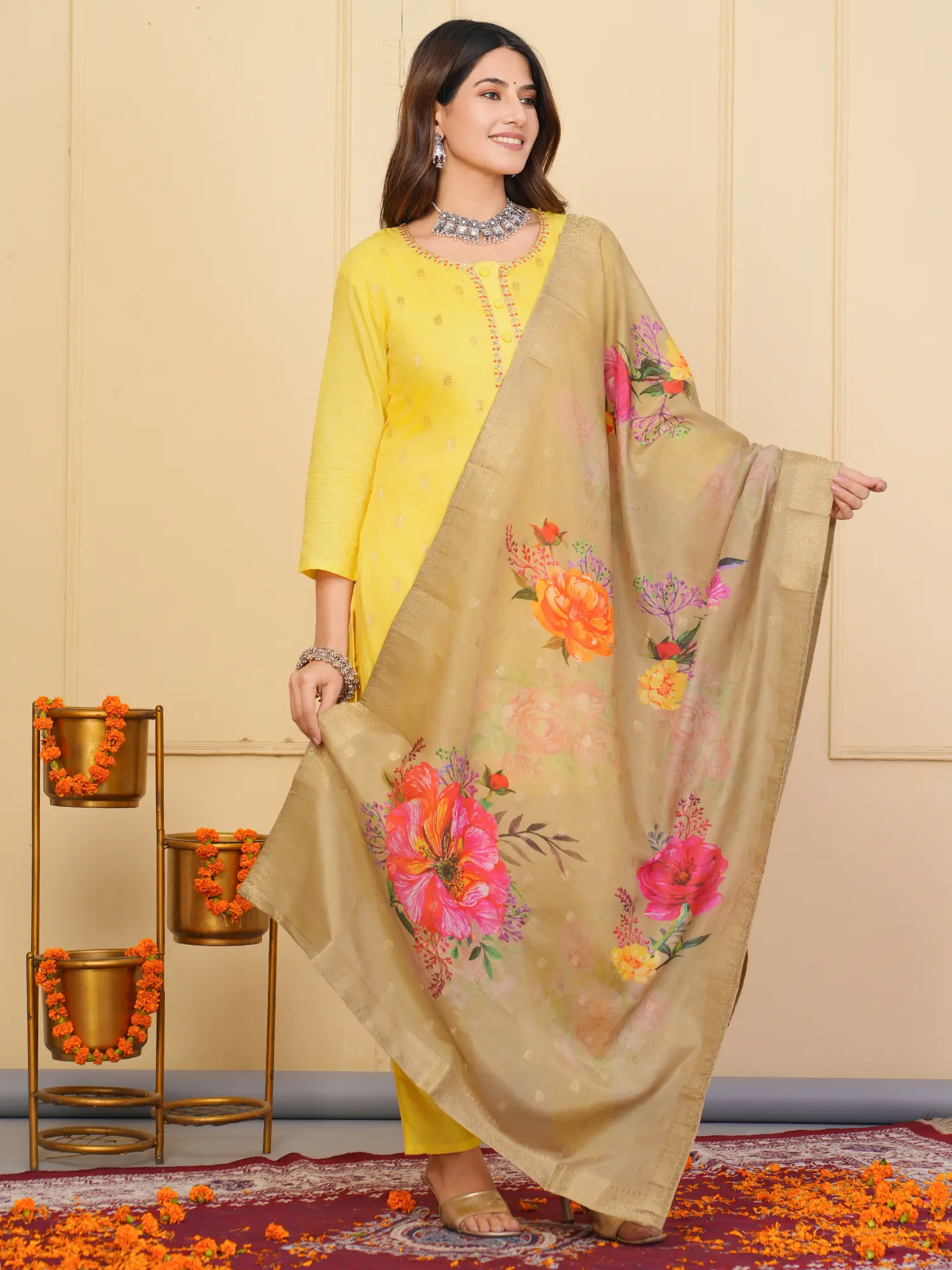Cotton Silk Floral-Paisley Motif Salwar Kameez With Resham Embroidery On Neck Placket And Digital Printed Dupatta