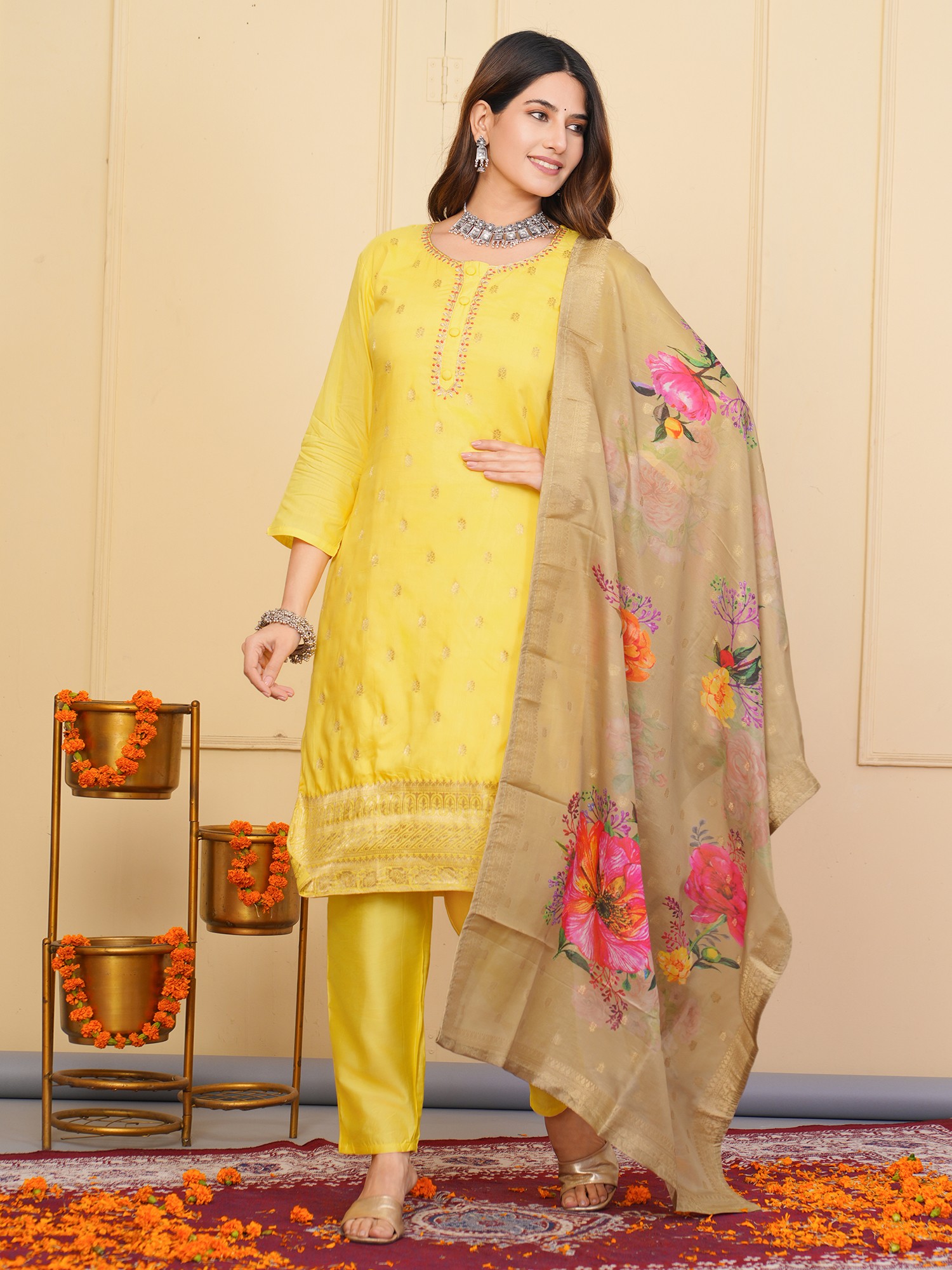 Cornsilk Flared-Palazzo Salwar Kameez Suit with Zari Embroidery and Woven Motifs