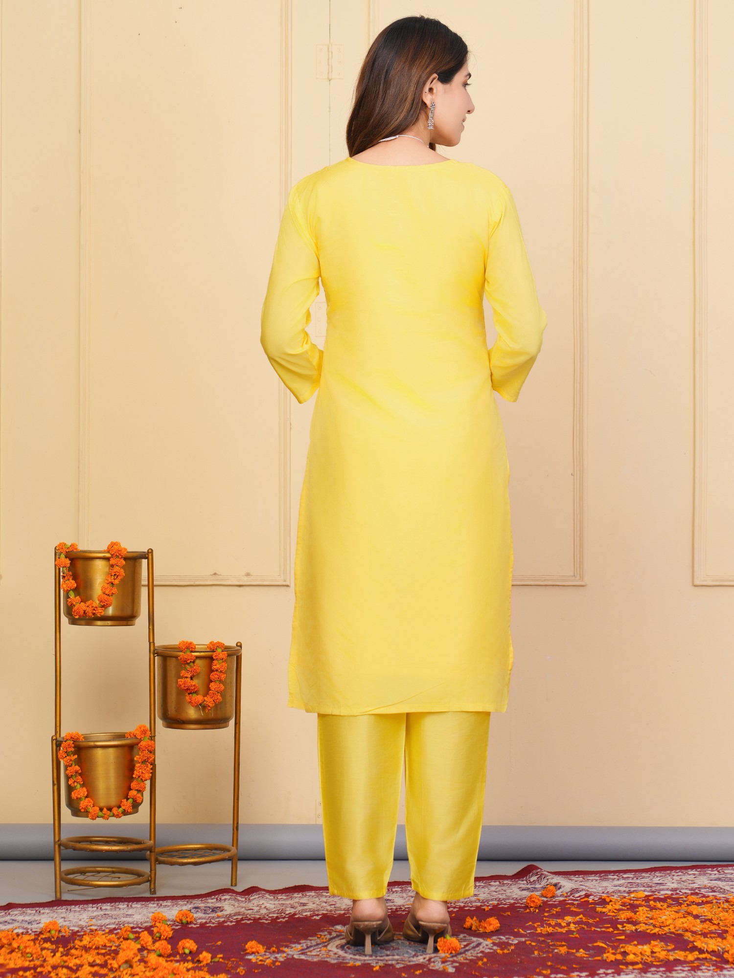 Yellow Pure Cotton Flower Bunch Motif Hand Embroidered Kurti Set