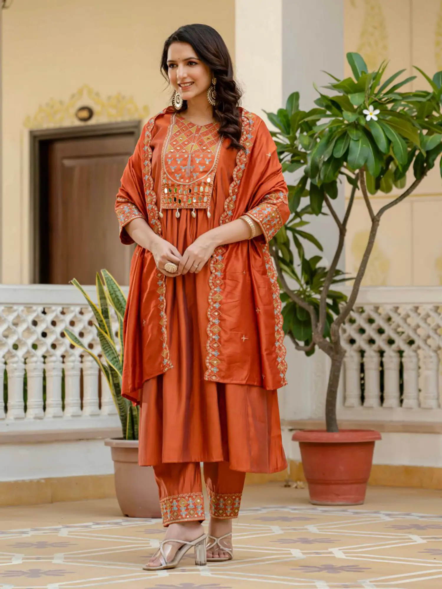 Adorned with intricate multi-thread embroidery and authentic real mirror handwork on the neckline, cuffs, and dupatta.