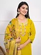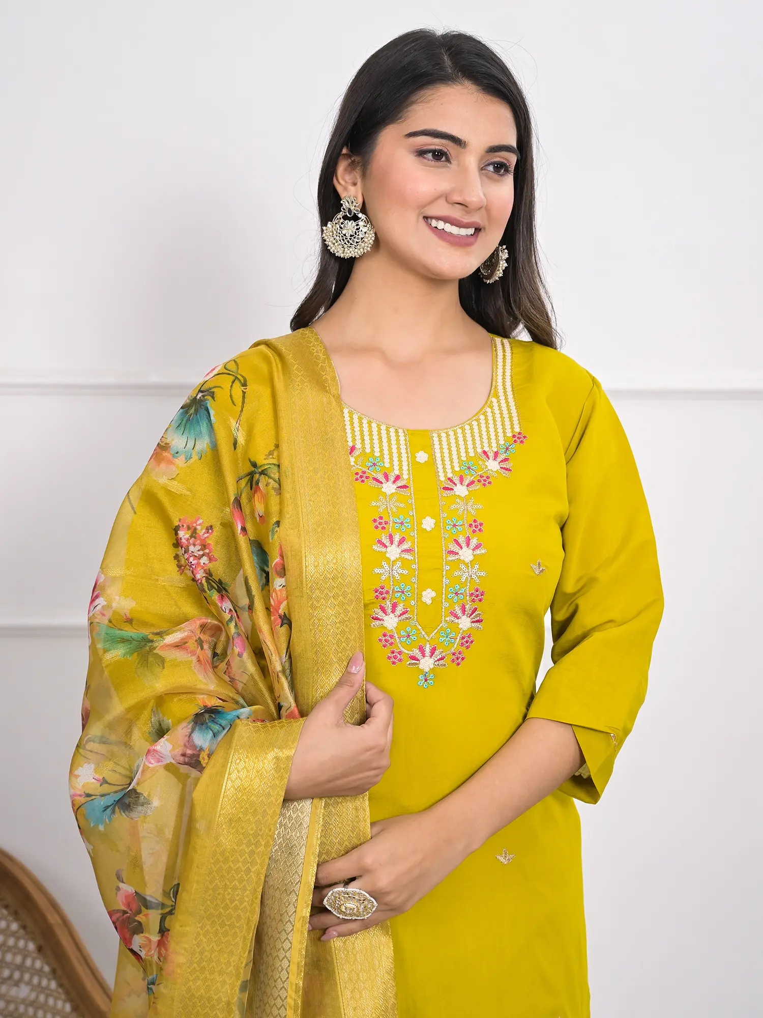 Floral Embroidery Work On Neck Viscose Silk Kurta Set With Attractive Printed Dupatta