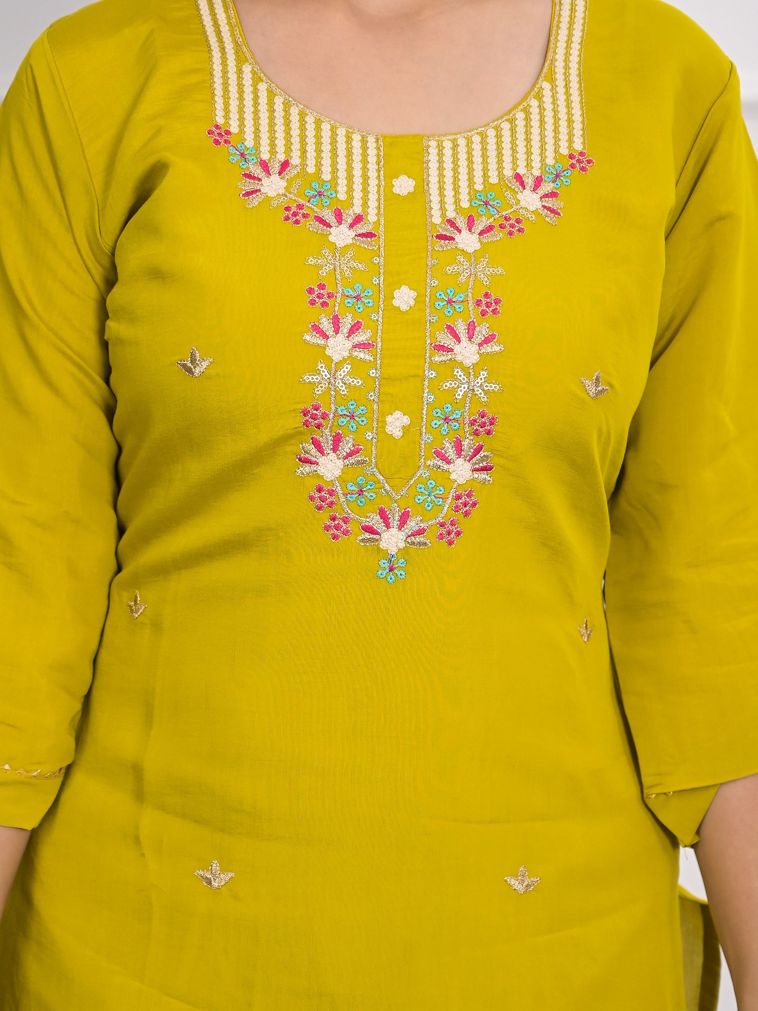 Floral Sequins Work Elegant Viscose Silk Straight Kurta Set With Matching Tassels Dupatta