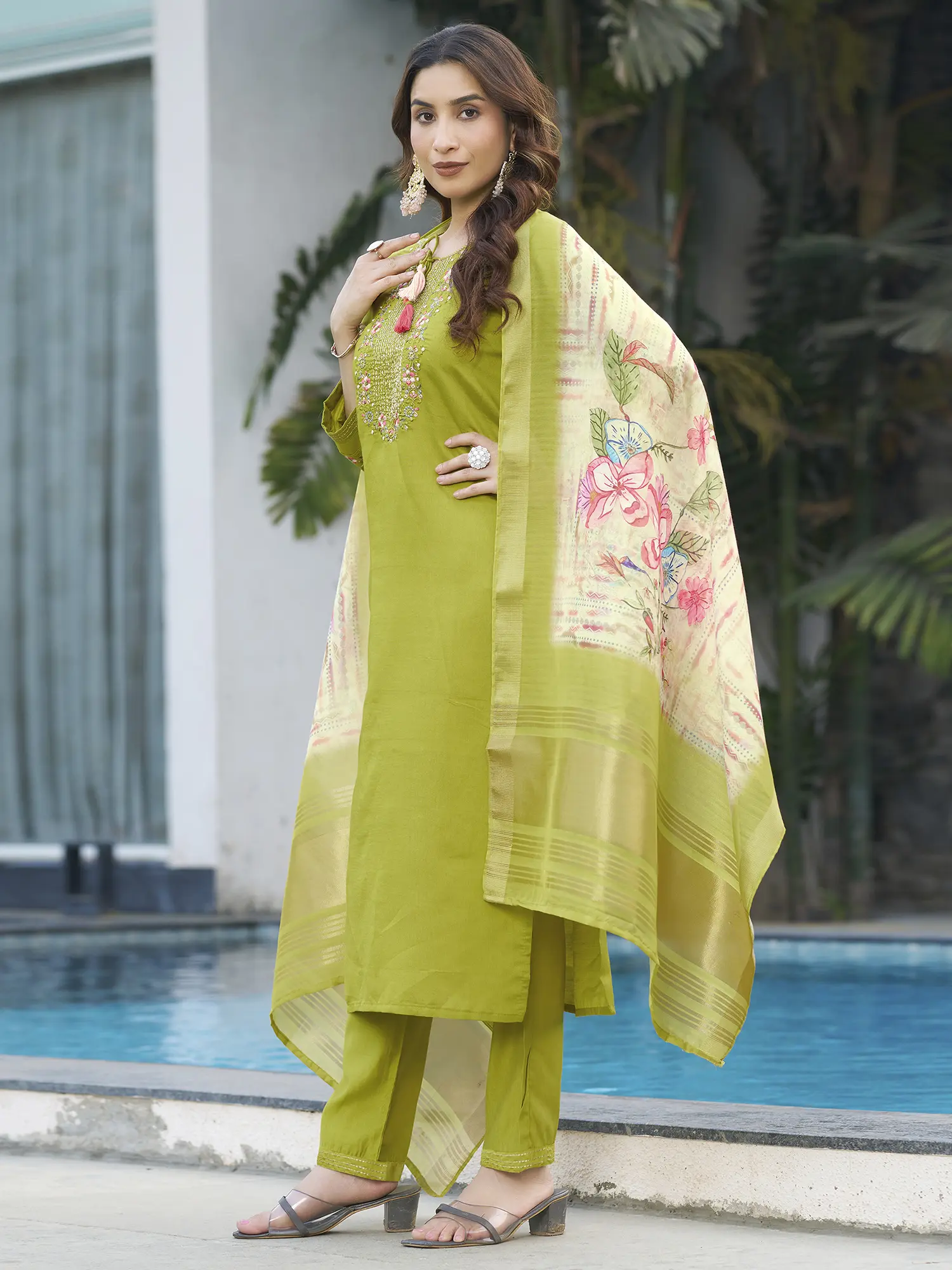 Complemented by a flowing maslin silk dupatta with subtle detailing.