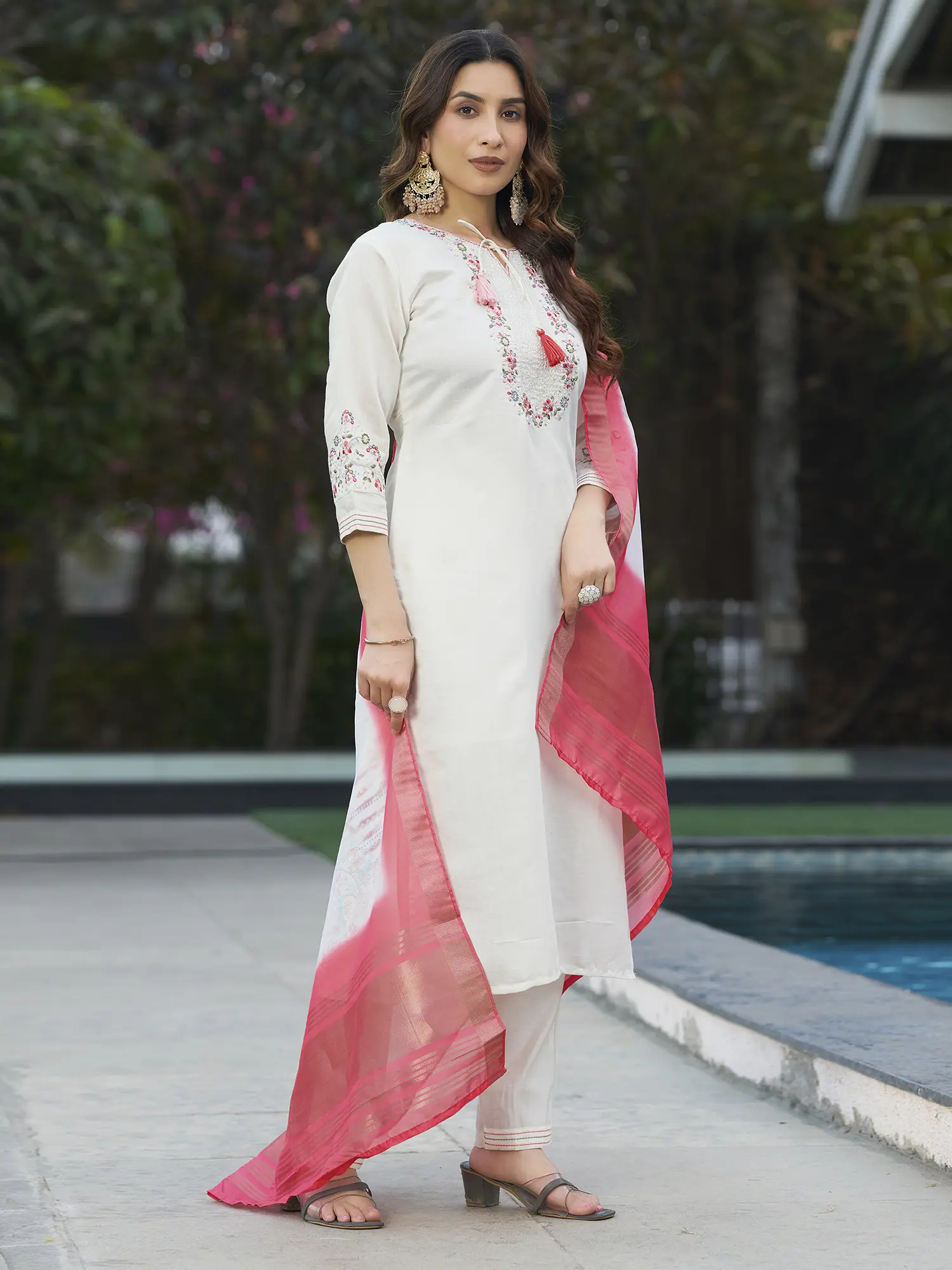 Adorning the neckline is an intricate tapestry of multi-colored embroidery, featuring delicate threadwork that speaks of traditional artistry. This same painstaking detail extends to the sleeves, where floral motifs are rendered with exceptional precision. The accompanying pant, tailored for comfort and a flattering silhouette, ensures a cohesive and polished look. Completing this ensemble is a flowing maslin silk dupatta, offering a soft, ethereal touch.