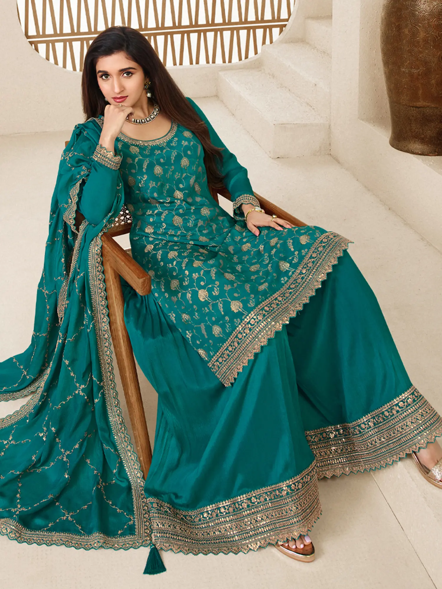 The rich teal hue forms a captivating canvas for the ornate golden embroidery that adorns the ensemble. You'll find this exquisite detailing cascading across the neckline, sleeves, and hem of the kurta, as well as gracing the edges of the flowing palazzo pants and the accompanying dupatta. The delicate zig-zag lace along the dupatta’s border adds a subtle yet significant touch of refined embellishment, reflecting light beautifully. Available in size #38 (Medium), it ensures a graceful and flattering fit for those who appreciate considered design.