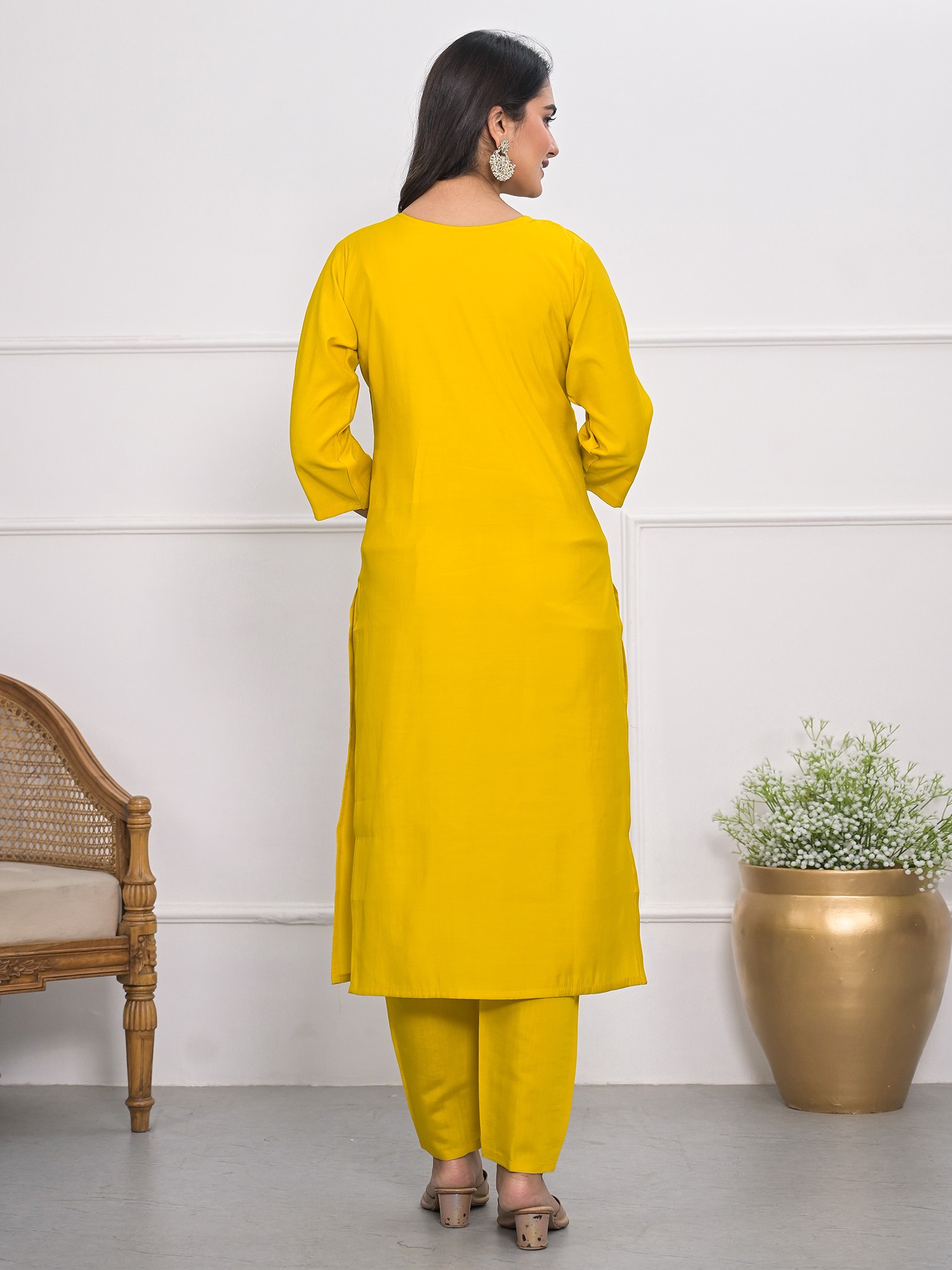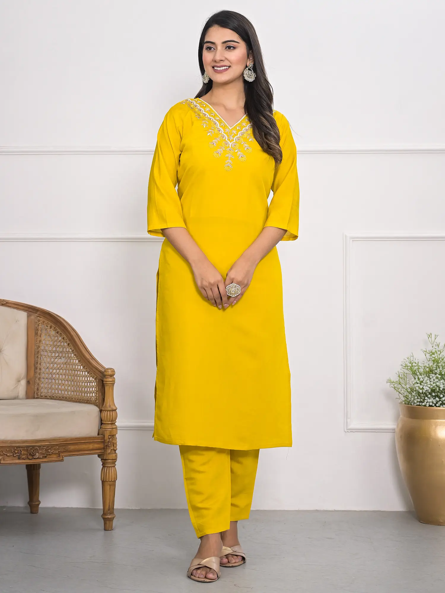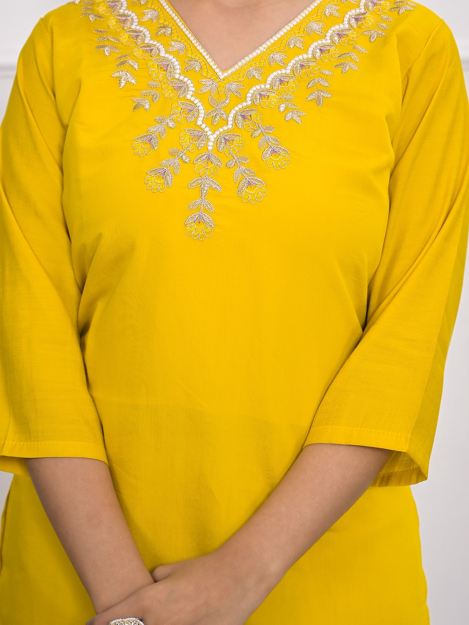 The beauty of this kurta set lies in the details. The V-neckline is gracefully adorned with intricate embroidery, adding a touch of classic elegance to the contemporary design. This delicate embroidery frames the face beautifully, enhancing your natural features.