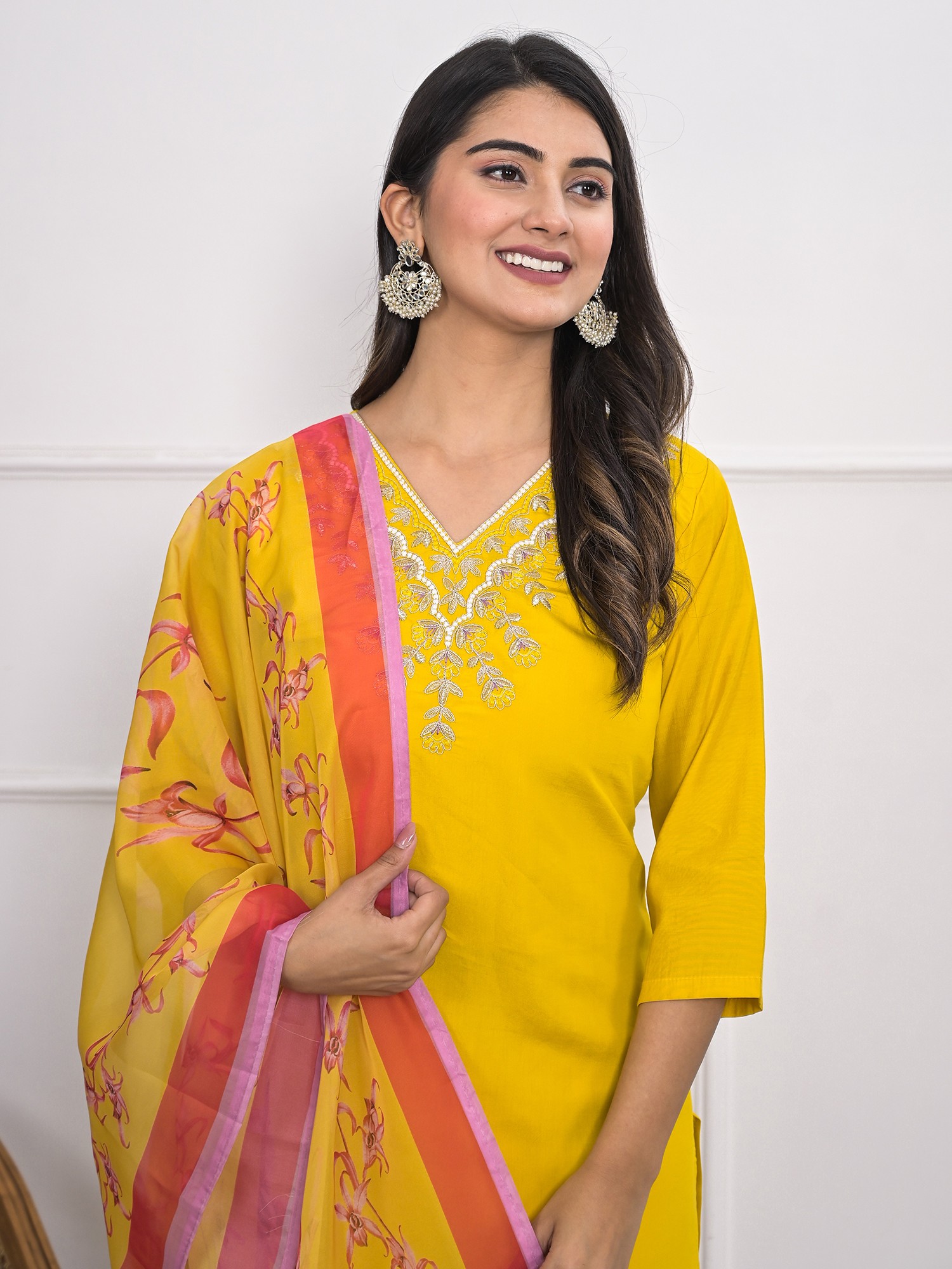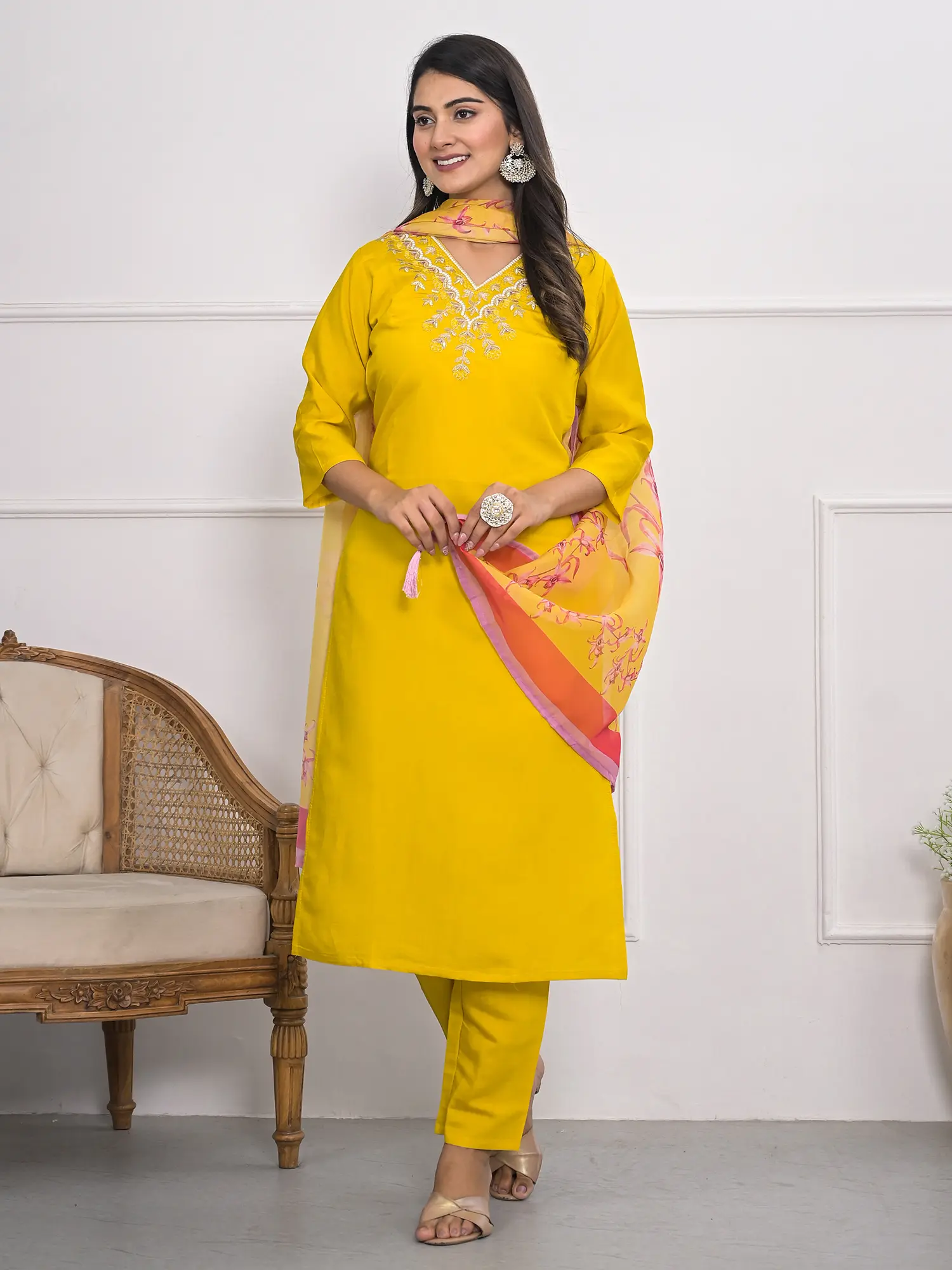 Floral Embroidery Work On Neck Viscose Silk Kurta Set With Attractive Printed Dupatta