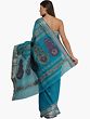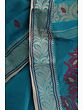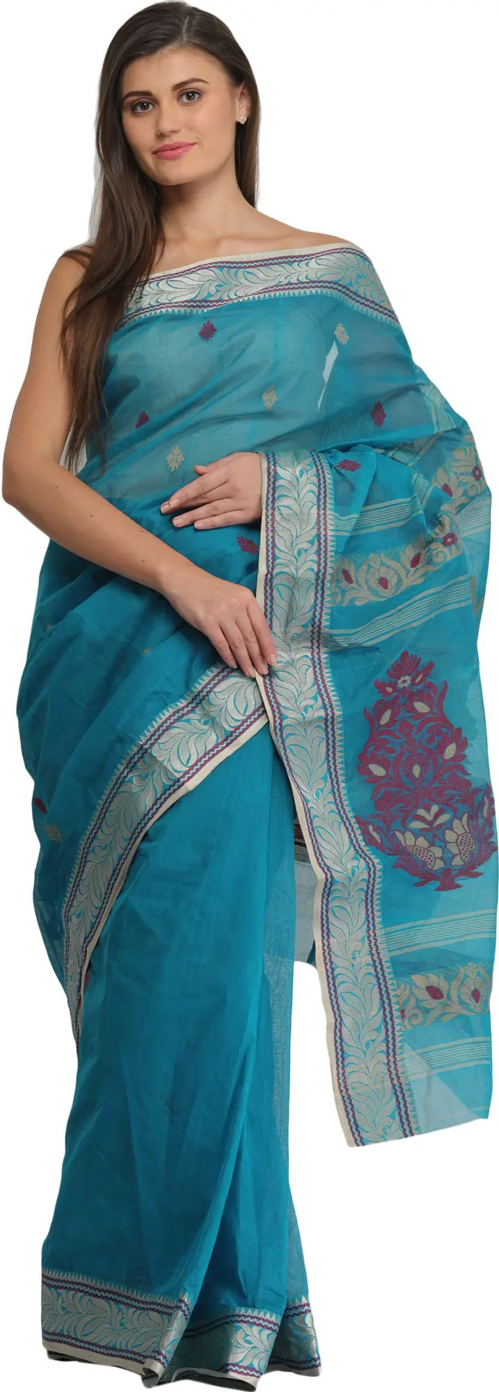 Vivid-Blue Purbasthali Tangail Sari from Bengal with Woven Floral Motifs on Pallu