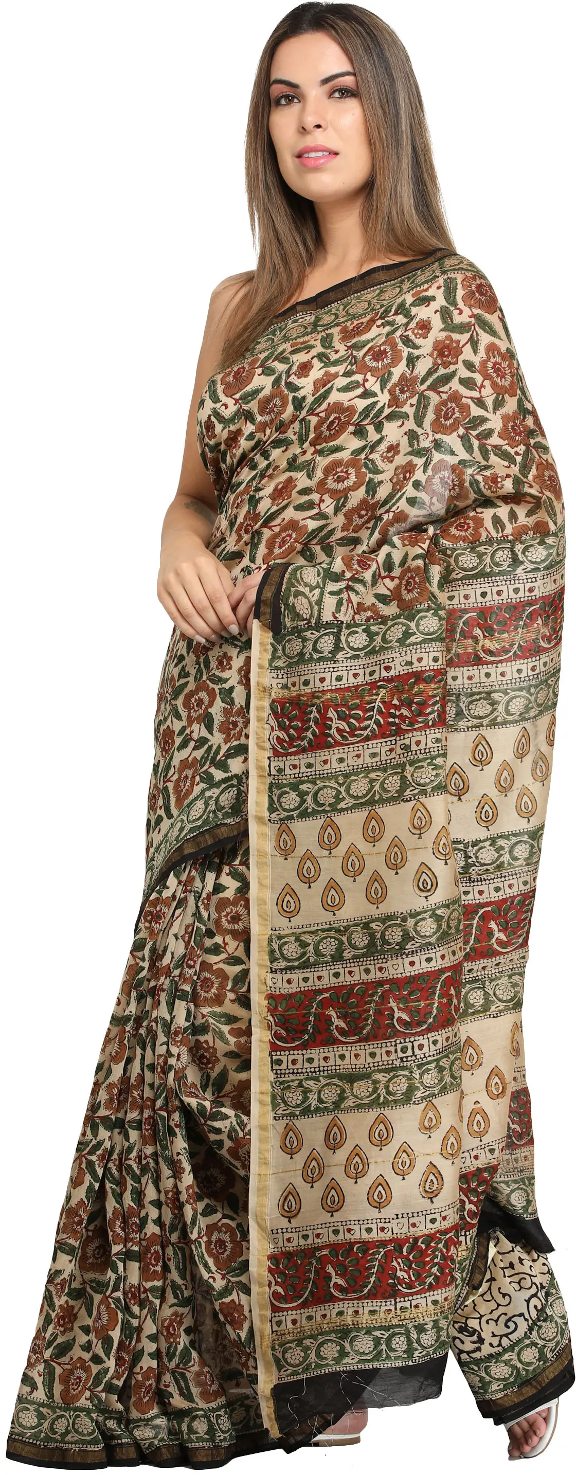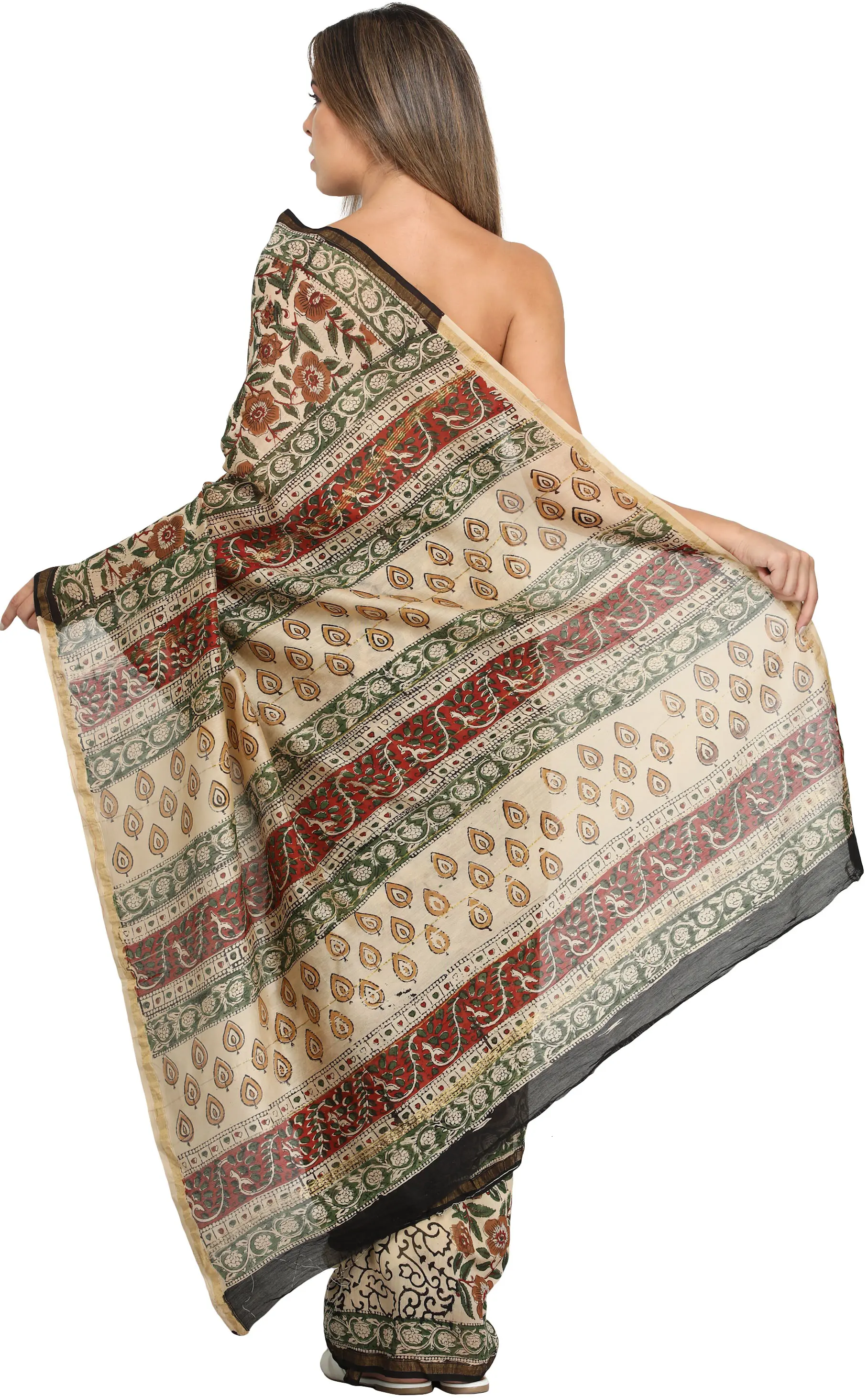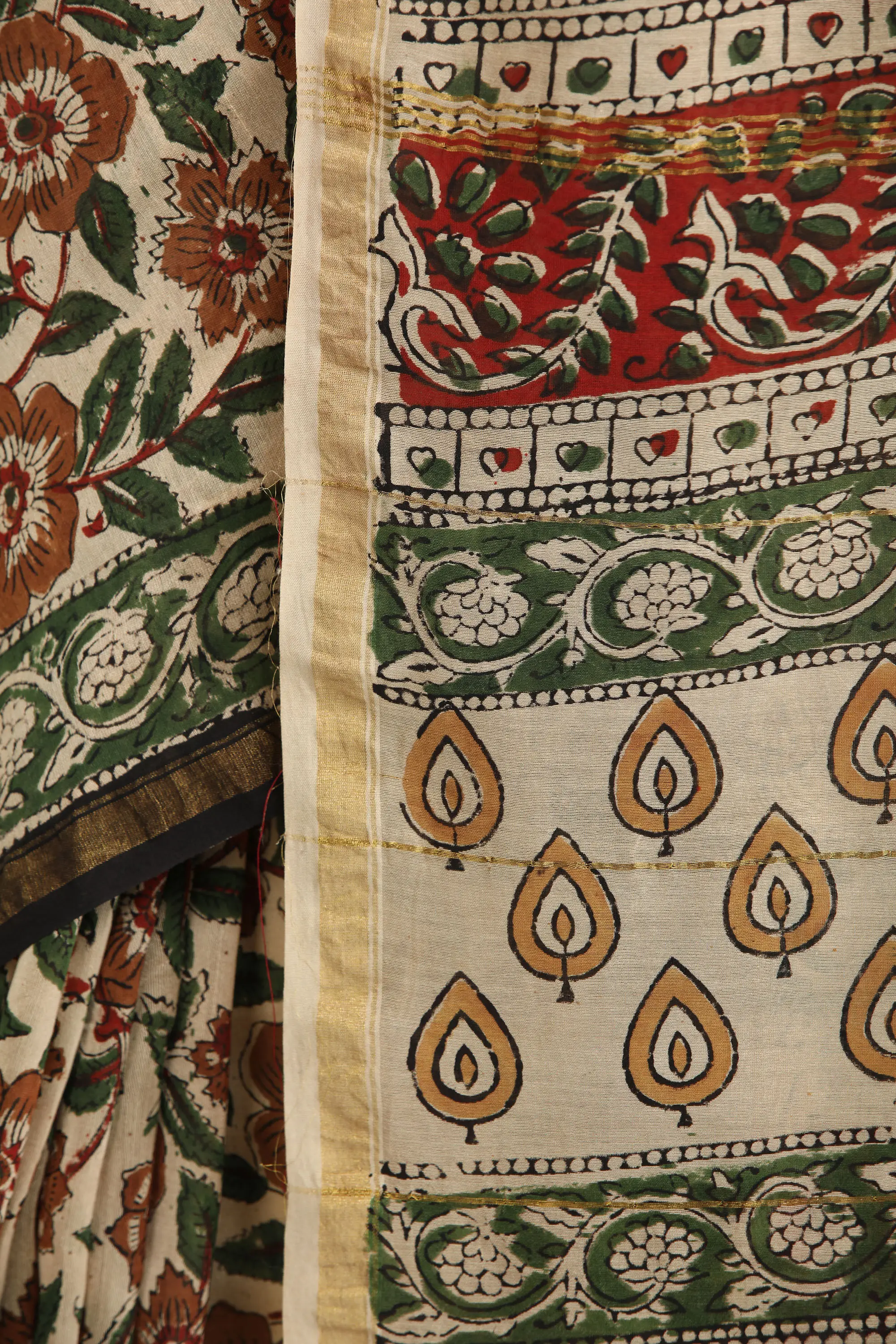 Forest-River Kalamkari Dupatta from Telangana with Zari Border and Printed Paisleys