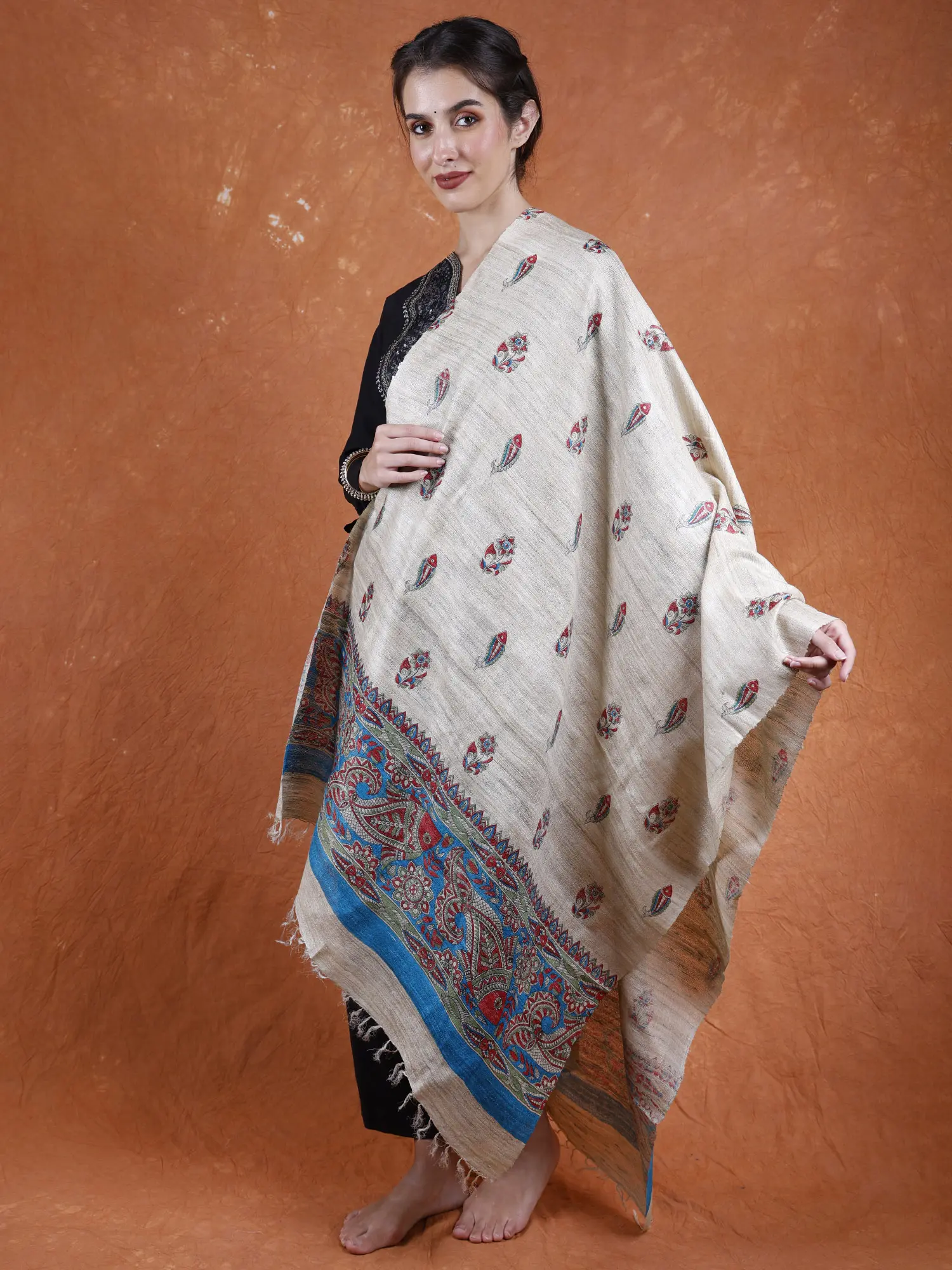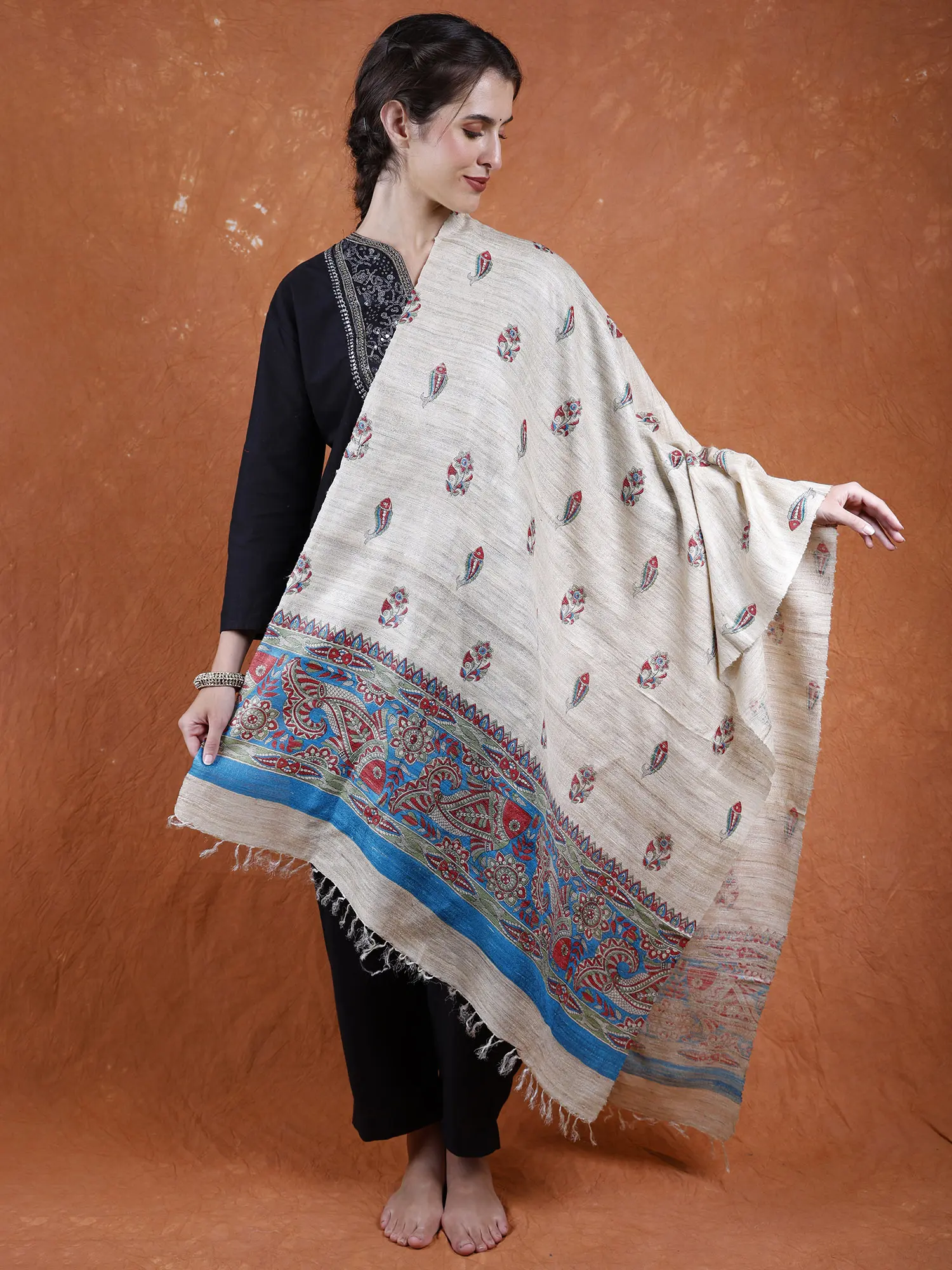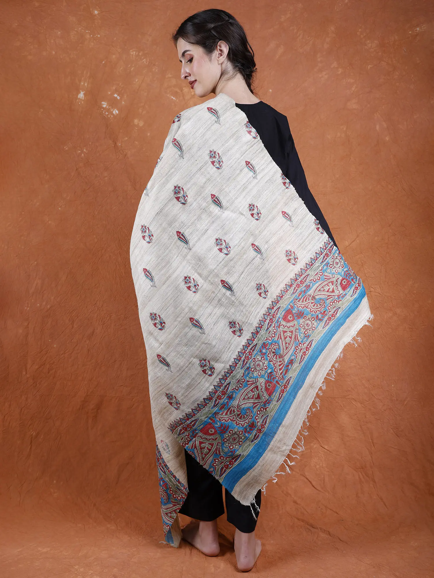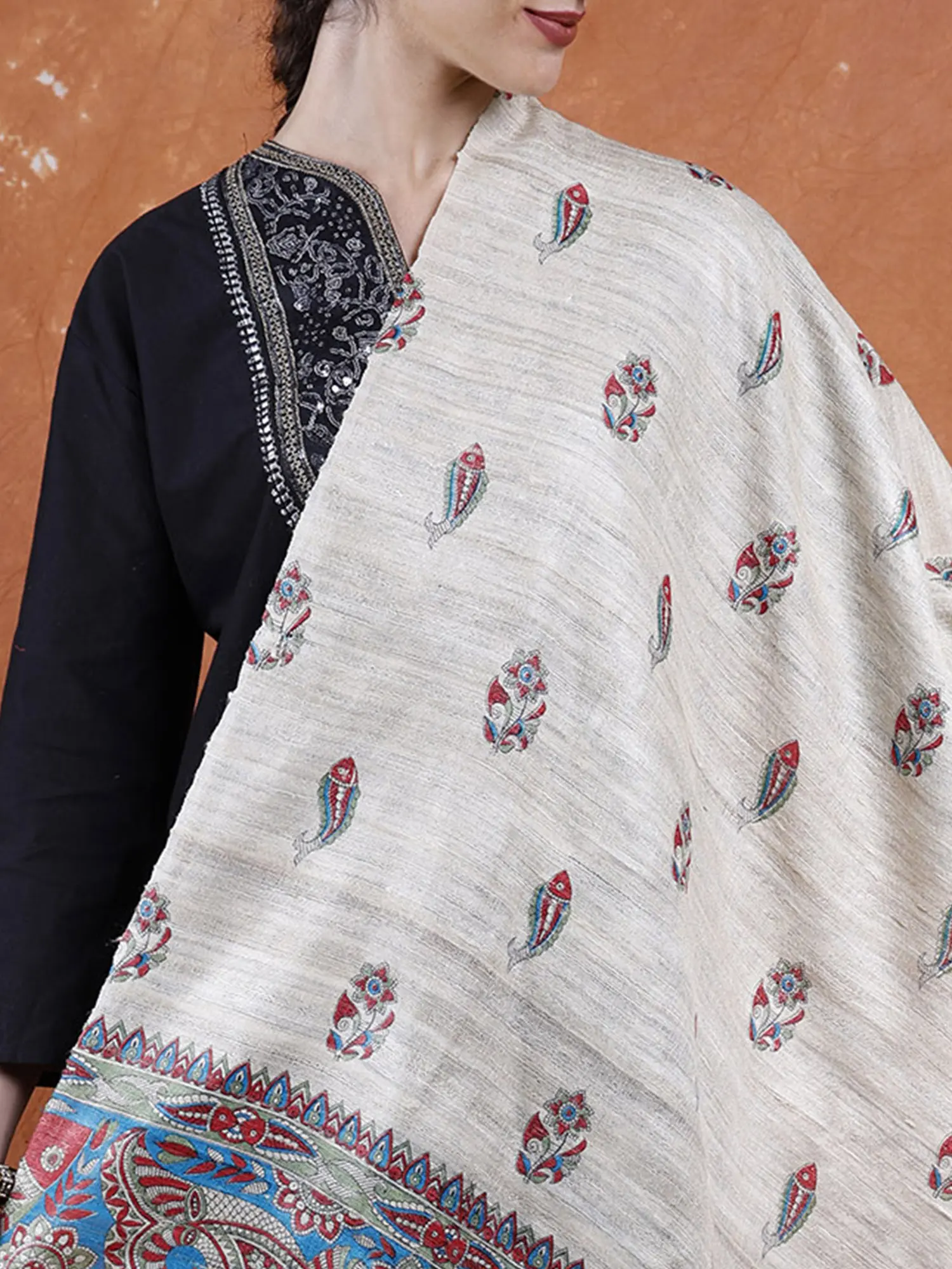 Madhubani art, extending beyond traditional canvases, has found expression in clothing. The Warm-Sand Khadi Silk Madhubani Dupatta from Bihar beautifully encapsulates the earthy charm of Madhubani art. Hand-painted fishes, symbolic in Madhubani tradition, grace the fabric, infusing it with cultural significance. The plain grey background serves as a perfect canvas, allowing the colorful motifs to shine vibrantly.