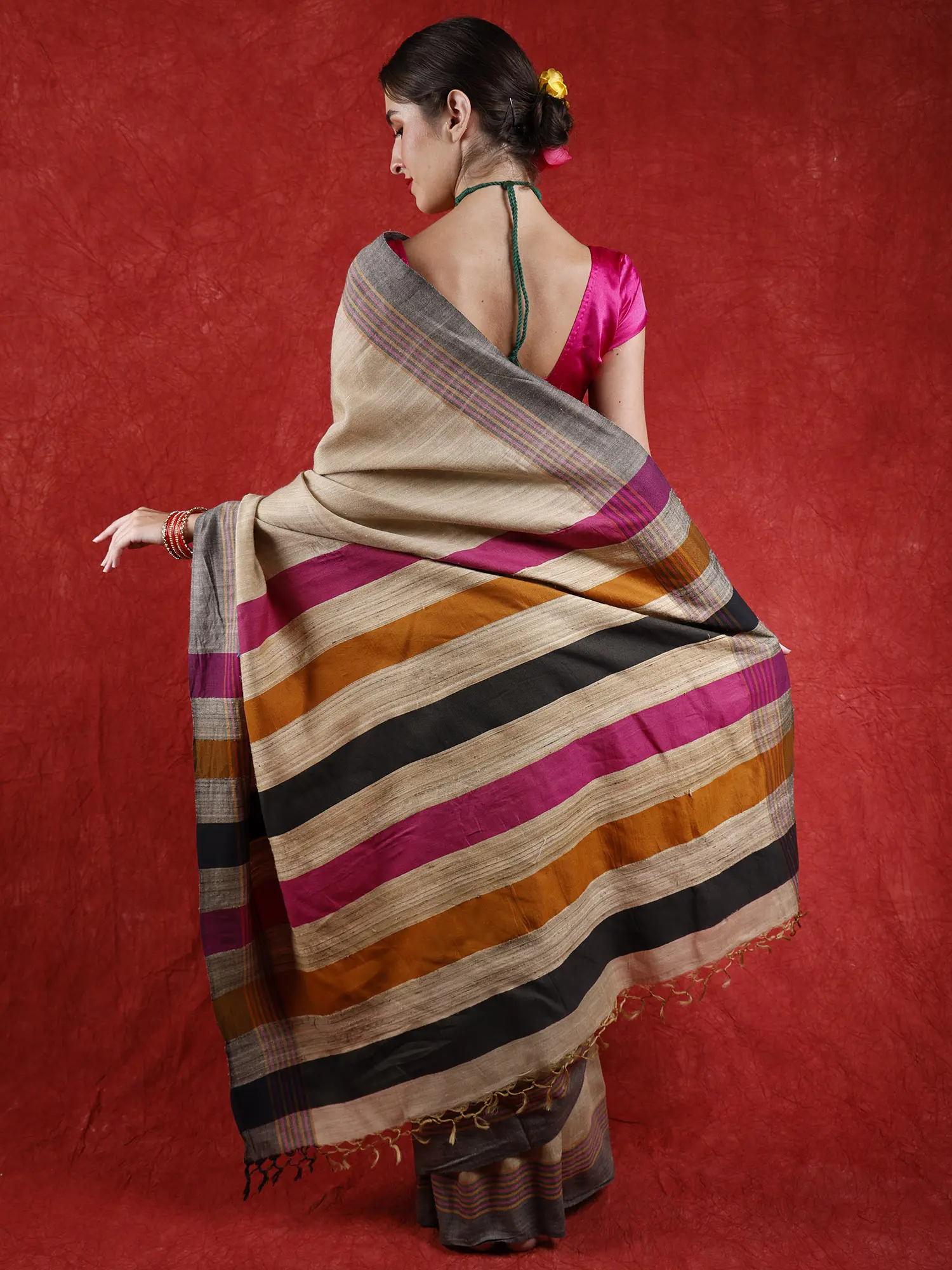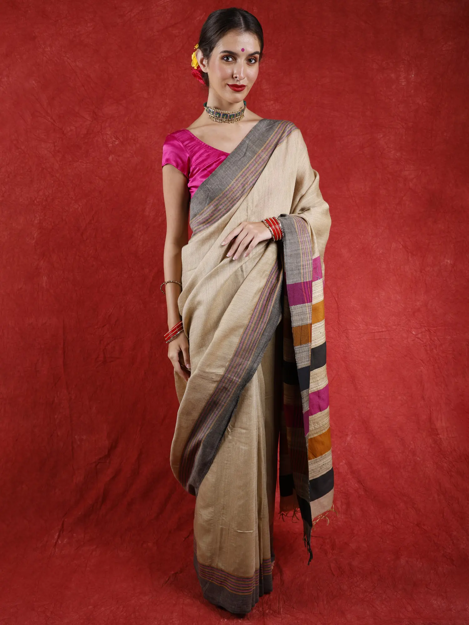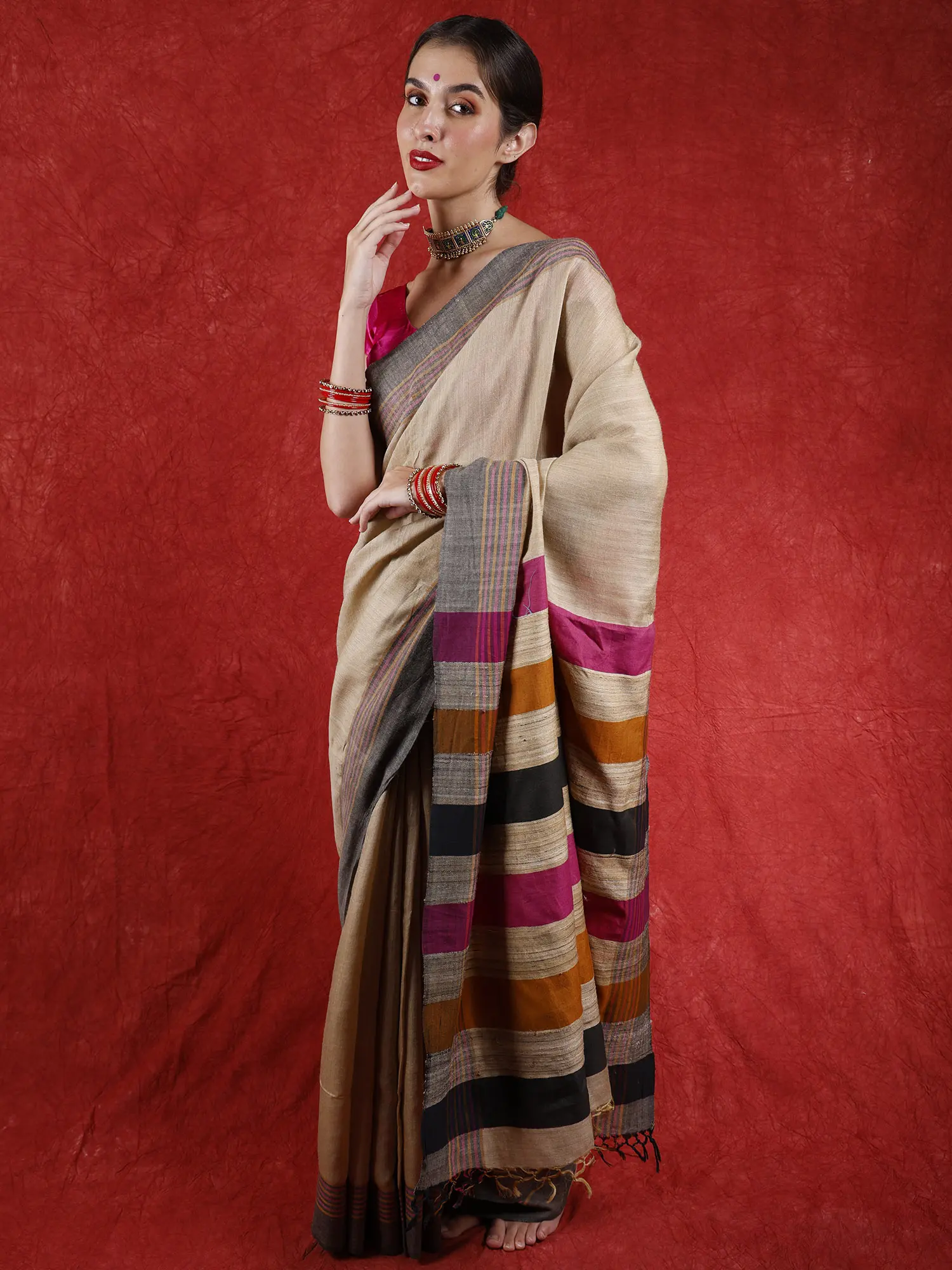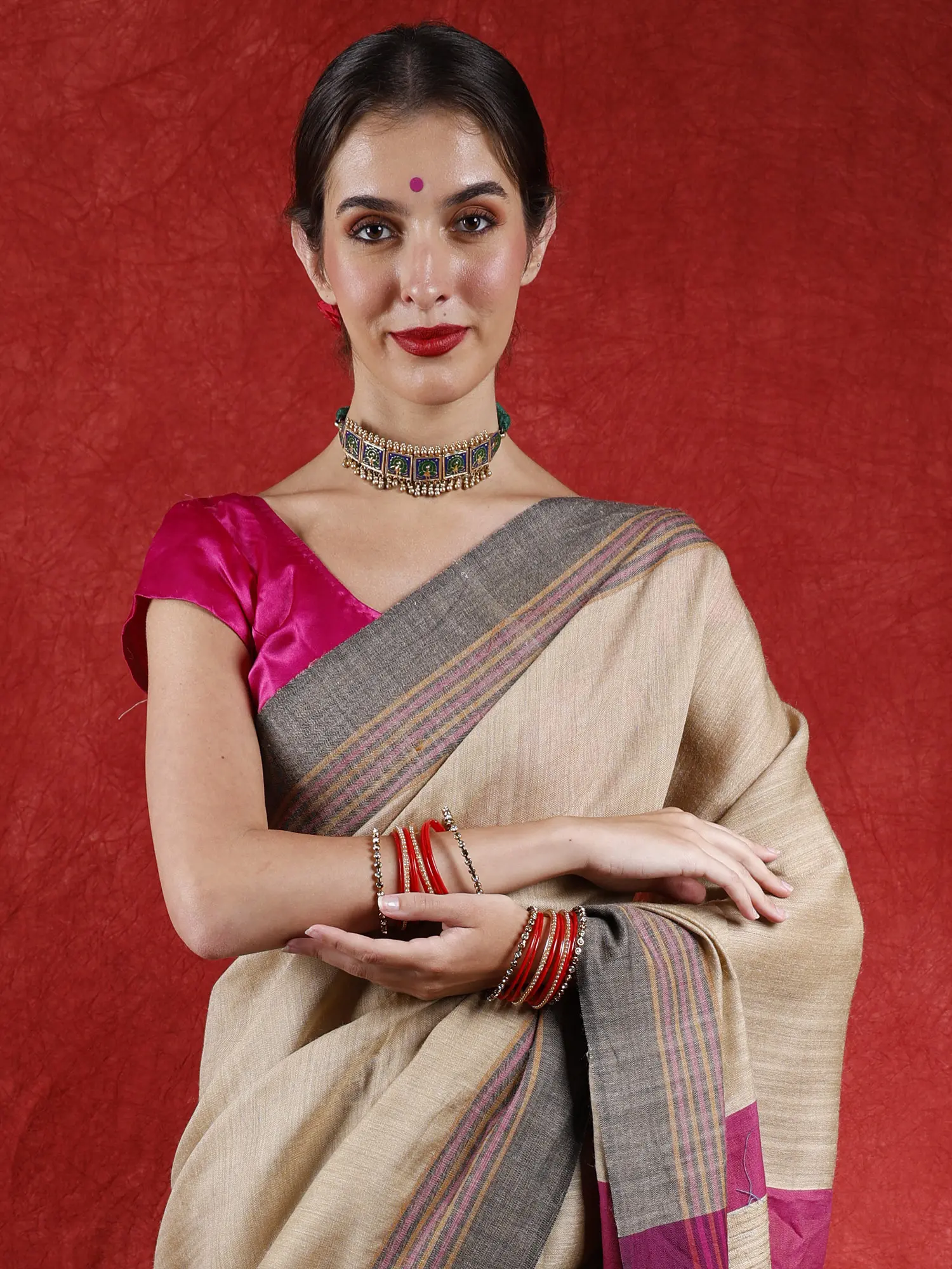 Simple sarees have always been favored by aristocratic women for their understated elegance, often worn for important meetings and discussions. This Warm-Sand Plain Khadi Cotton Saree with Stripe on Pallu follows this tradition, becoming a modern-day favorite for sophisticated women.