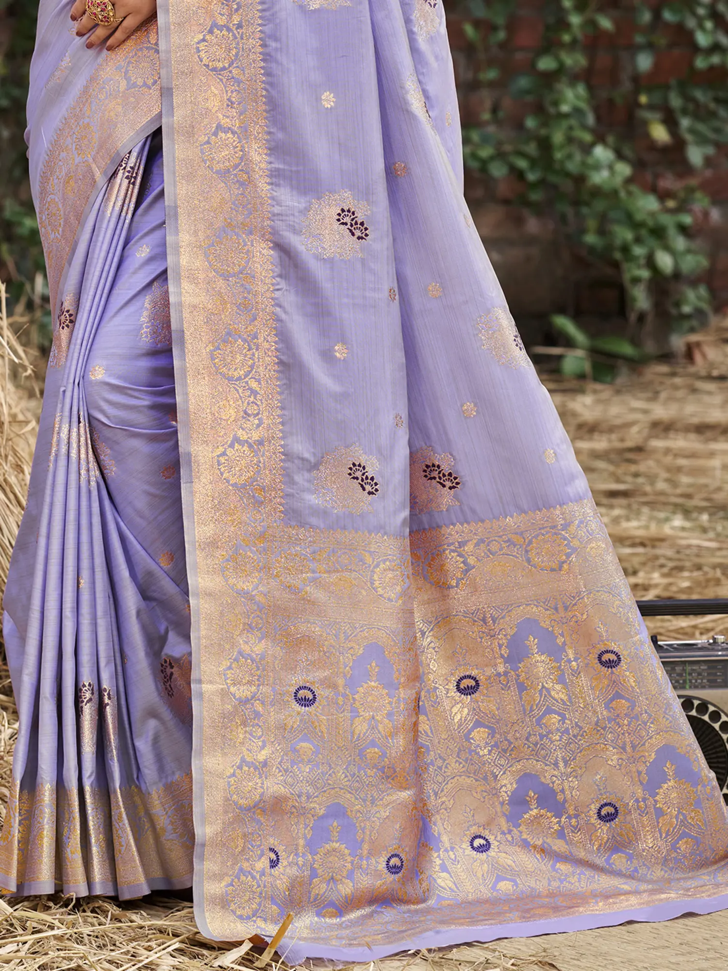 Party Wear Vichitra Silk Saree With Gold Zari Work On Border And Motifs All-Over