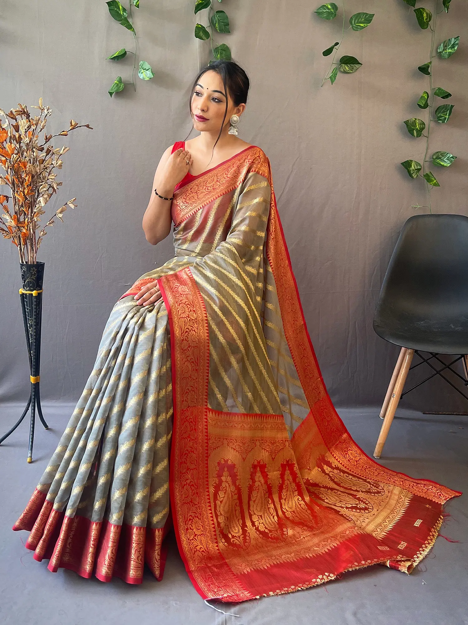 A classic silk saree with a beautiful stripe pattern all over, this is an ethnic wear that will always be trendy.