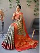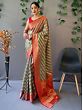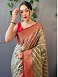 The pallu is ornamented with large paisley butas and ethnic patterns that add a regal touch to the drape.