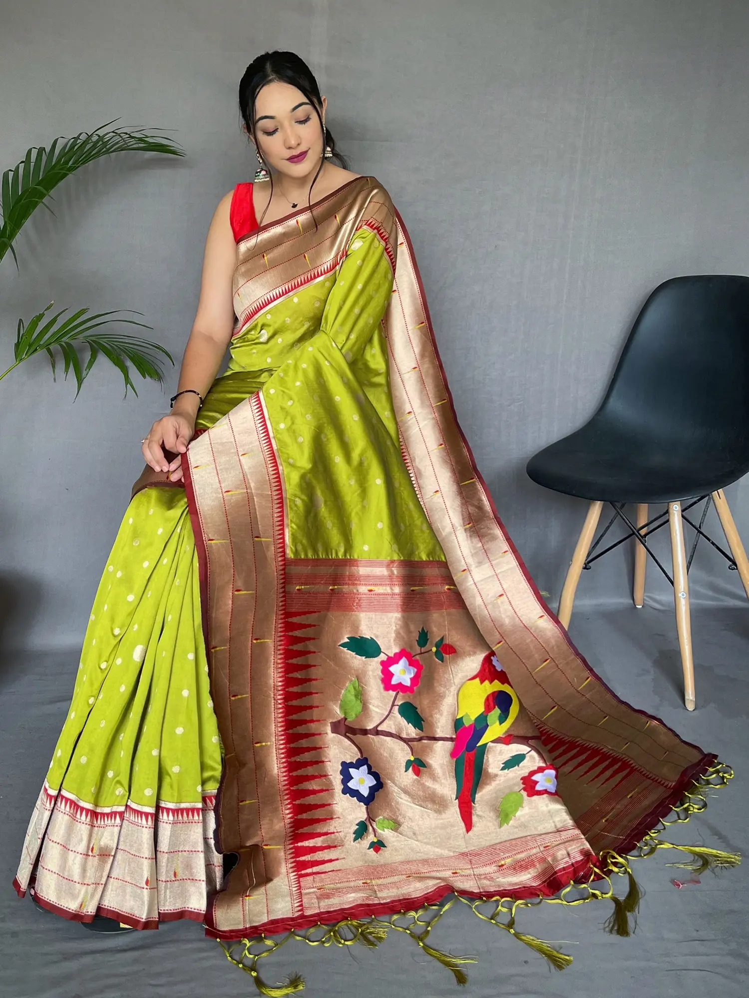 Embrace the epitome of Indian elegance with this exquisite silk saree, a true masterpiece designed to make you shine at any festive occasion or party. Crafted from the finest silk, this saree drapes beautifully, offering a luxurious feel and a captivating sheen that speaks volumes of its quality and artistry. The vibrant lime green hue, adorned with delicate white polka dots, adds a playful yet sophisticated charm, ensuring you stand out with effortless grace.