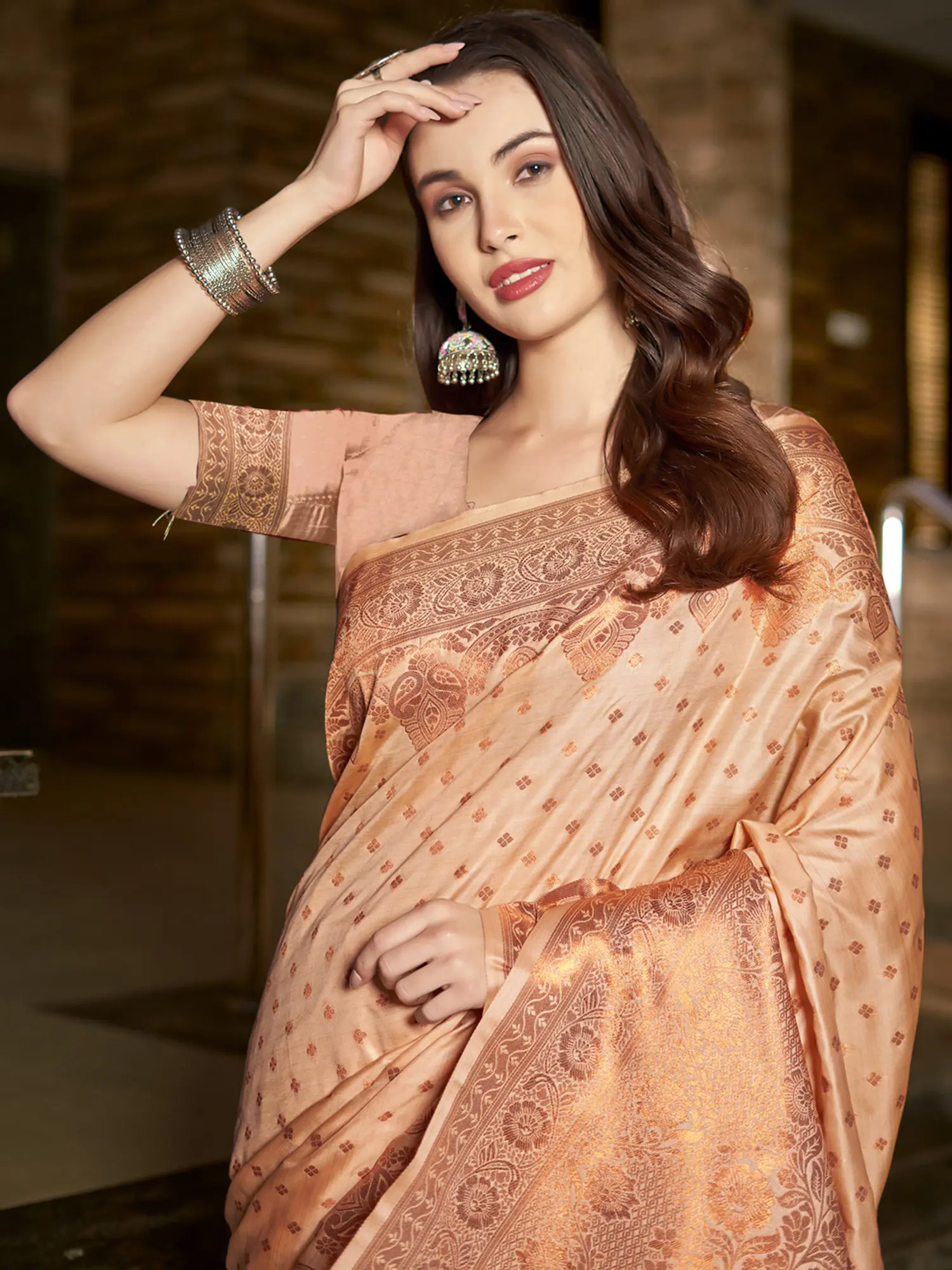 The delicate interplay of color and texture creates a captivating visual experience. The saree's body features intricate woven motifs that dance across the fabric, catching the light with every movement. The wide border is a statement of pure elegance, its rich detailing drawing the eye and framing the saree with graceful precision. The luxurious fabric drapes beautifully, enhancing your natural curves and lending an air of effortless sophistication.