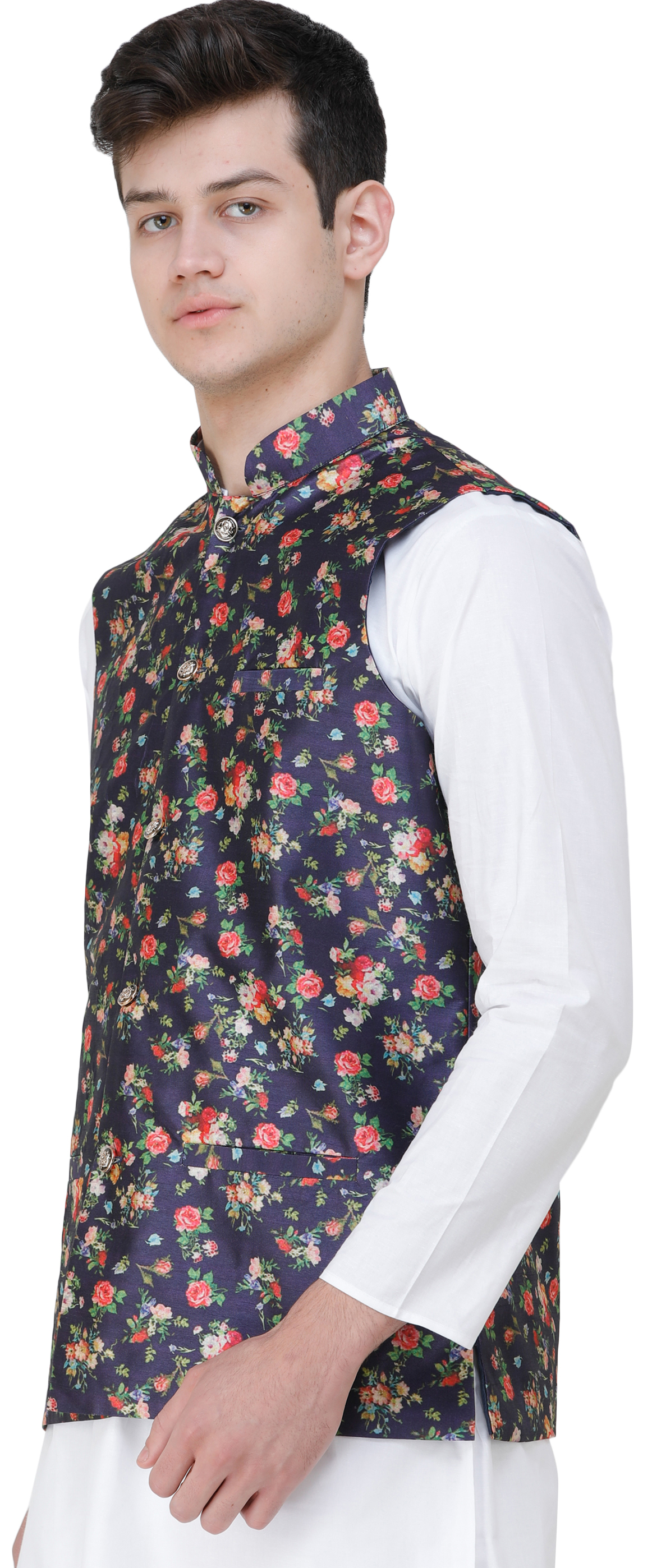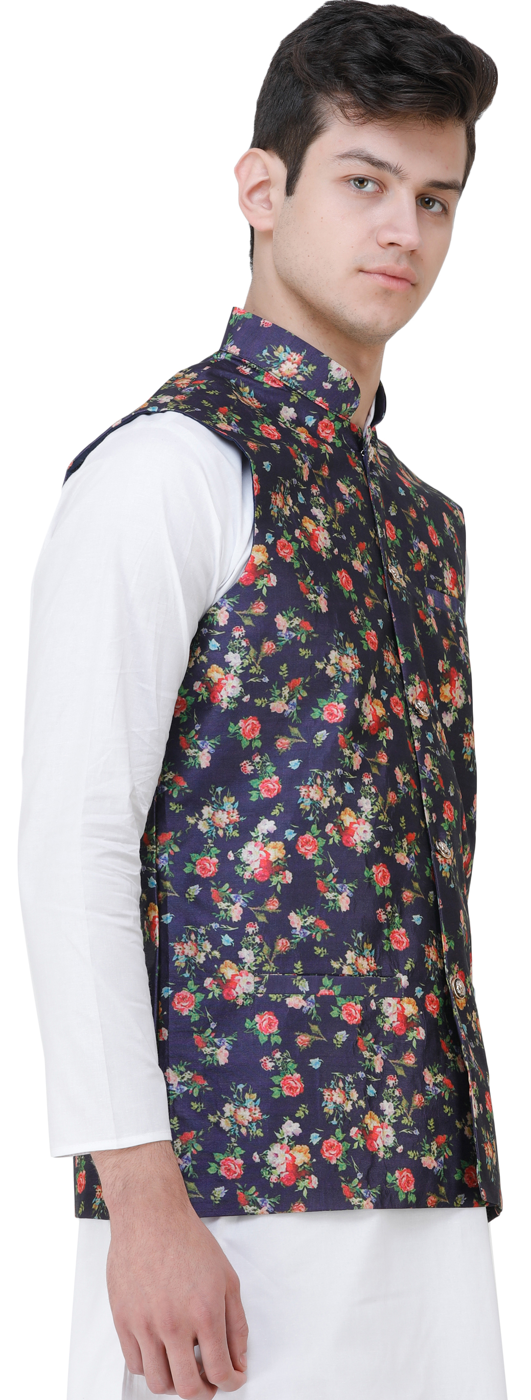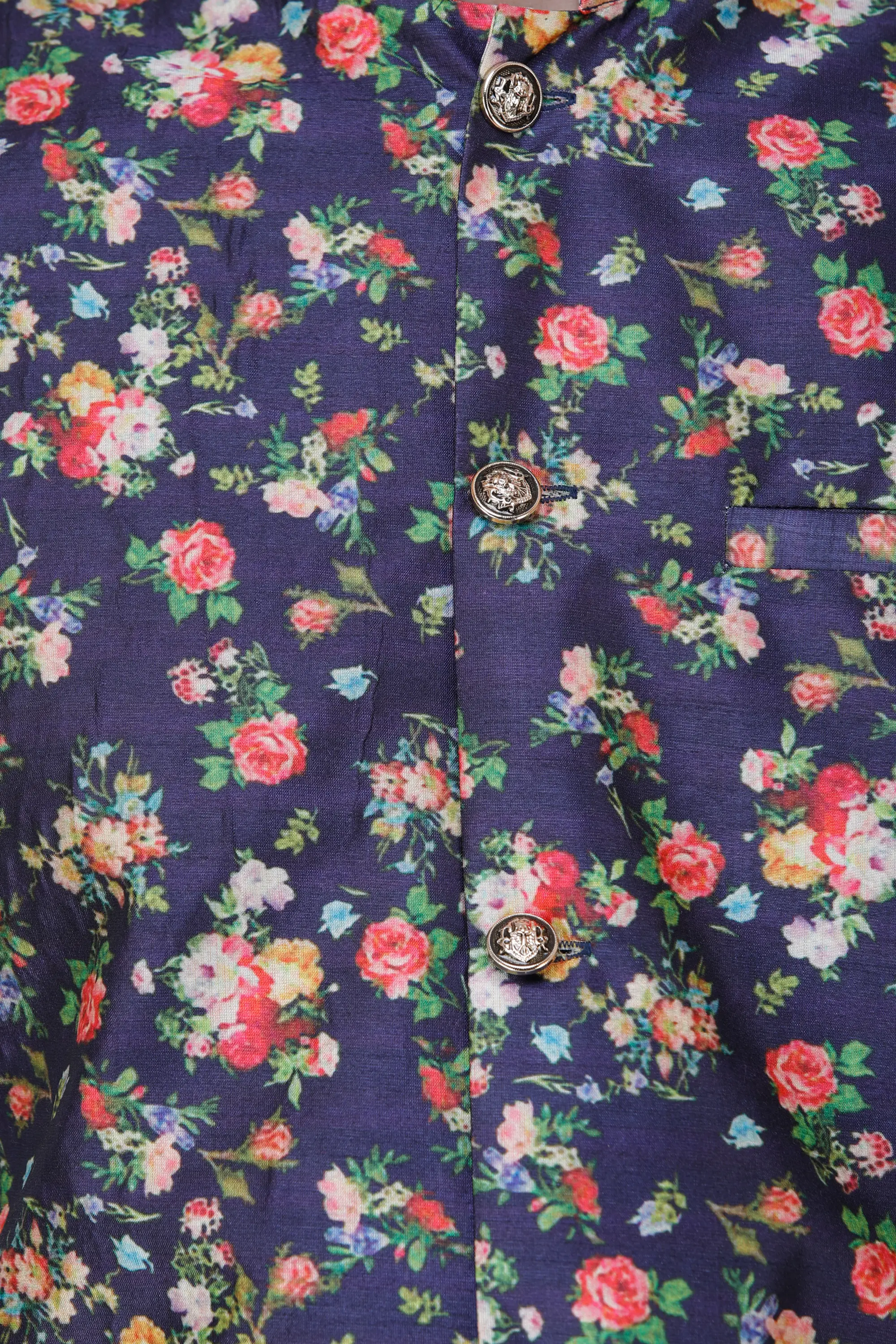 Elevate your wedding attire with this exquisite wedding waistcoat adorned with digitally printed florals all over. The intricate floral patterns as a touch of sophistication and a burst of colors to your ensemble, making it perfect for celebratory occasions. The digital-printed detailing ensures a unique and eye-catching design that sets you apart. Embrace the charm of blooming florals and make a stylish statement at weddings or special events with this beautifully crafted waistcoat.