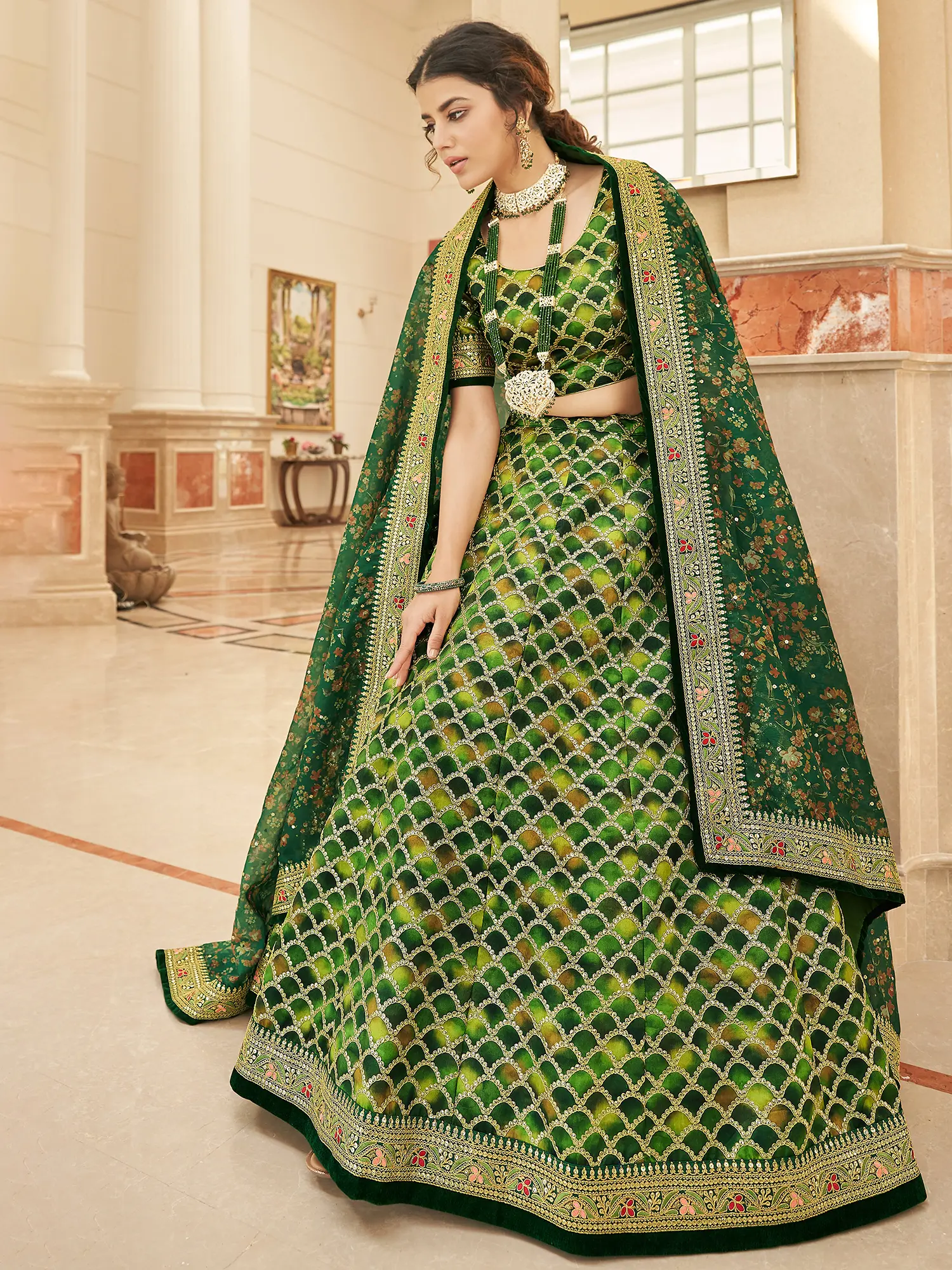 Bottle-Green Net Beads and Golden Thread Embroidery Lehenga Choli with Cutwork Dupatta