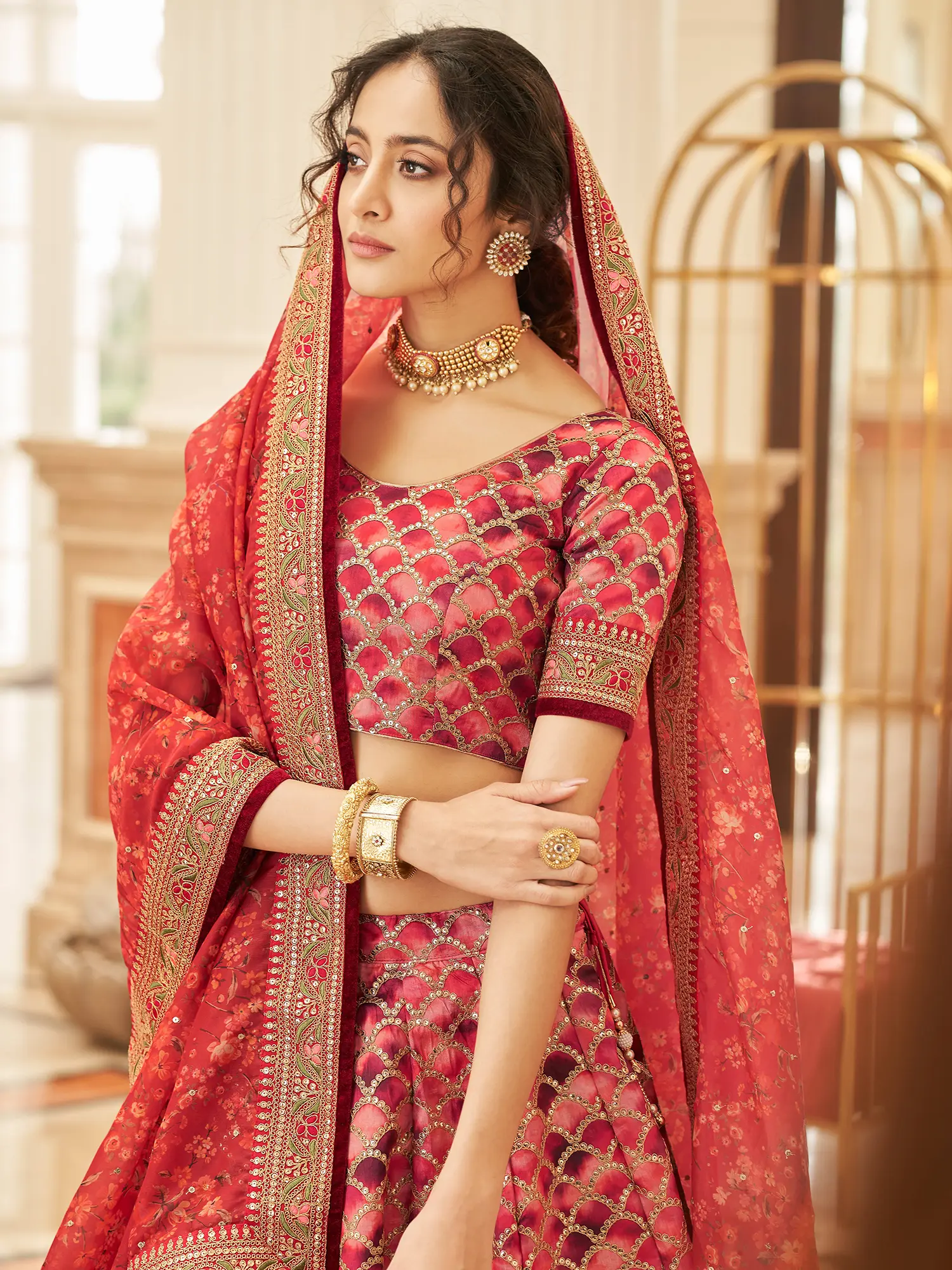 Festive Red Lehenga Choli Set with Sequins & Embroidery on Faux Georgette