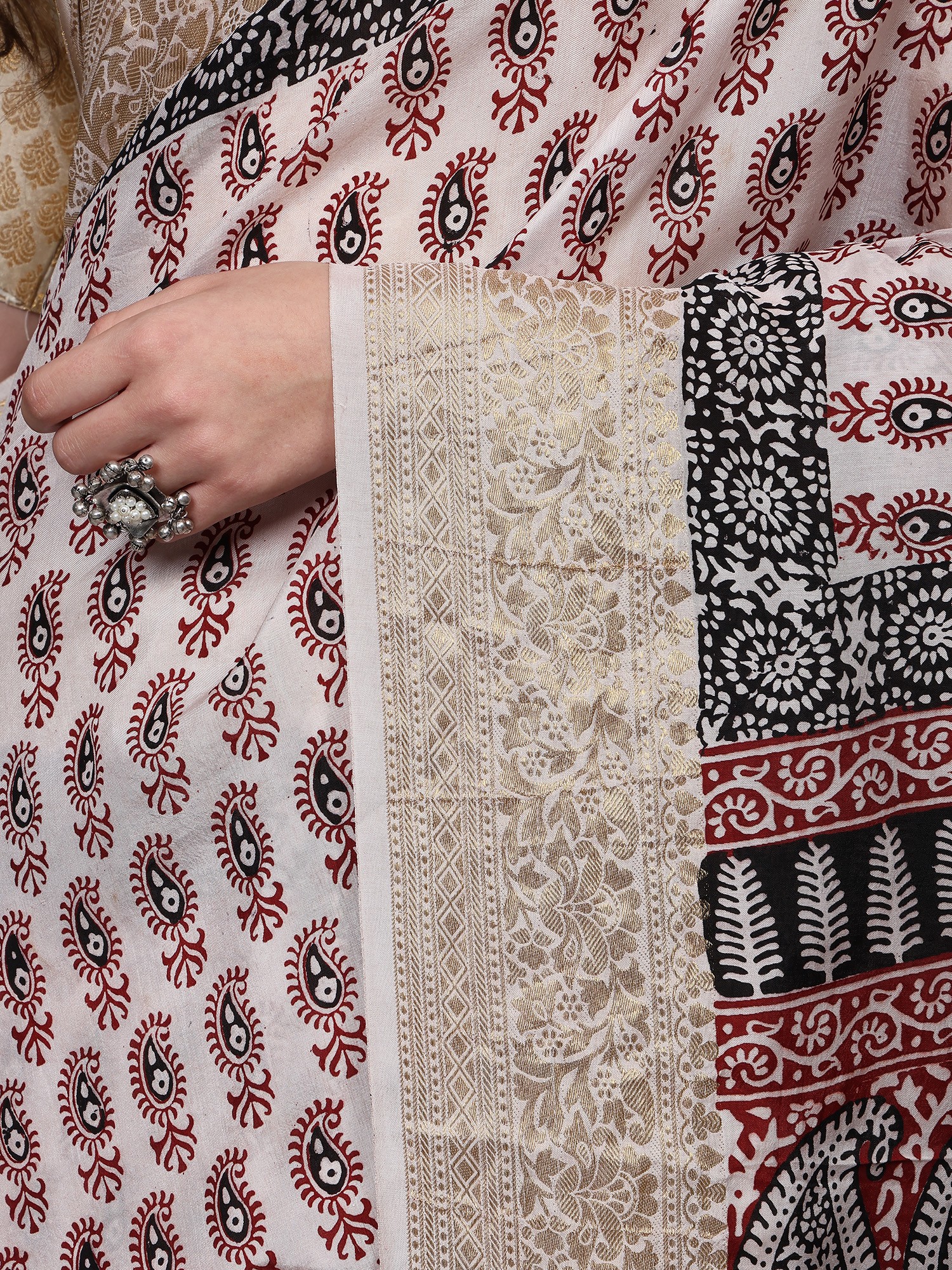 Transparent-Yellow Cotton Saree with Paisley Print and Zari Border from Telangana