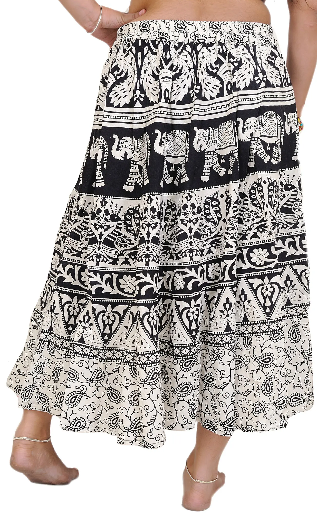 Adorned with mesmerising prints of majestic elephants and vibrant peacocks, this midi skirt signifies a fusion of tradition and modernity, a tribute to the rich cultural tapestry of India. Elevate your wardrobe and embrace the allure of this enchanting midi skirt.
