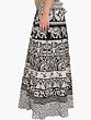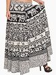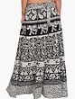 Embrace a touch of bohemian elegance with this exquisite wrap-around skirt, handcrafted in the artisanal hub of Pilkhuwa. The striking monochrome palette of black and white is elevated by a captivating print, featuring a delightful arrangement of majestic elephants and graceful peacocks, interspersed with intricate floral motifs and geometric patterns. This skirt is more than just a garment; it's a wearable piece of art that tells a story of heritage and tradition.