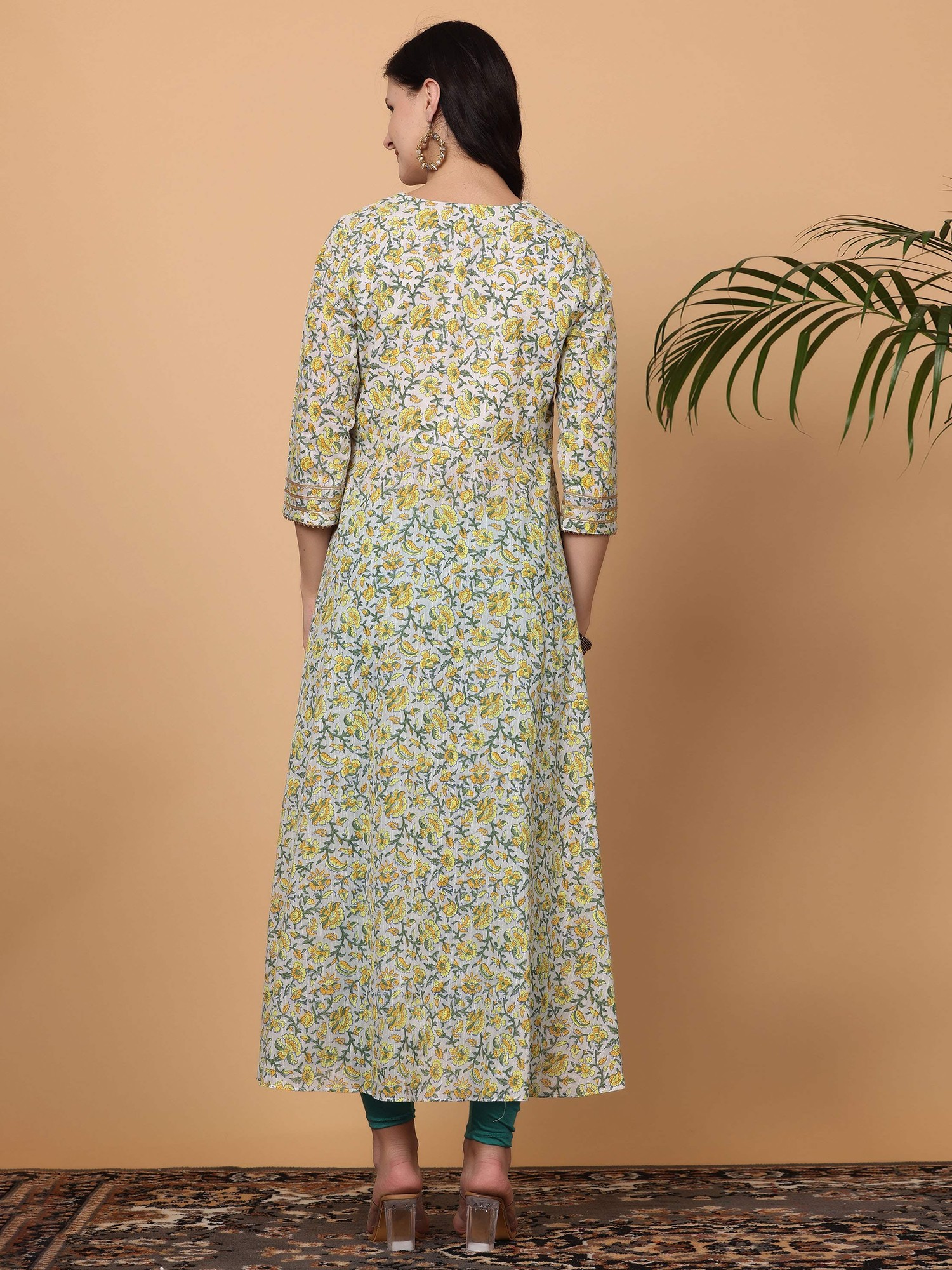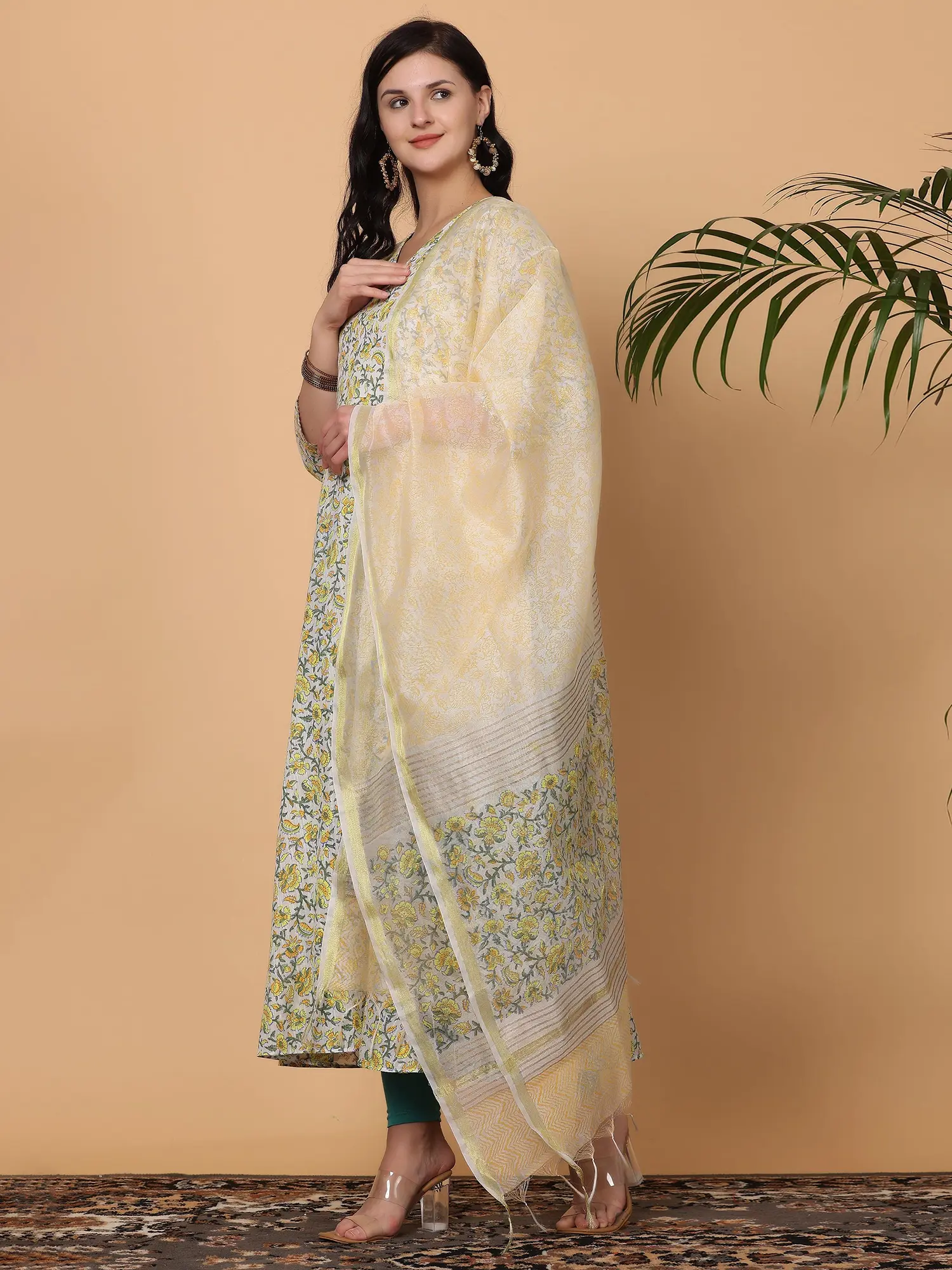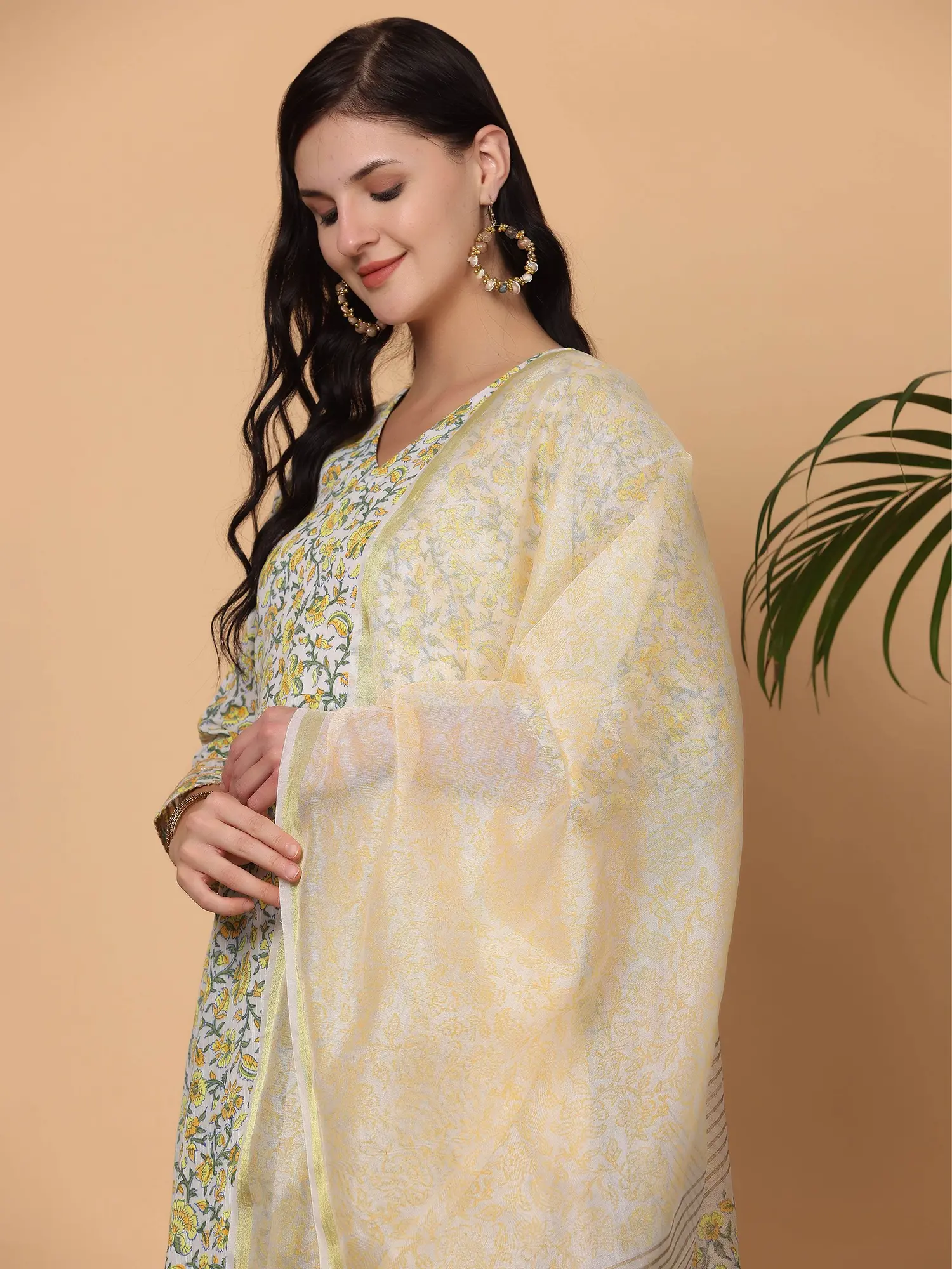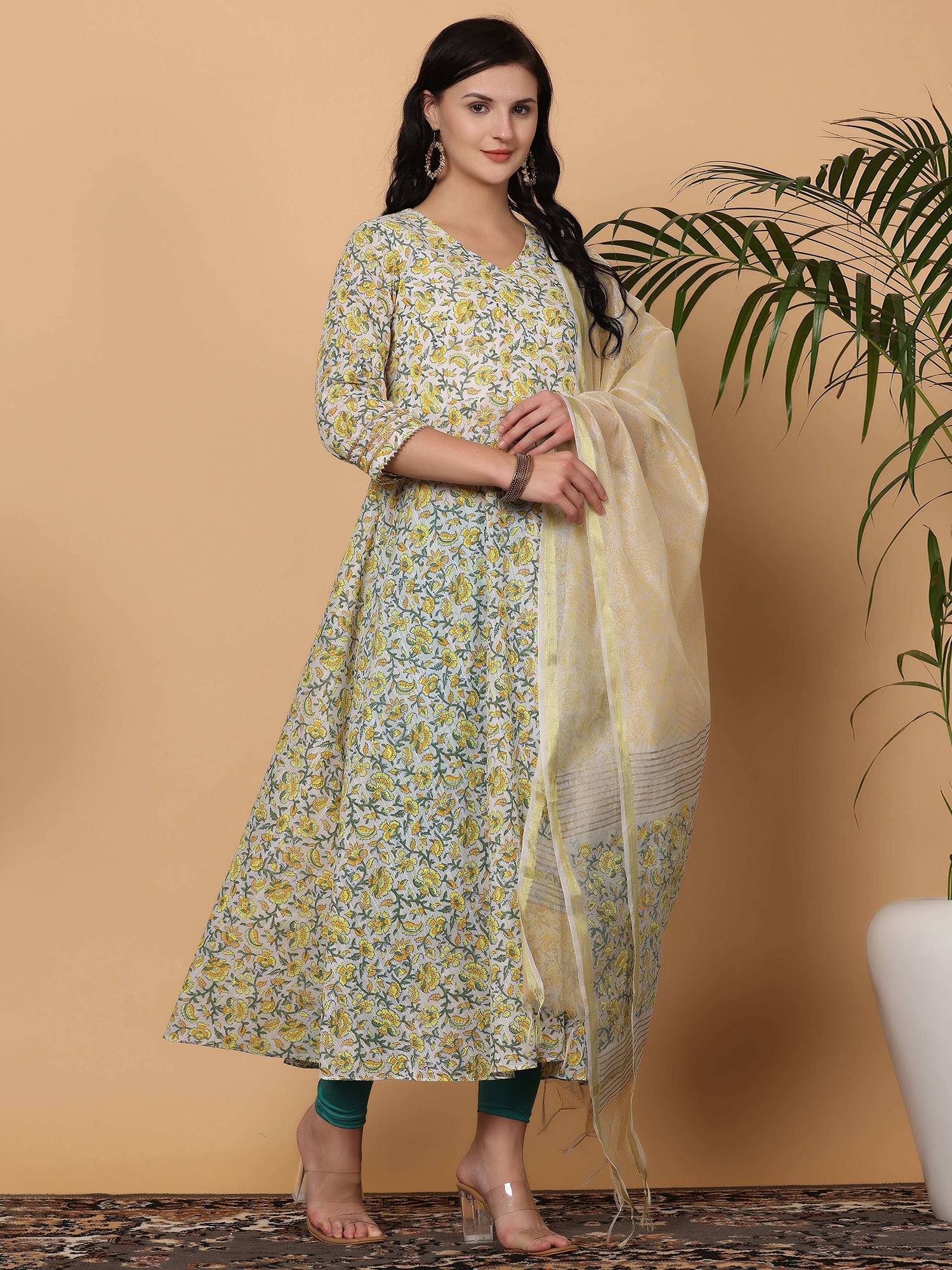 White Block Print Cotton Anarkali Suit With Lycra Bottom And Chanderi Dupatta For Women