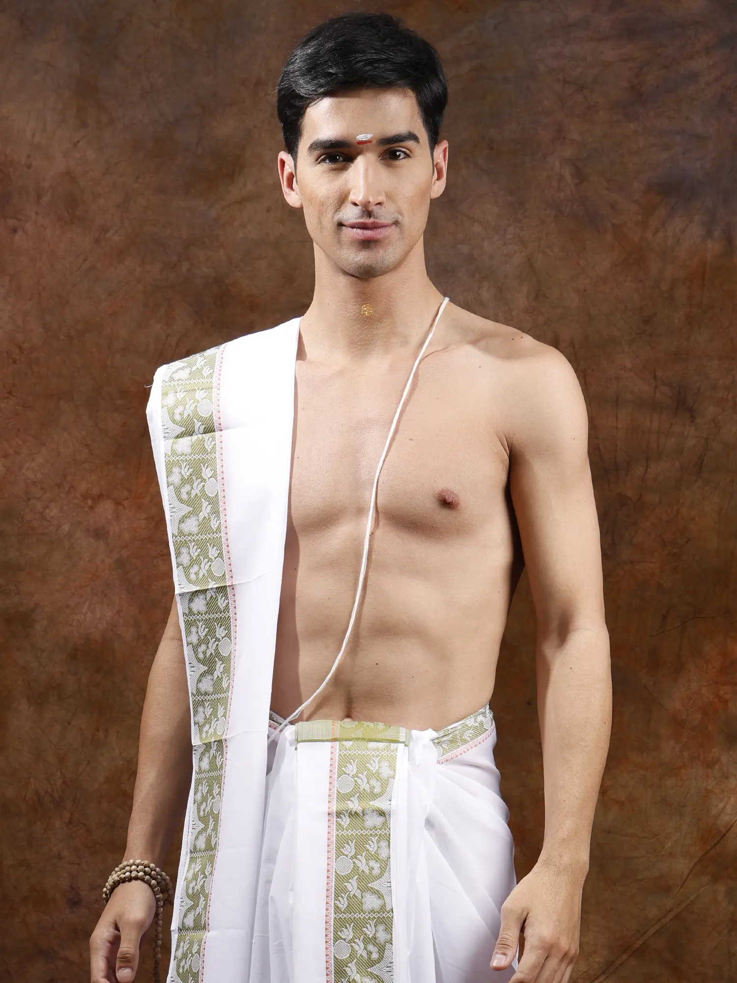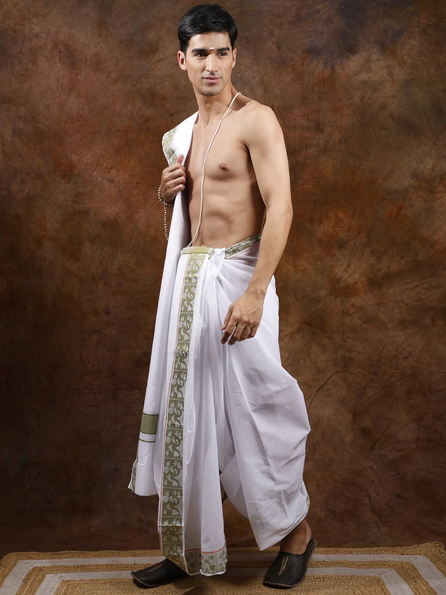 The dhoti features a generous length and width, promising a comfortable and graceful drape. What truly sets this set apart is the stunning woven border, accented with a subtle olive hue. The delicate pattern, featuring stylized birds, adds a touch of artistry and natural beauty to the traditional design. This detailed embroidery is a testament to skilled craftsmanship, transforming a classic garment into a piece of wearable art. The angavastram, a traditional shoulder cloth, complements the dhoti perfectly, echoing the same refined aesthetic and woven border.