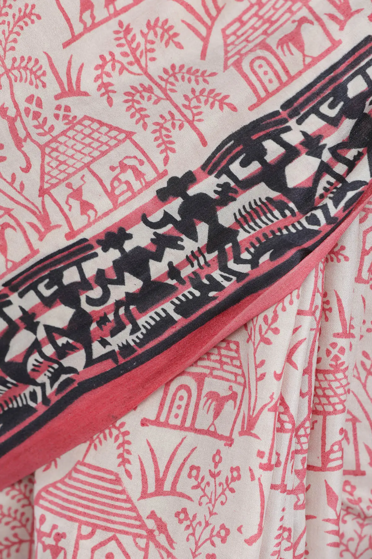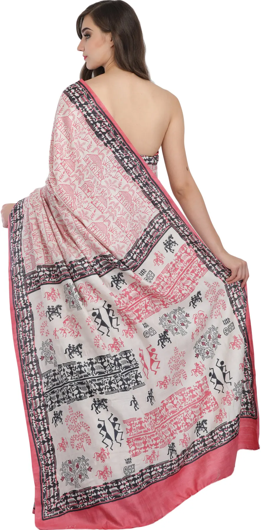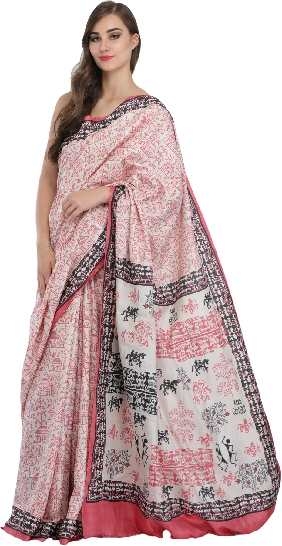 Kalamkari Saree from Telangana with Printed Warli Folk Art Motifs and Peacock-Elephant on Anchal