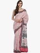 Woven from pure cotton, this sari promises exceptional comfort and breathability, making it an ideal choice for both casual gatherings and more formal occasions. The soft texture of the cotton drapes beautifully, offering a graceful silhouette. The vibrant yet soothing pink print against the pristine white base creates a visually appealing contrast, making you stand out with effortless elegance. The traditional border, rendered in black and pink, adds a classic touch and frames the intricate artwork with finesse.
