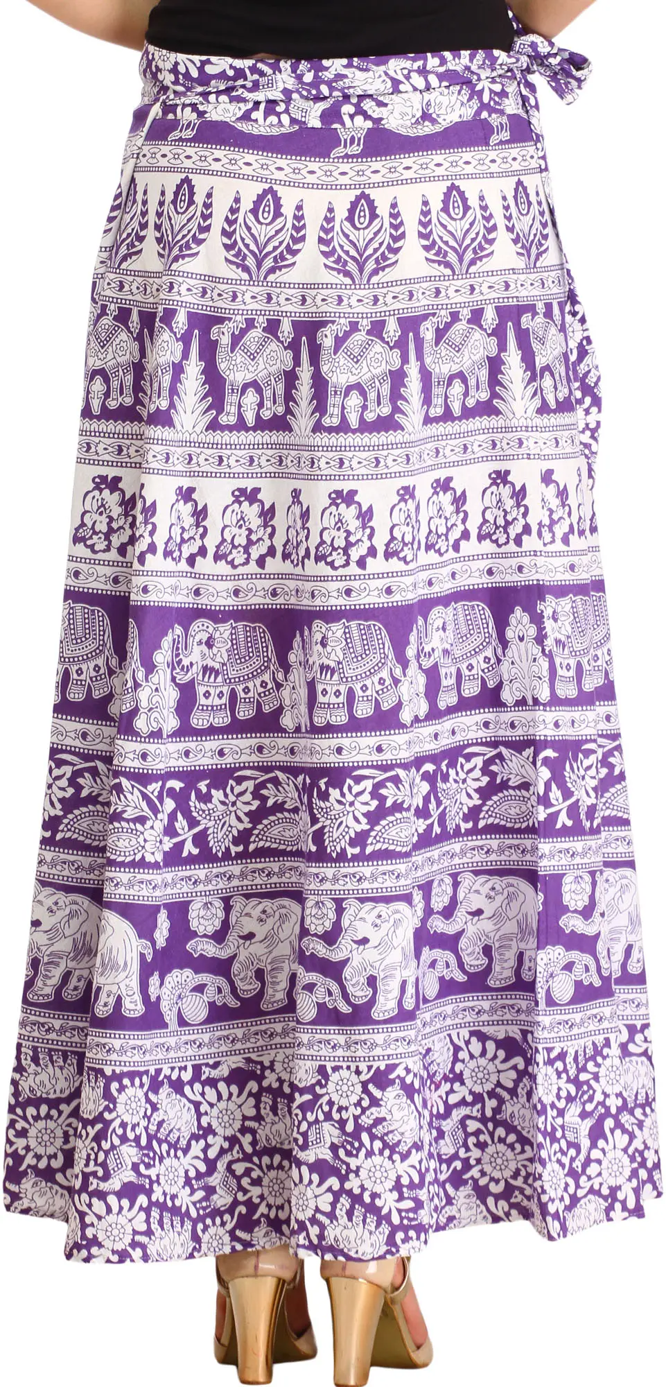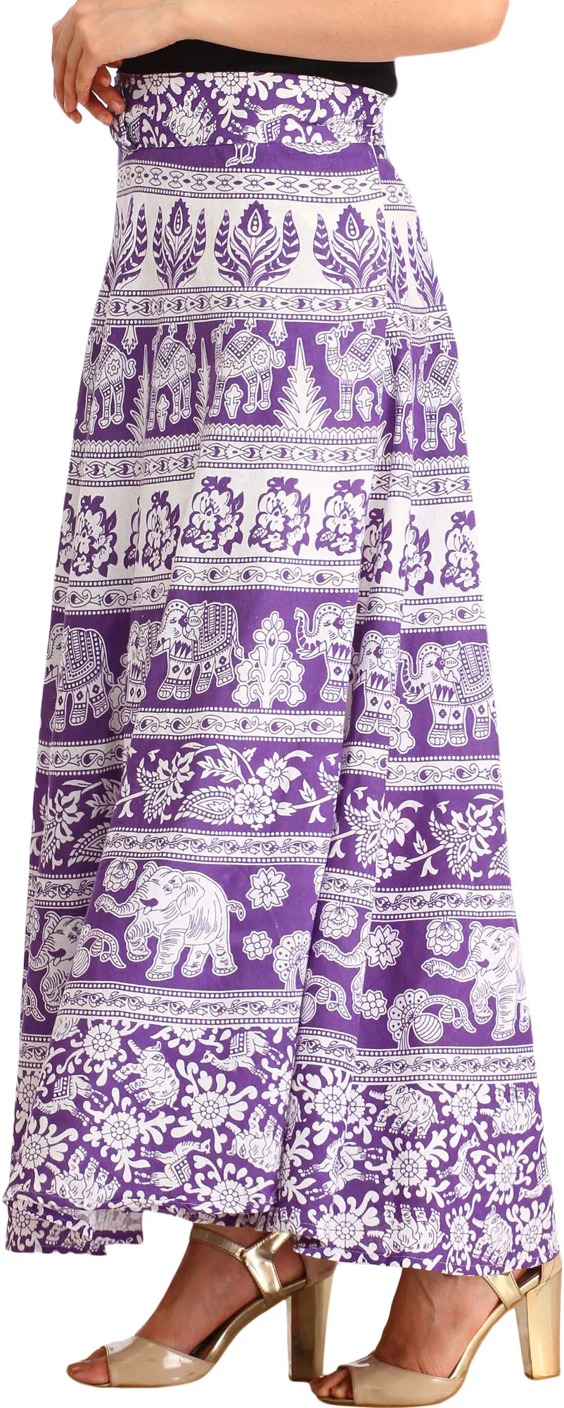 Comfort and cultural richness come together in this Pilkhuwa wrap-around long skirt in white and purple, with charming prints of camels and elephants. The wrap-around shape guarantees a varied fit, making it appropriate for a variety of body types. This skirt is perfect for casual excursions or celebratory celebrations, and it honours craftsmanship and vibrant artistry.