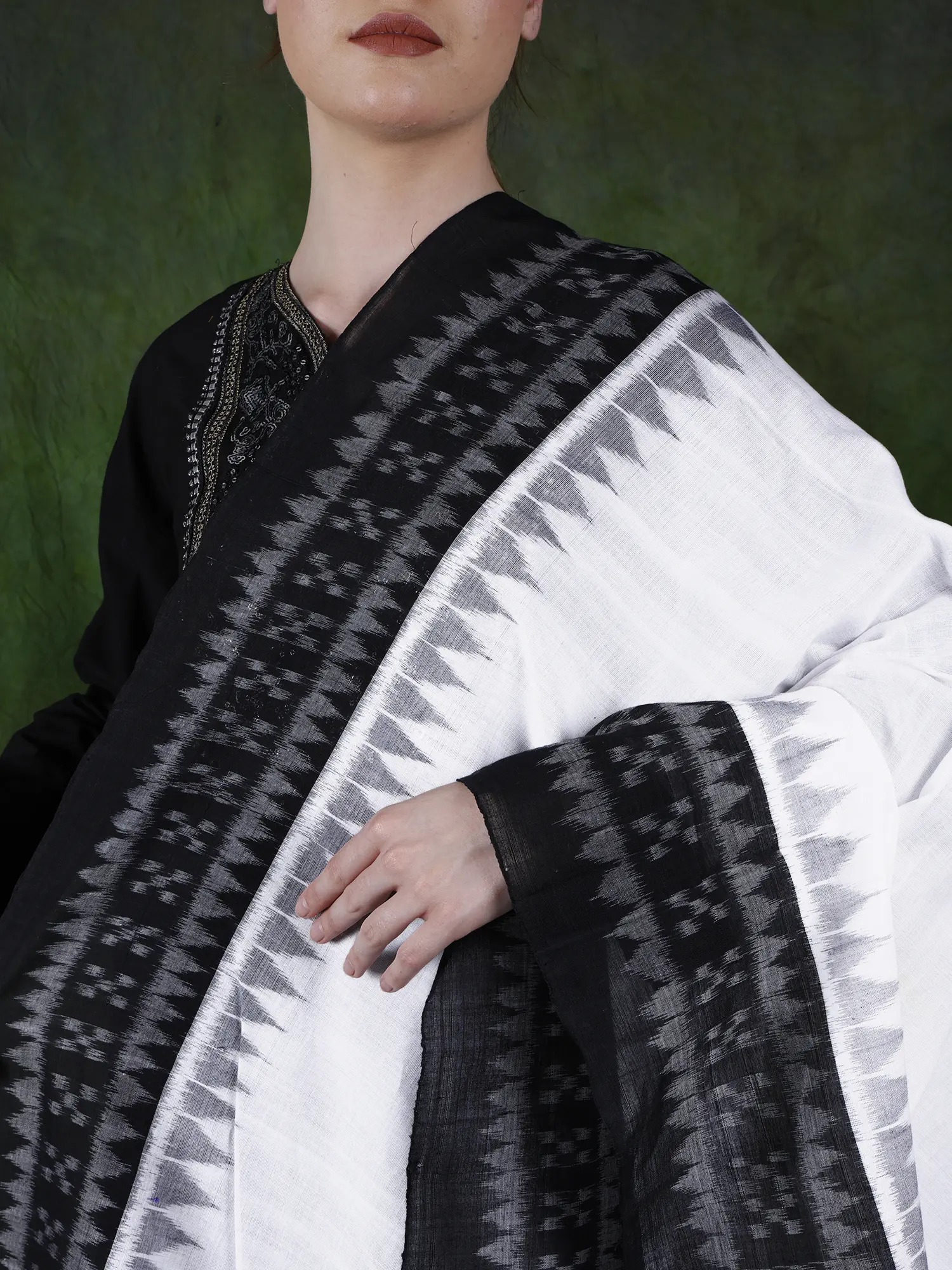 An elegant selection of colors- white and black blending in a lovely grey, this pure cotton Ikat dupatta is a modern scarf woven with a traditional technique.