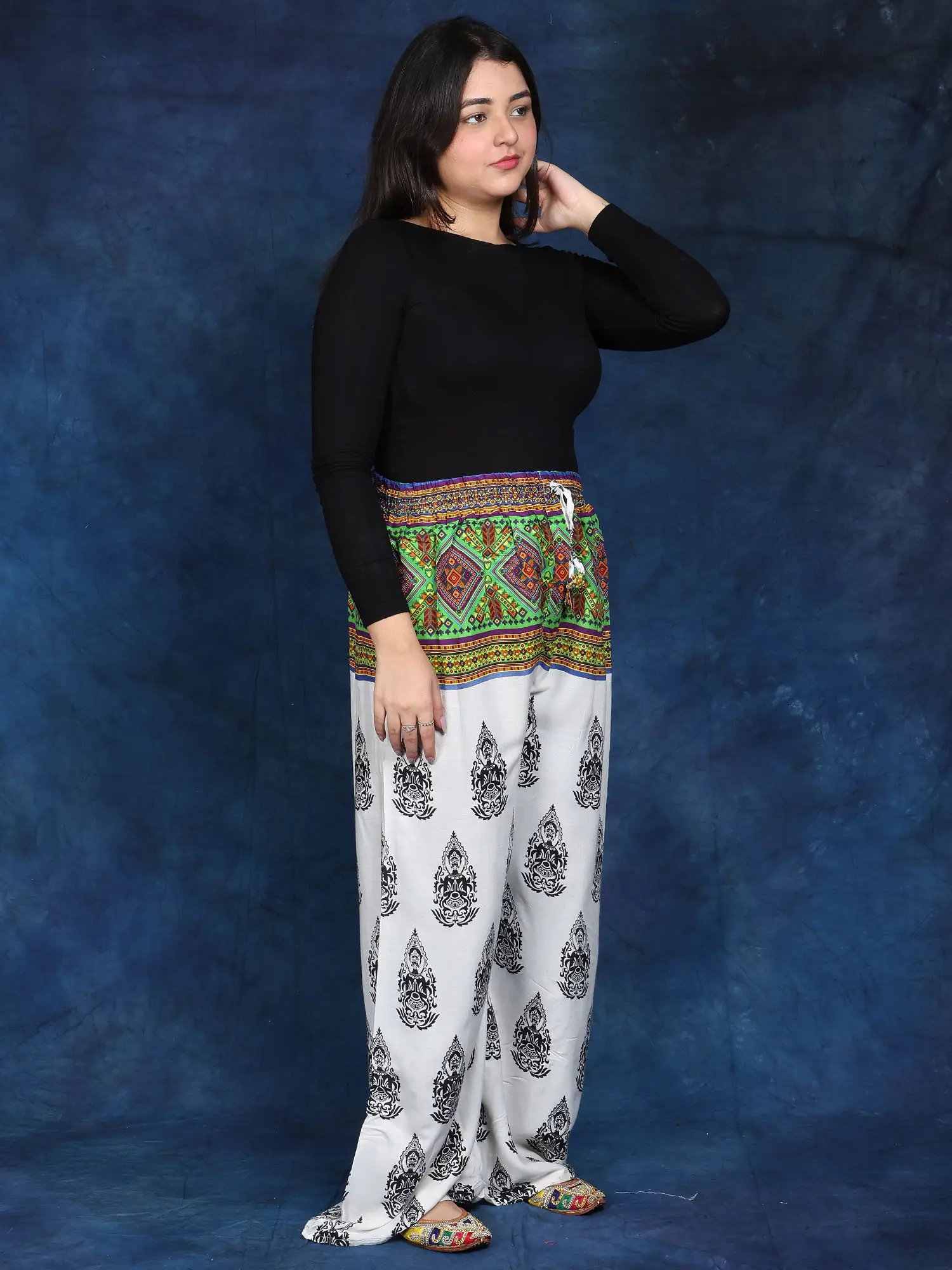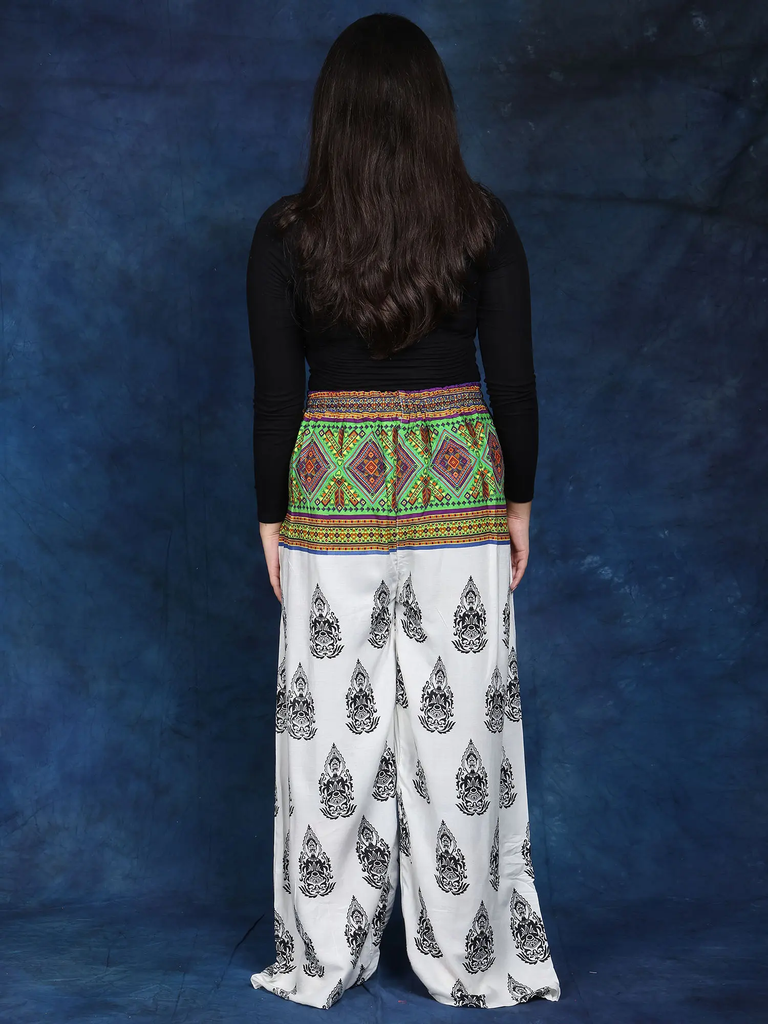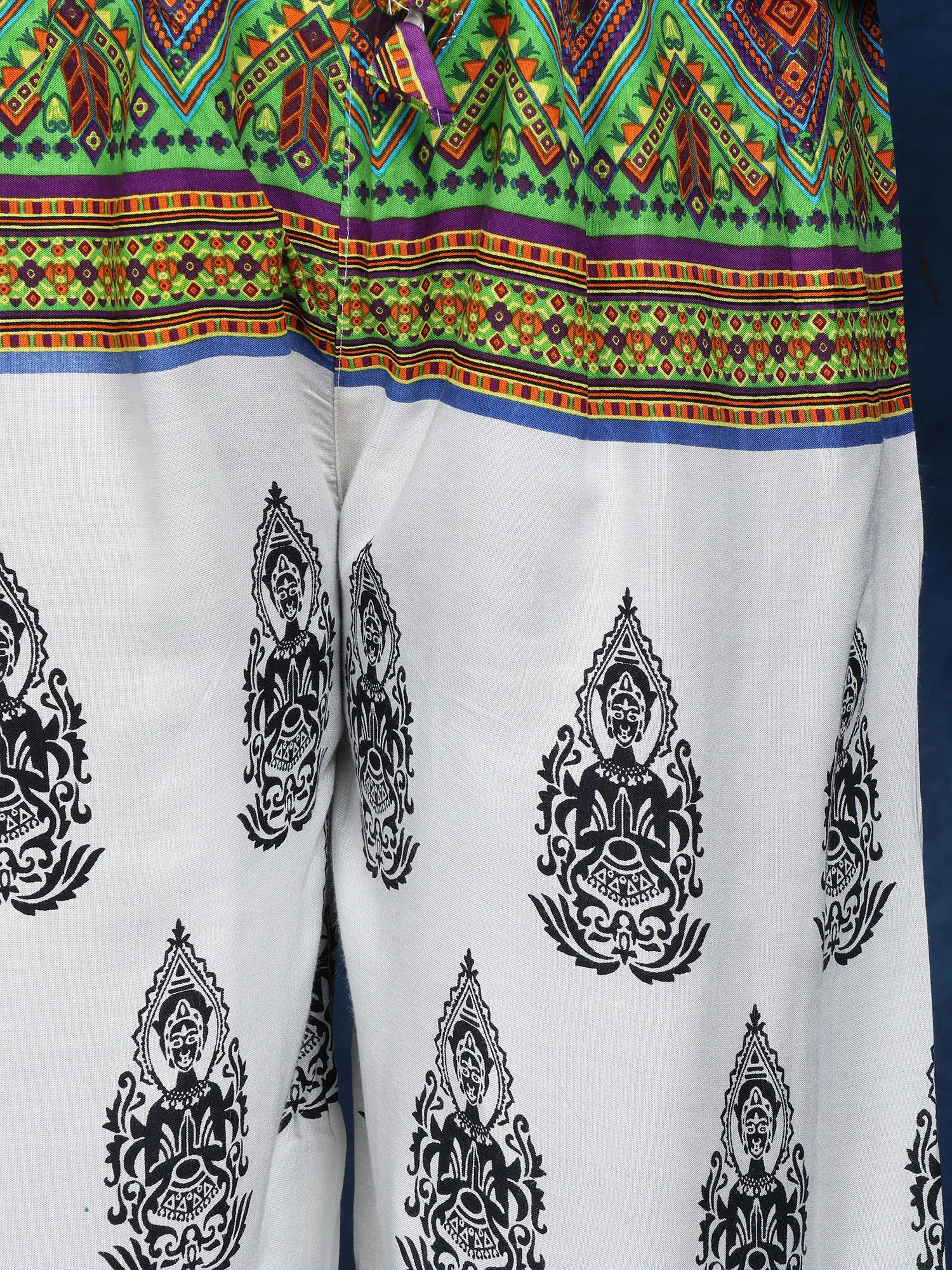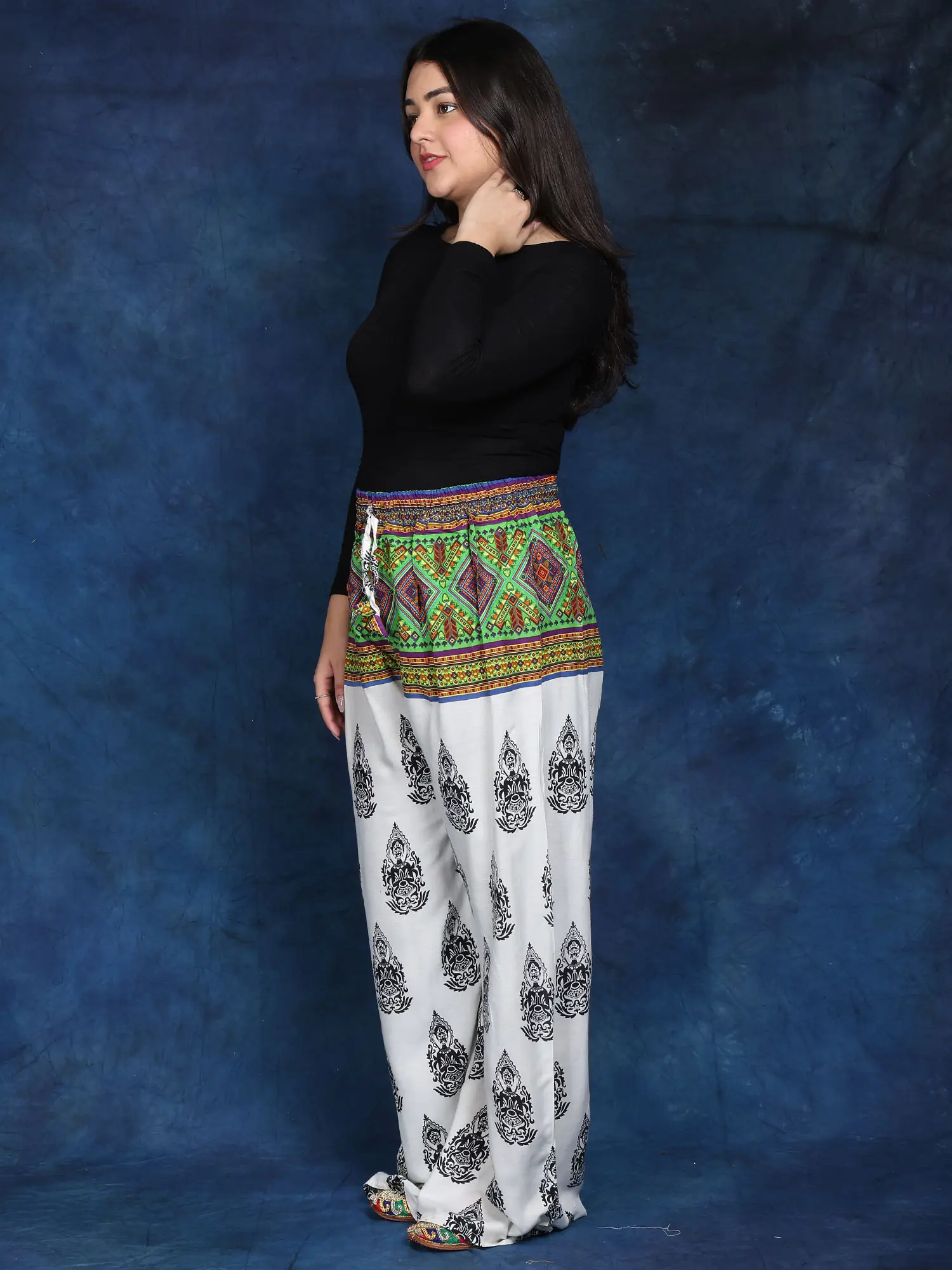 This “White Bohemian Yoga Trouser,” which features the serene visage of Gautam Buddha, is a work of art that tells narratives of serenity with every sway. Its “RAYON” construction gives it a supple, flowing quality that echoes the integration of body, mind, and spirit that is central to yoga.