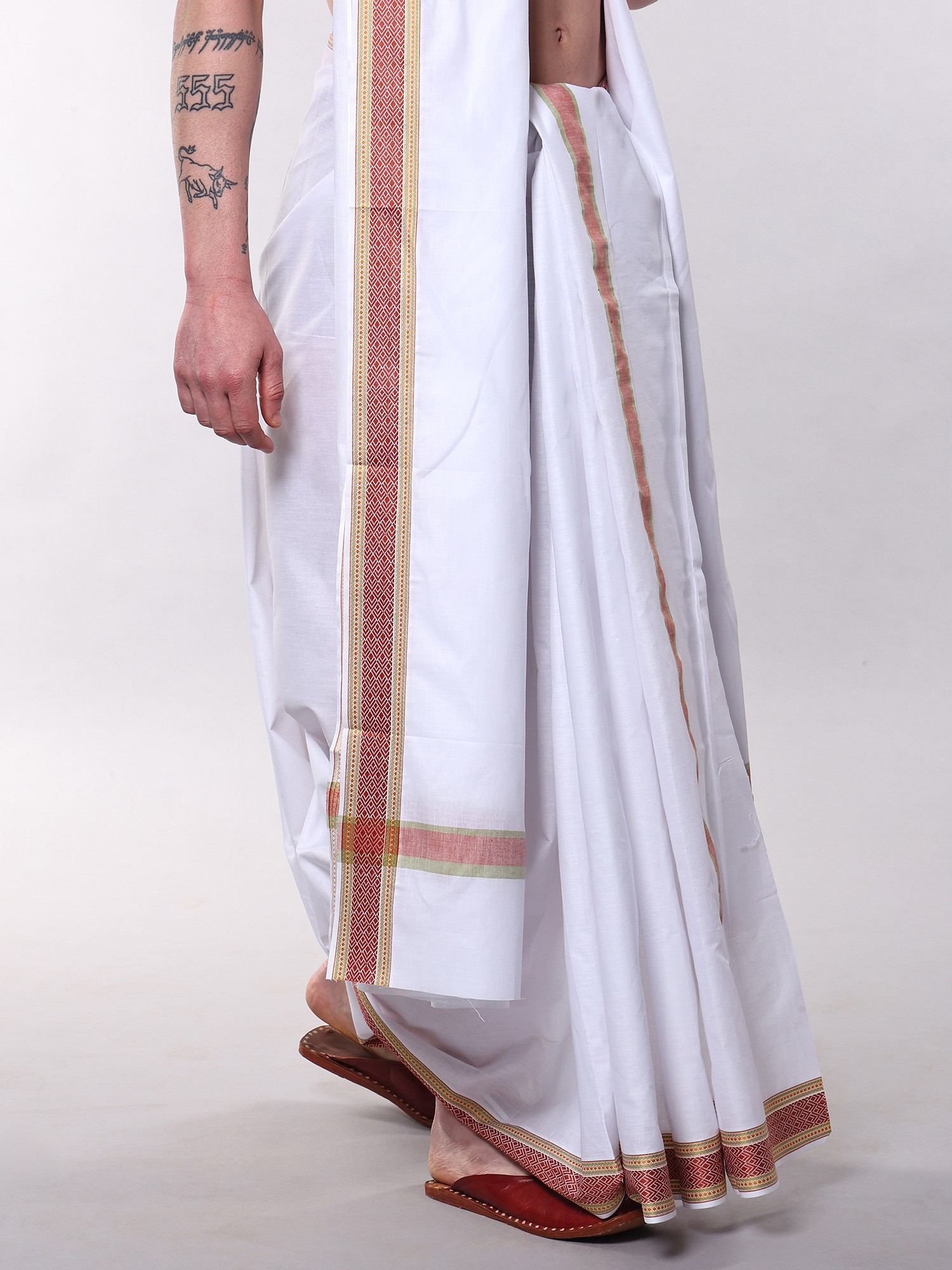 Each piece is meticulously fashioned from the finest, pure cotton, ensuring a soft touch and breathable comfort against your skin. The dhoti, generously sized at 170 inches in length and 50 inches in width, drapes effortlessly, while the complementary angavastram, measuring 118 inches by 50 inches, adds a layer of graceful sophistication. The defining feature is the exquisite multi-thread woven border, painstakingly applied by skilled artisans, showcasing intricate patterns that speak of time-honored craftsmanship and attention to detail.