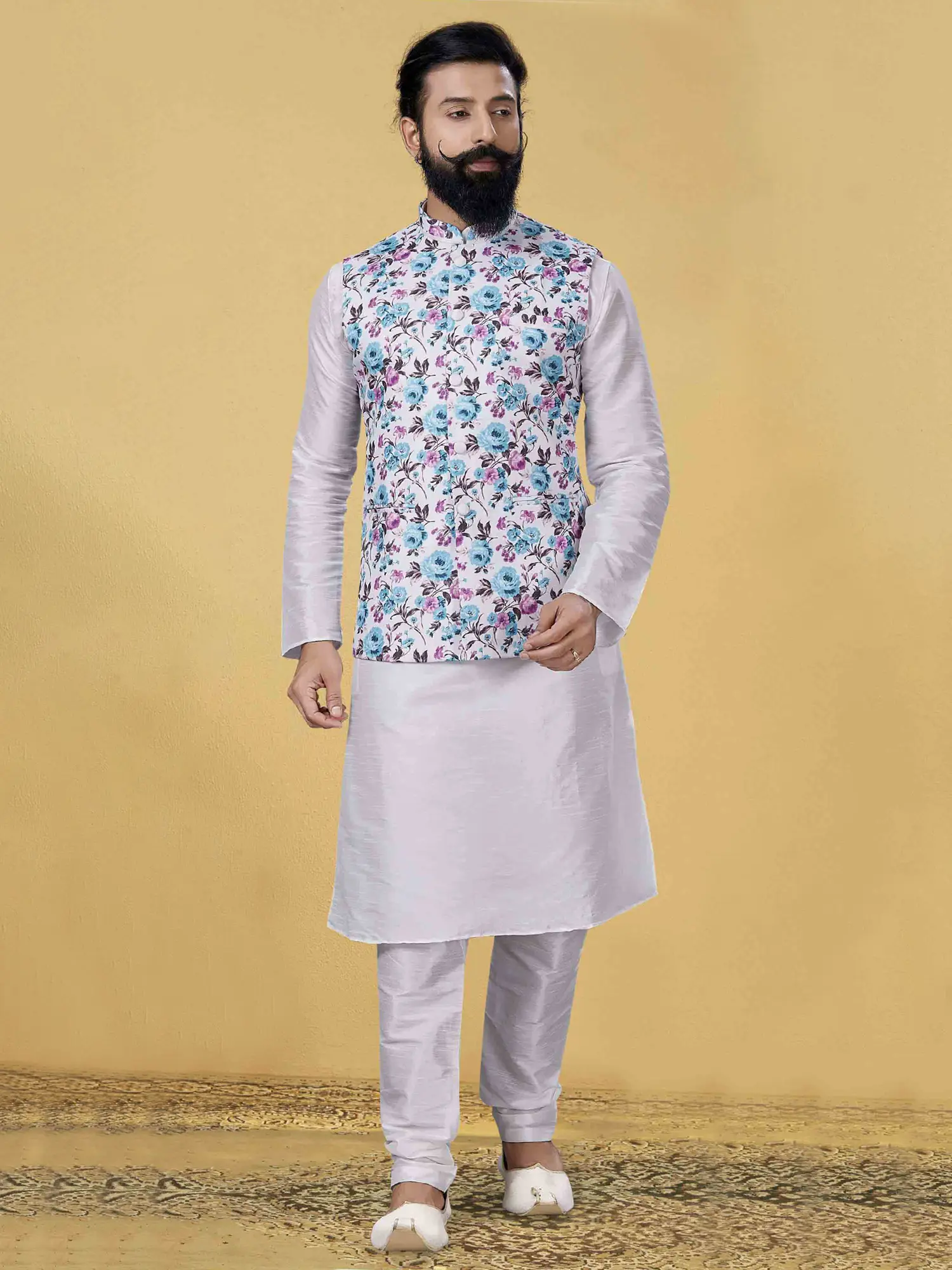 Crystal-Rose Art Silk Ethnic Nehru Jacket Waistcoat with Multicolor Floral Silk Embroidery and Sequin Work