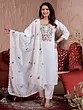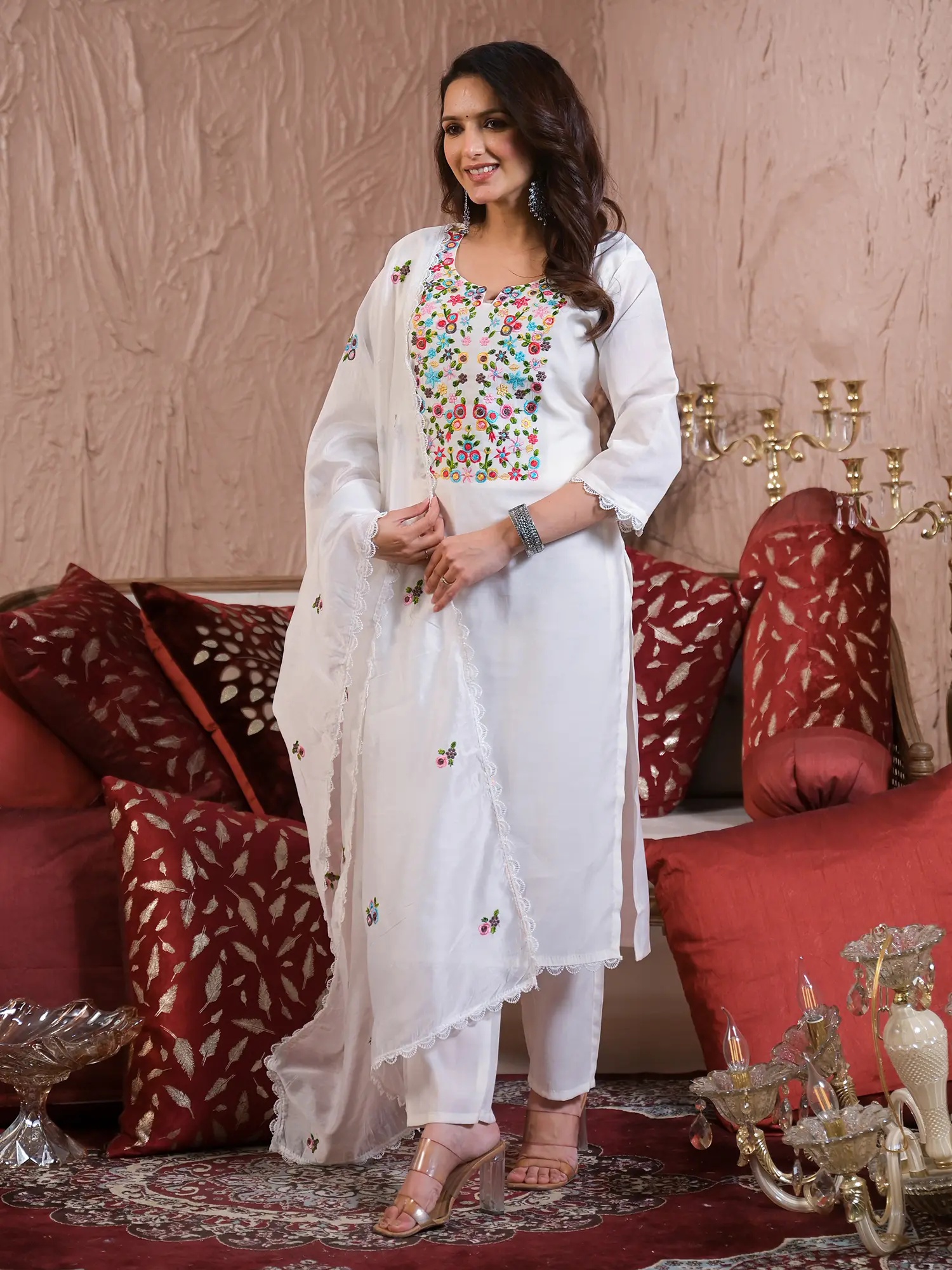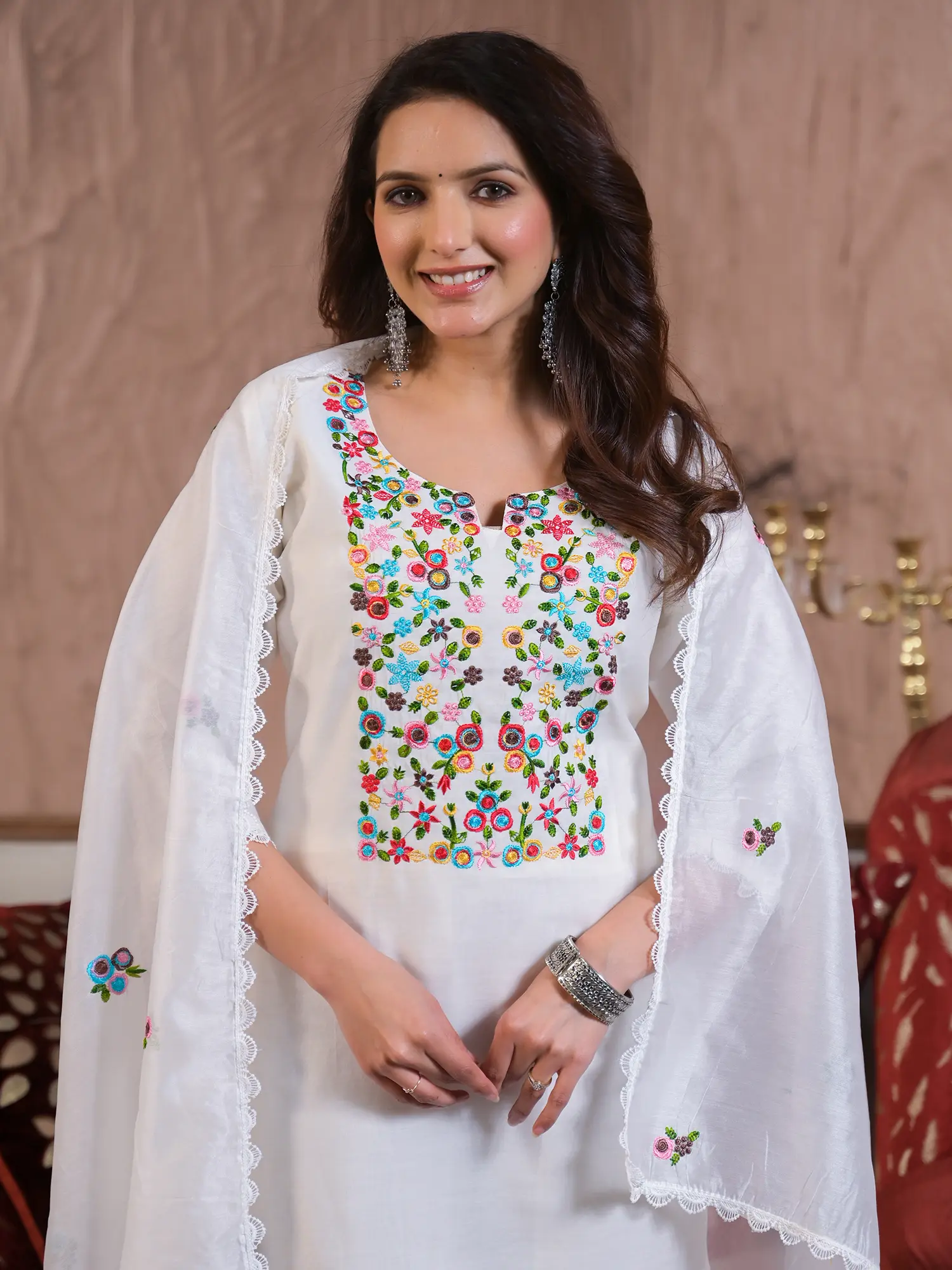 White Floral Embroidered Elegant Festive Wear Chanderi Silk Kurta Set With Matching Dupatta