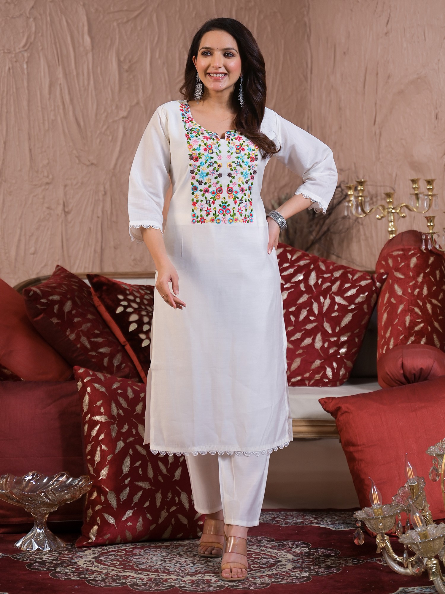 White Viscose Chanderi Embroidery Work Festive Wear Kurta Set With Dupatta