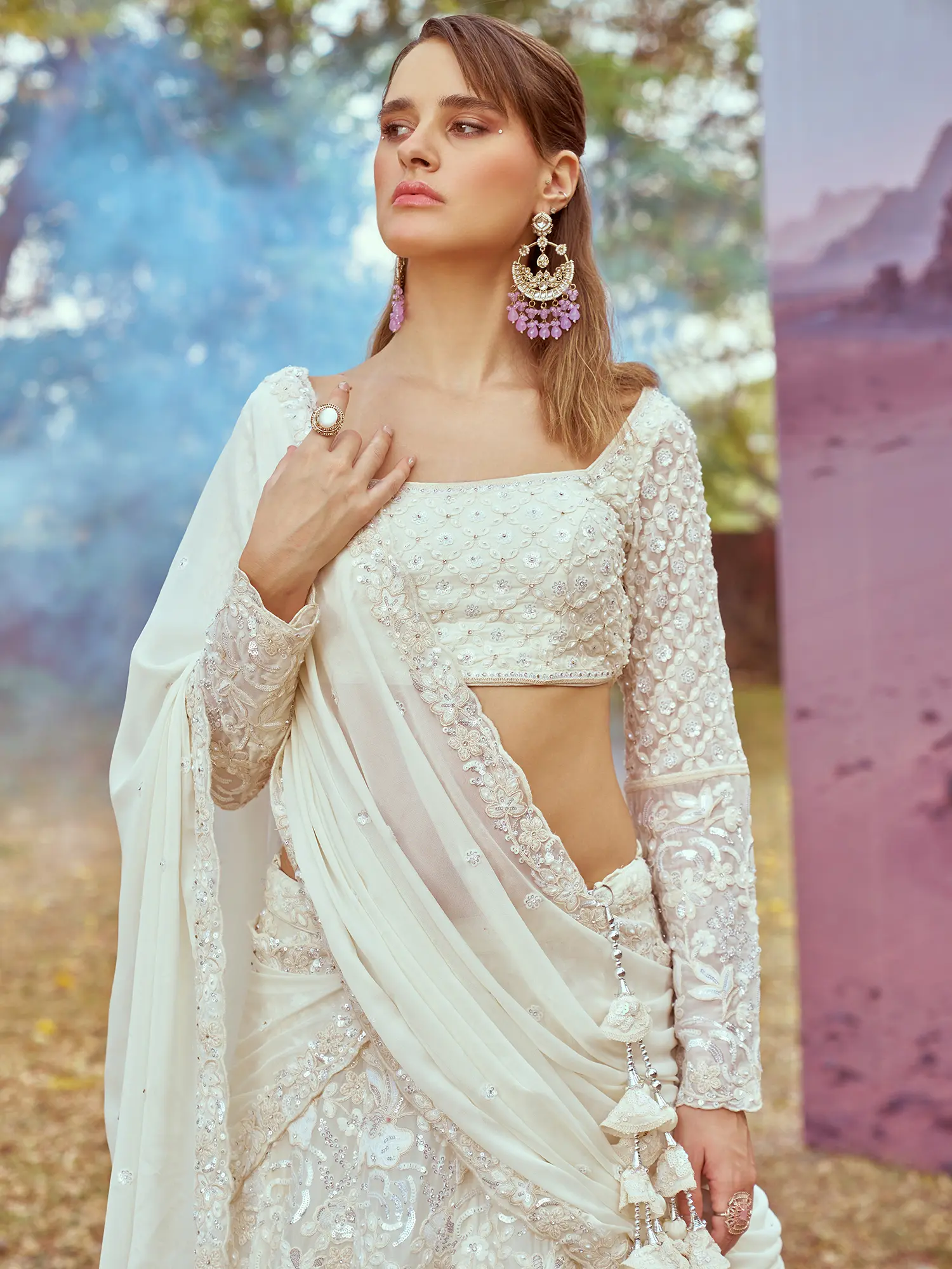 Features intricate bead embroidery on a white georgette fabric for a luxurious feel.