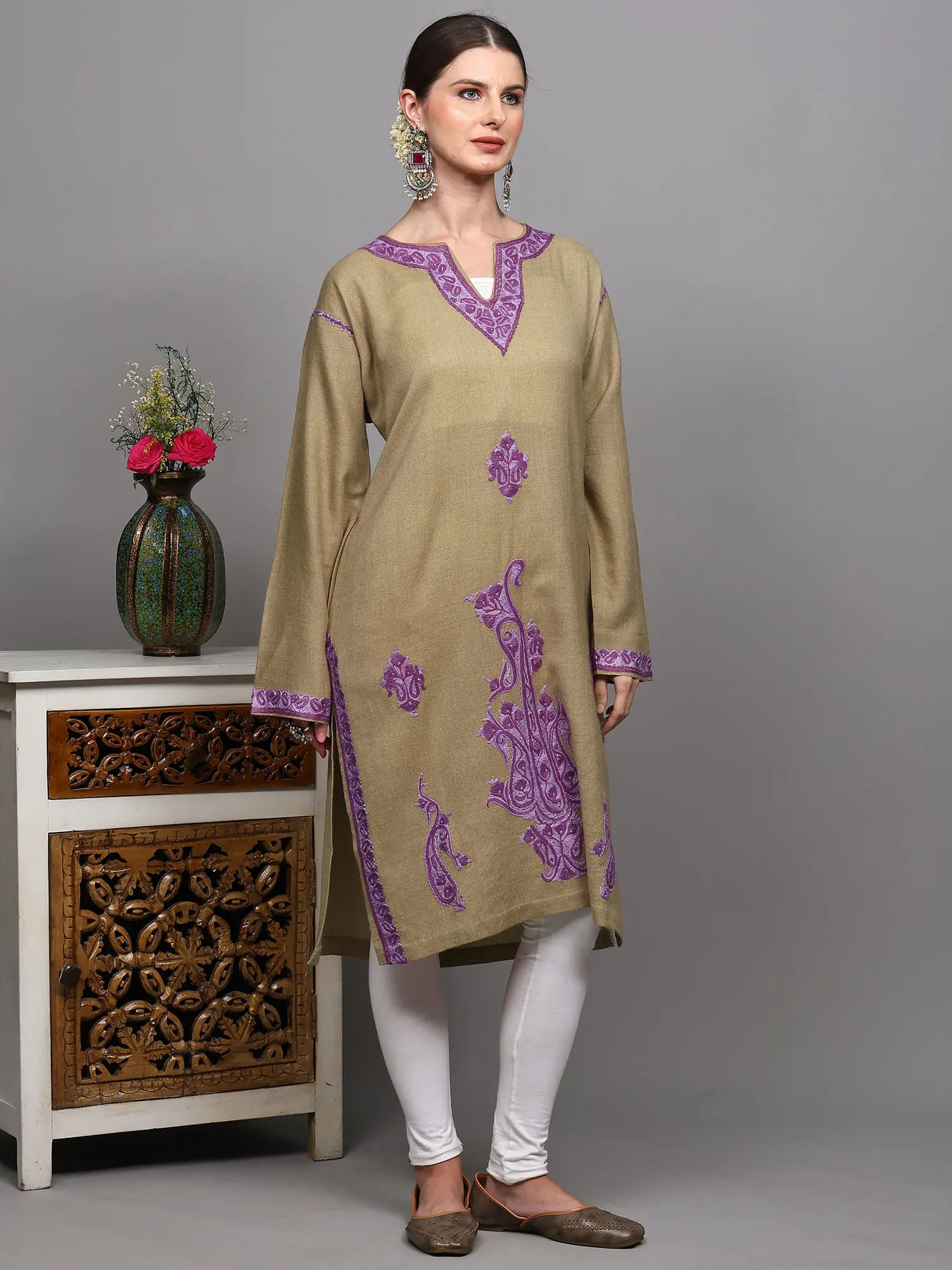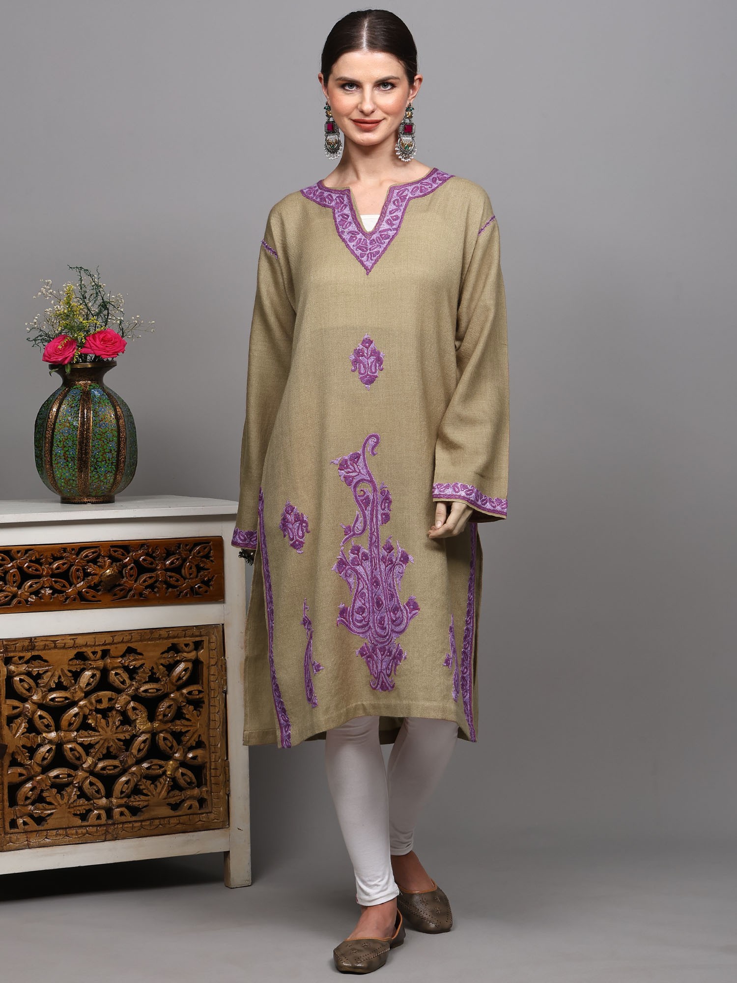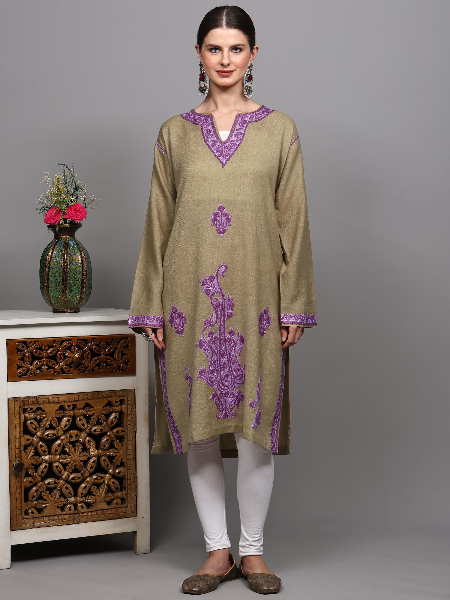 Kashmiri Phiran with Chain Stitch Embroidered Flowers in Multicolor Thread and Side Pockets