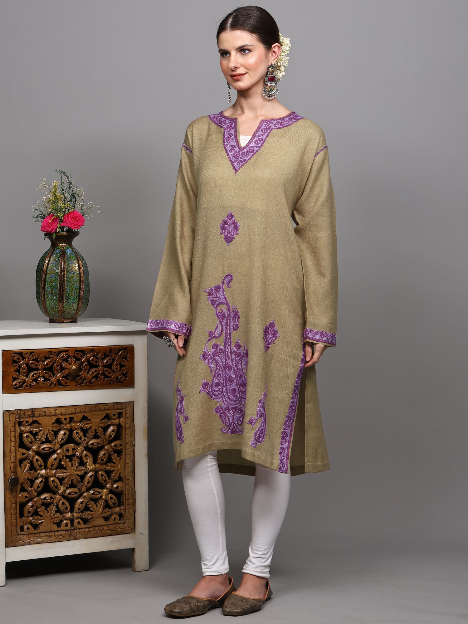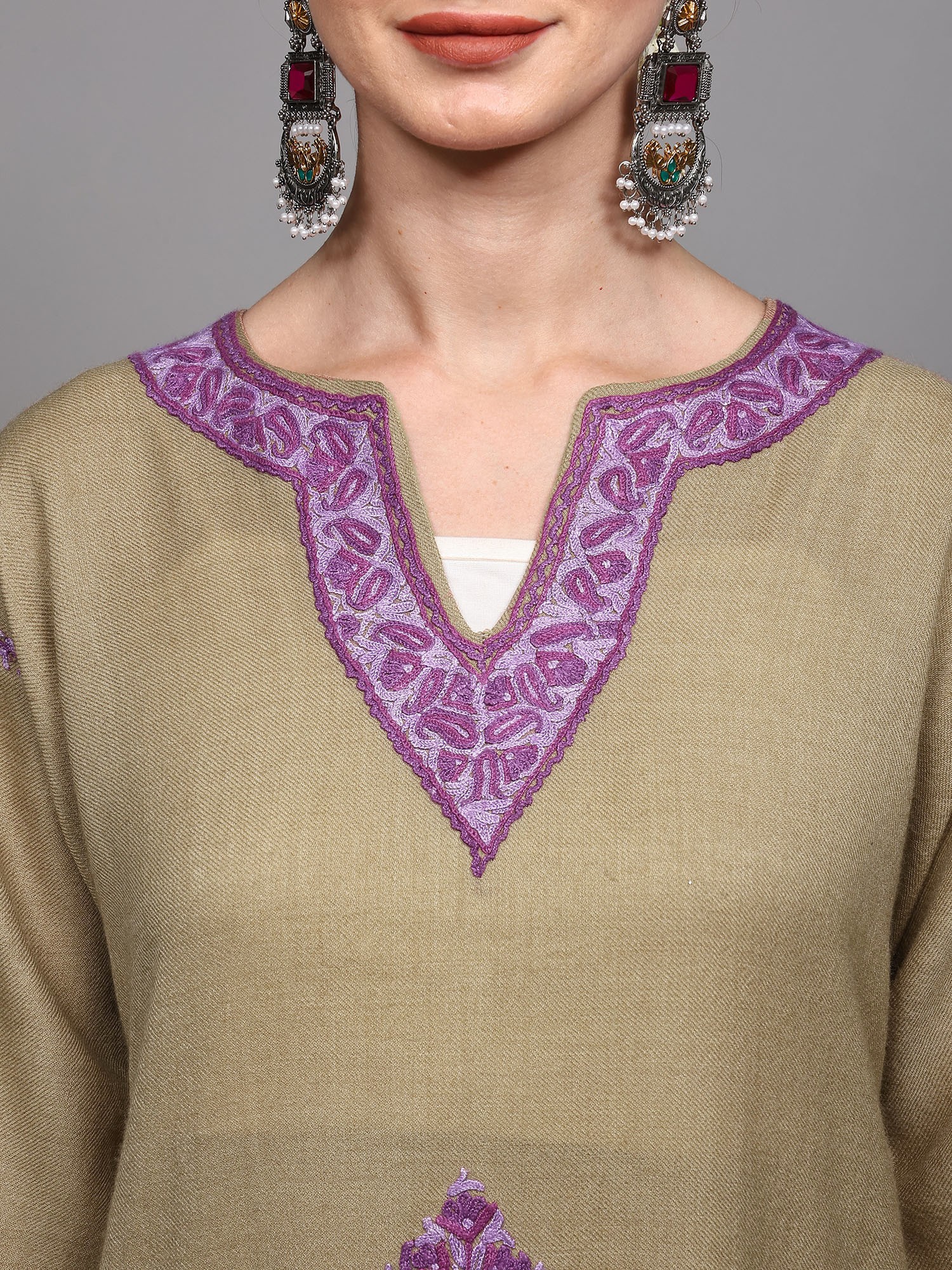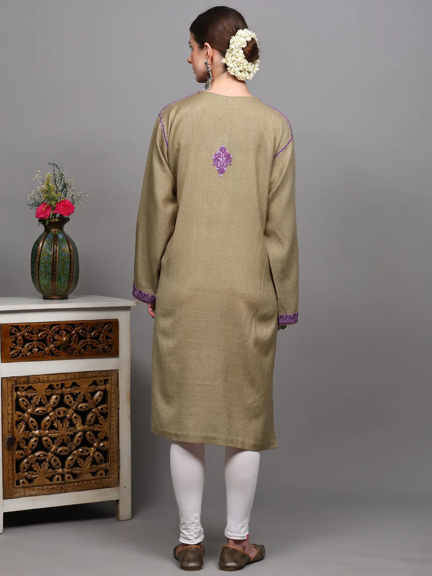 Kashmiri Phiran with Chain Stitch Embroidered Flowers in Multicolor Thread and Side Pockets
