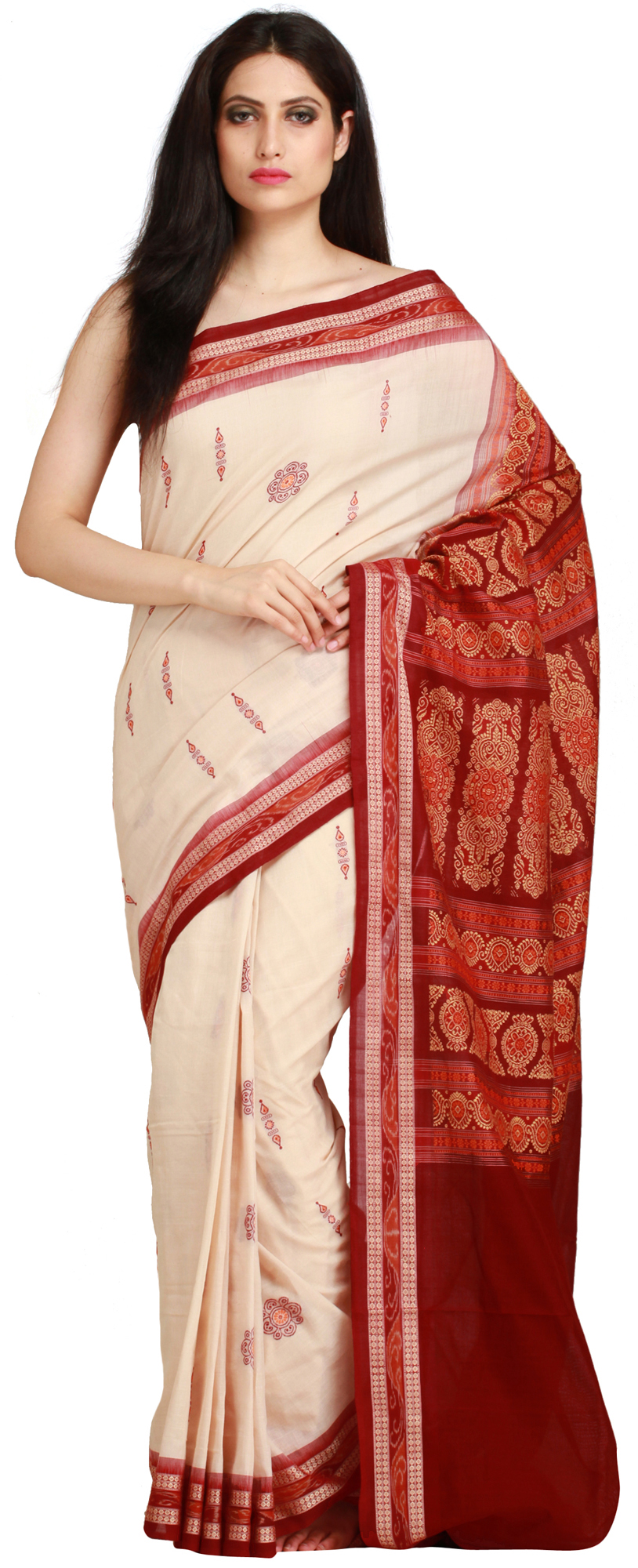 The choice of pure cotton ensures breathability and comfort, making this sari ideal for a variety of occasions, from festive gatherings to elegant everyday wear. The fabric drapes beautifully, allowing for effortless styling. The classic combination of white-smoke and maroon offers a sophisticated contrast that is both eye-catching and enduringly chic. This sari is more than just an attire; it is a piece of wearable art, carrying forward centuries of weaving tradition. –––––––––––––––––––