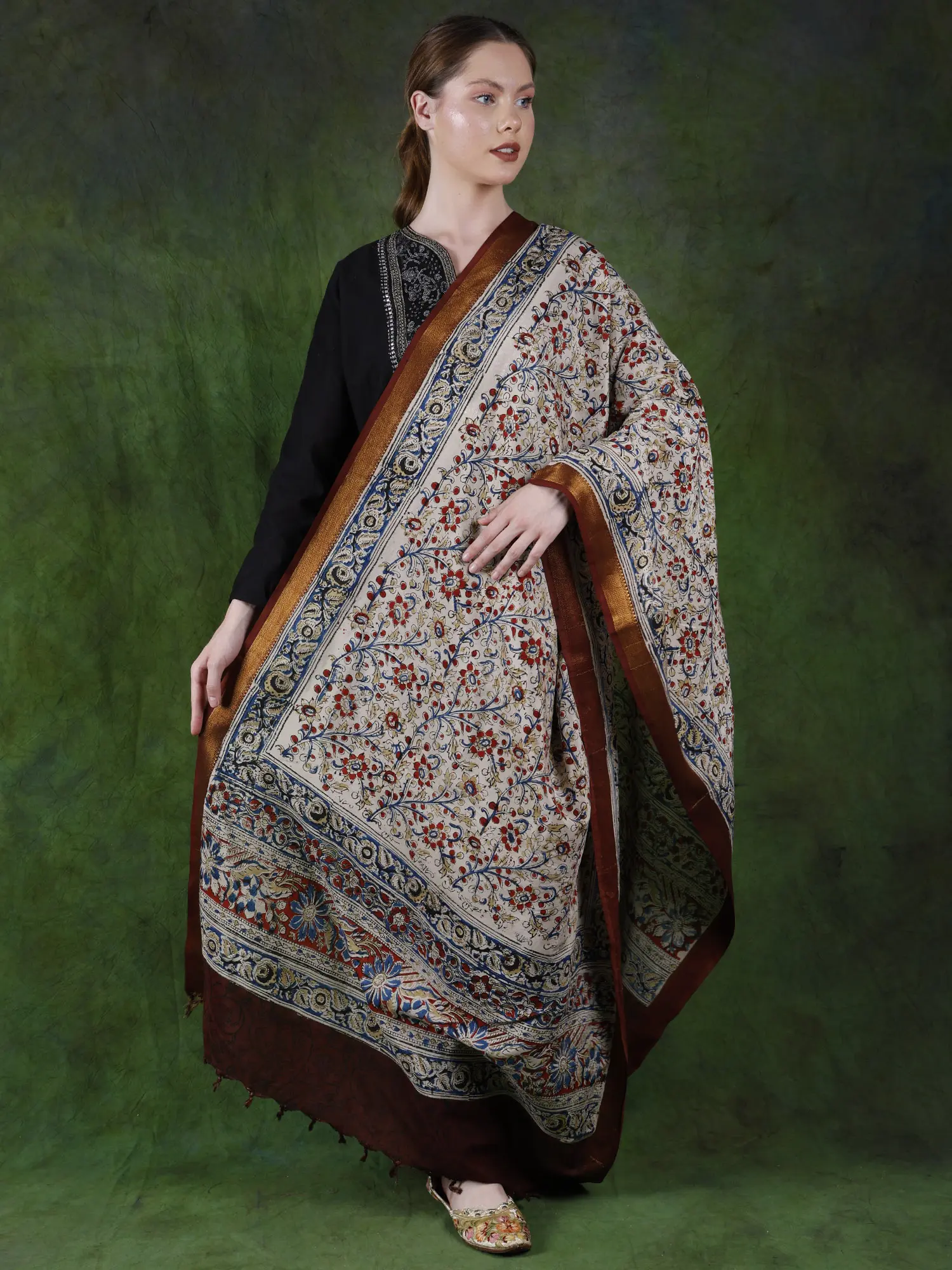 Kalamkari Dupatta from Telangana with Floral Vine Print and Zari work Border
