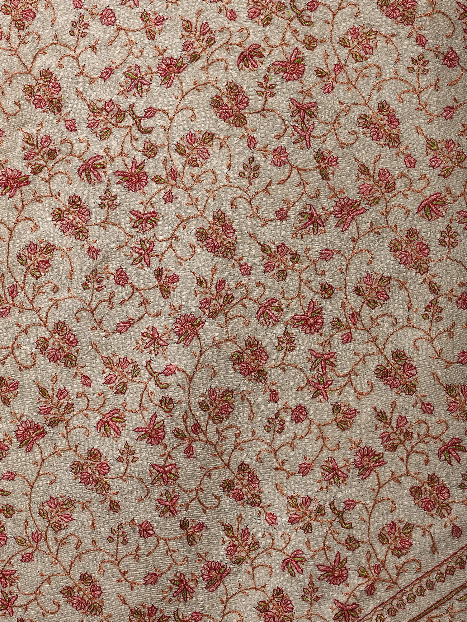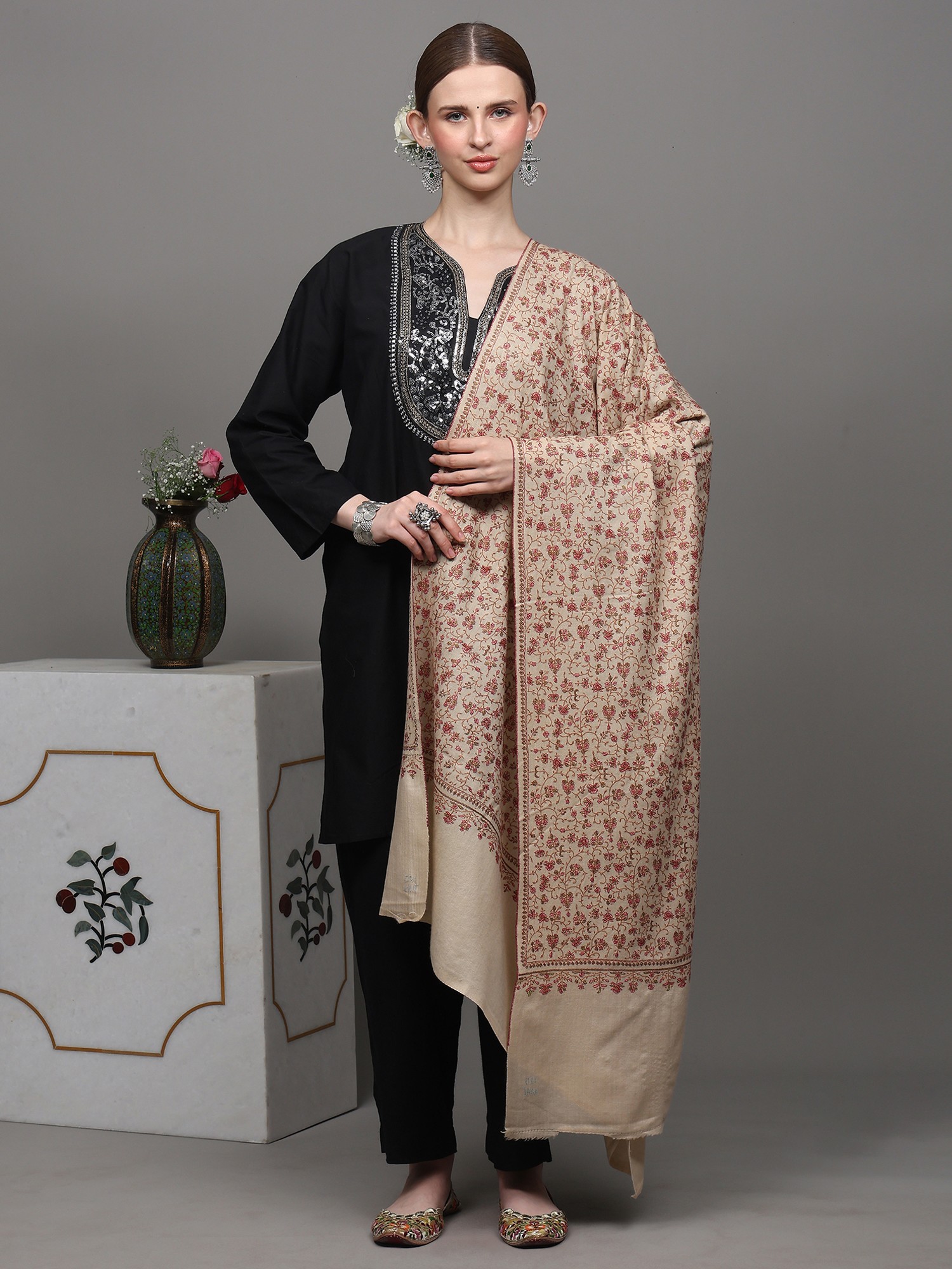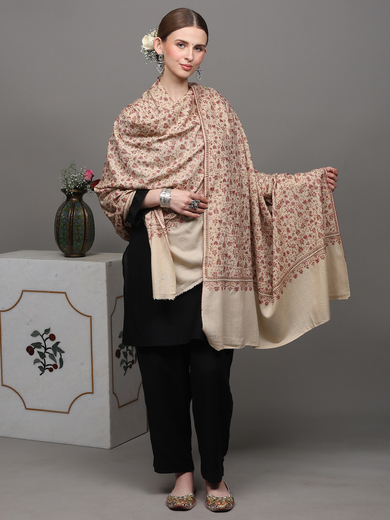 Indulge in the ethereal embrace of this “Pashmina Shawl”, a divine creation fashioned from the finest Cashmere fibres. Its delicate dusty peach base whispers secrets of luxurious warmth and unparalleled softness, a treasure to cherish. Adorned with the ancient artistry of “Kalamkari embroidery”, every petal and vine is a tribute to skilled hands and eternal tradition. The all-over floral pattern dances in a symphony of earthy hues, invoking the spirit of a tranquil garden in full bloom. This Shawl is a canvas of craftsmanship, a masterpiece of elegance, and a tribute to the artistry of Cashmere.