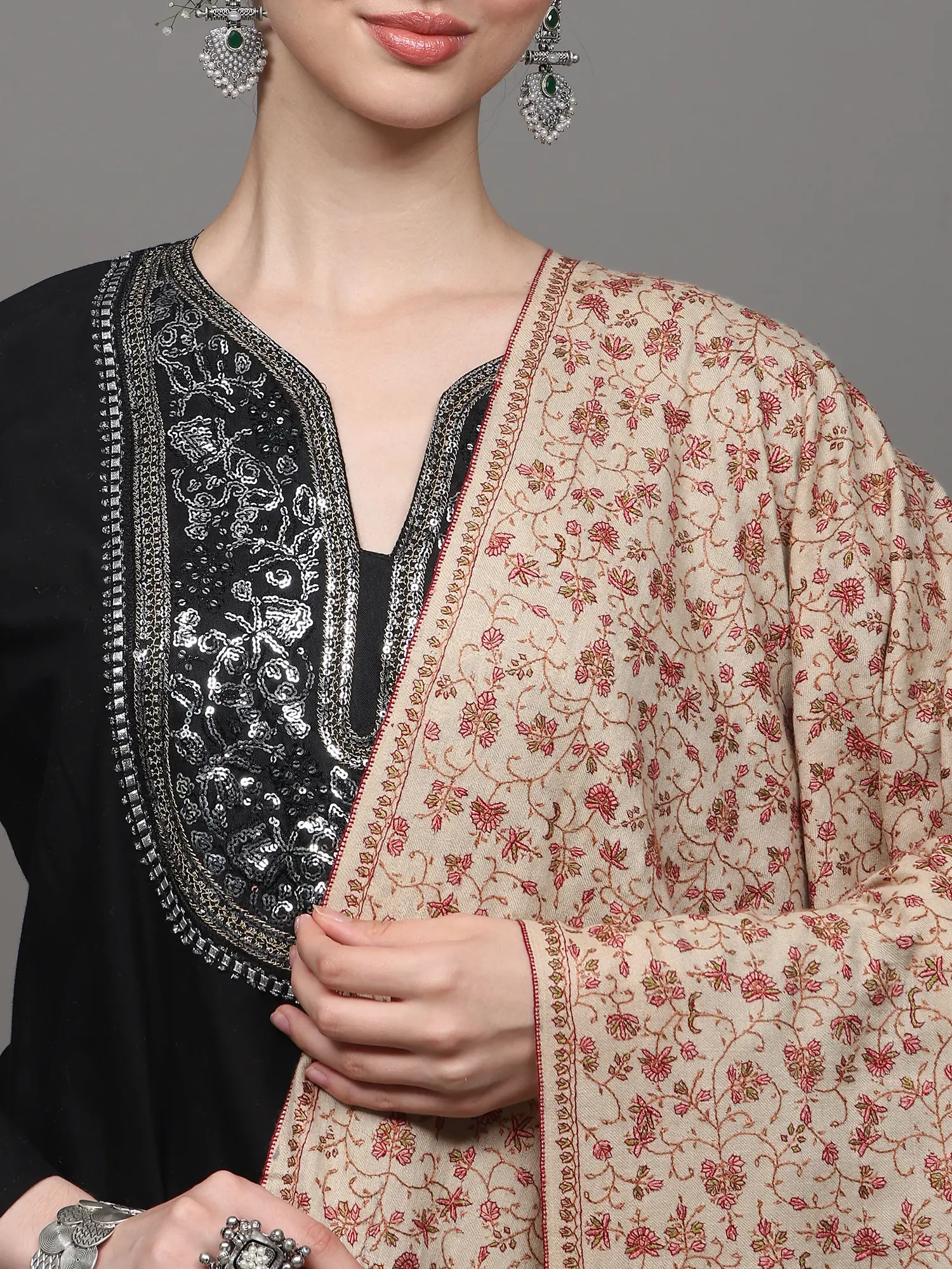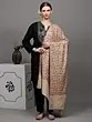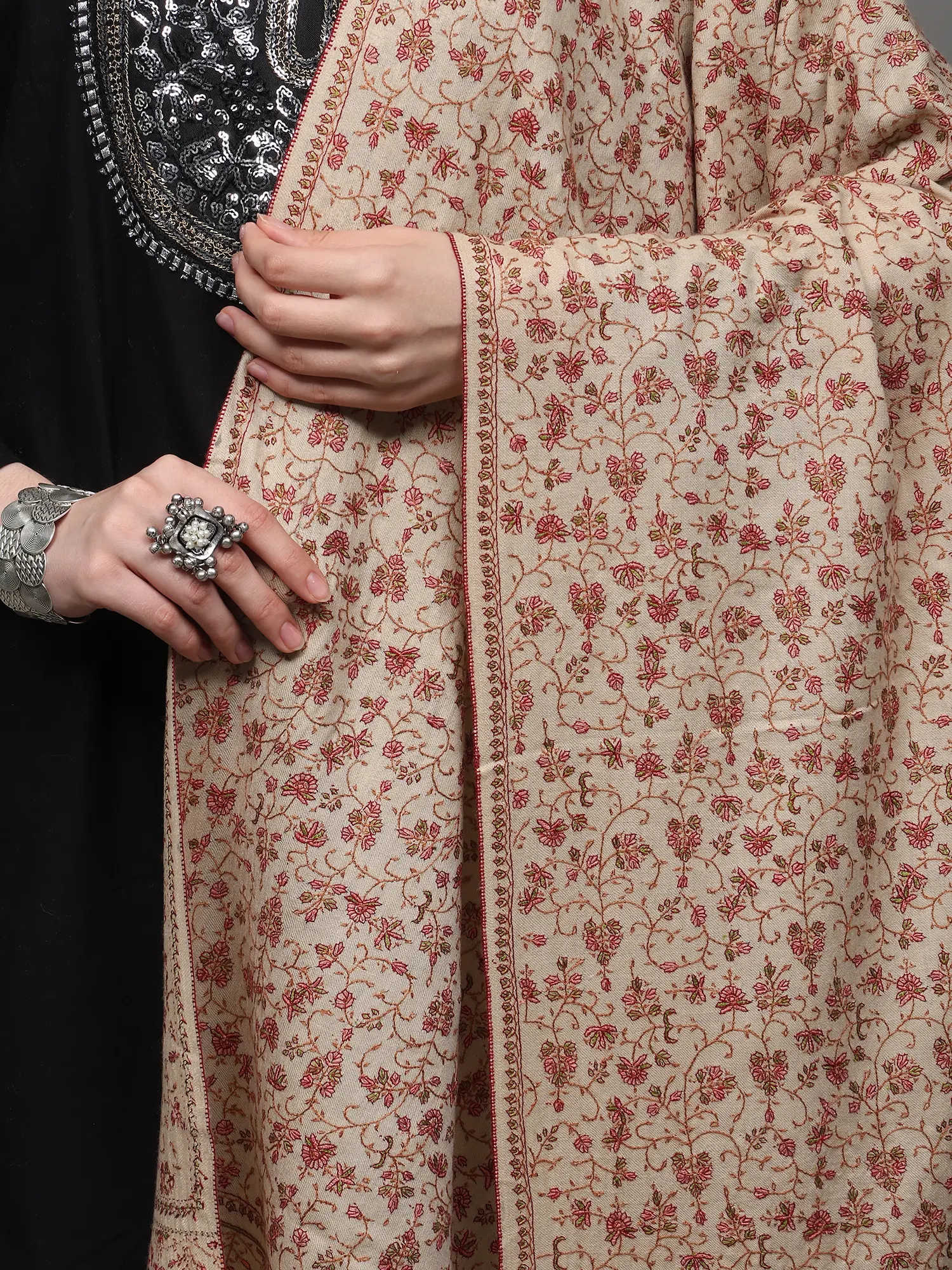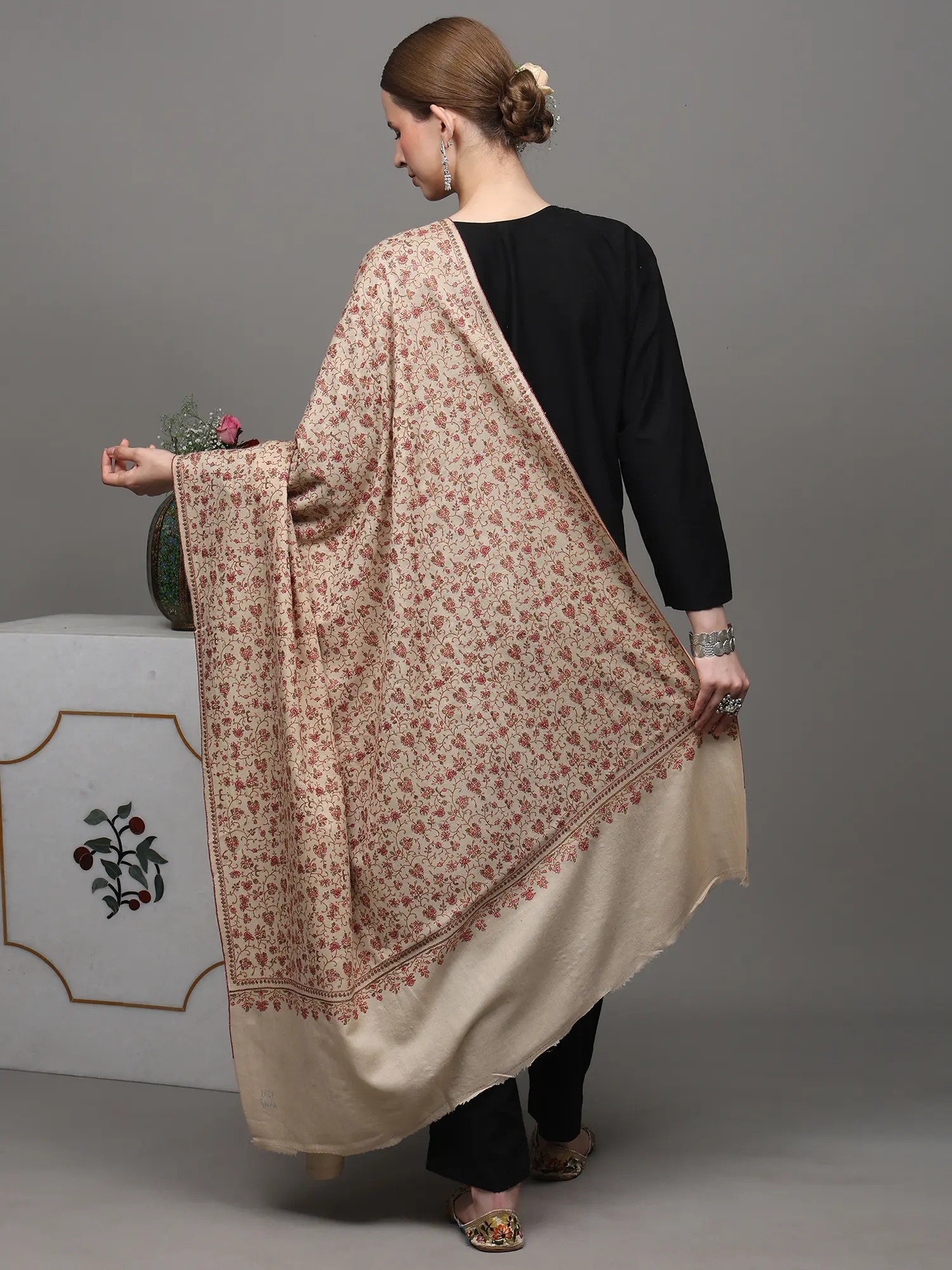 Indulge in the ethereal embrace of this “Pashmina Shawl”, a divine creation fashioned from the finest Cashmere fibres. Its delicate dusty peach base whispers secrets of luxurious warmth and unparalleled softness, a treasure to cherish. Adorned with the ancient artistry of “Kalamkari embroidery”, every petal and vine is a tribute to skilled hands and eternal tradition. The all-over floral pattern dances in a symphony of earthy hues, invoking the spirit of a tranquil garden in full bloom. This Shawl is a canvas of craftsmanship, a masterpiece of elegance, and a tribute to the artistry of Cashmere.