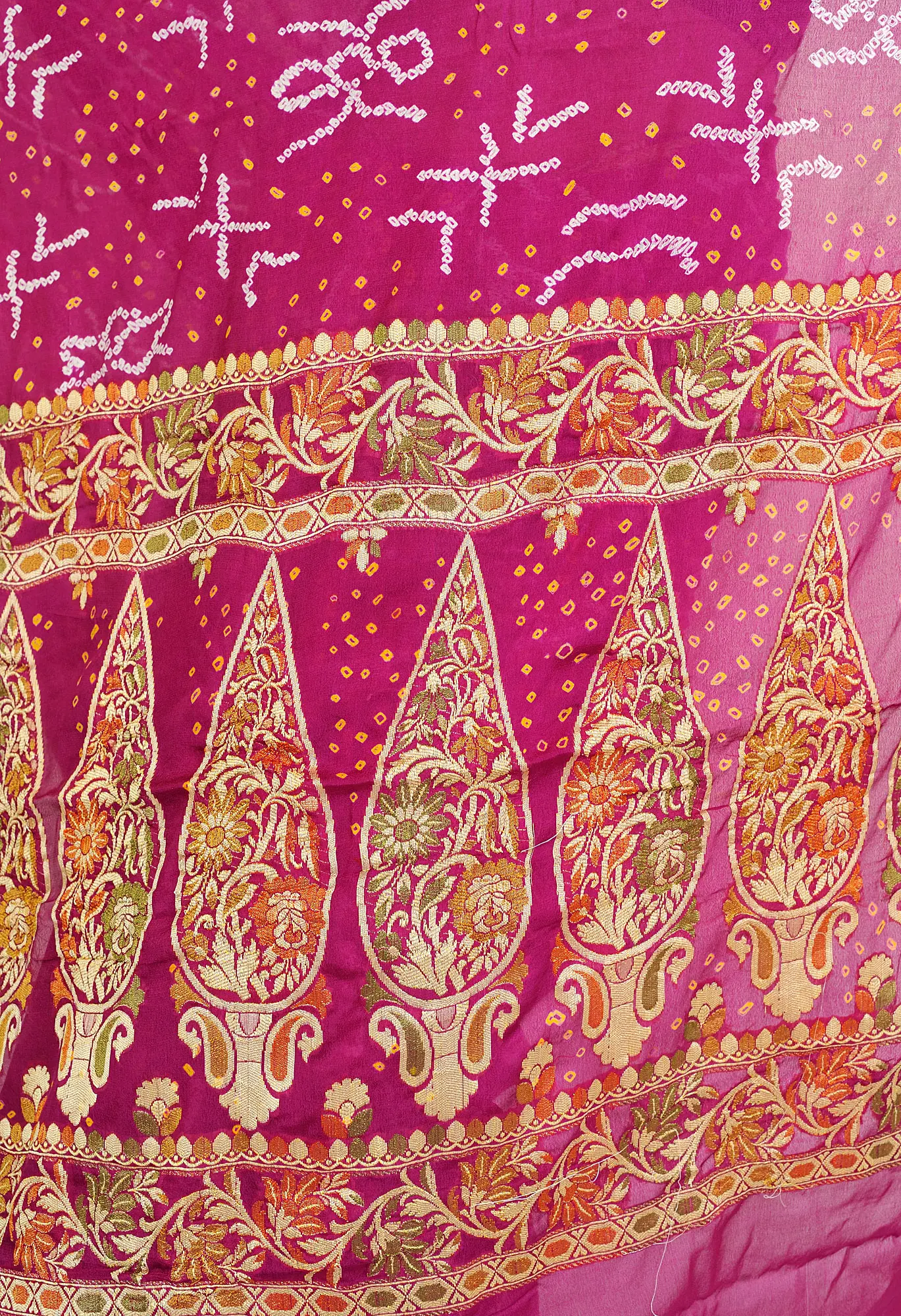 The Wild-Aster Bandhani Tie-Dye Sari from Jodhpur is a captivating testament to the beauty of Bandhani, a symbol of India's rich cultural heritage. Its tiny white dots, meticulously tied and dyed, along with the vibrant color choice, make it a quintessential representation of India's artistic richness. Crafted from luxurious crepe silk, this saree boasts a delightful balance of lovely hues. It's a tasteful choice for lovers of traditional Indian styles, where the texture of the fabric and the artistry of Bandhani combine to create a drape that's not just clothing, but a vibrant expression of tradition and elegance.