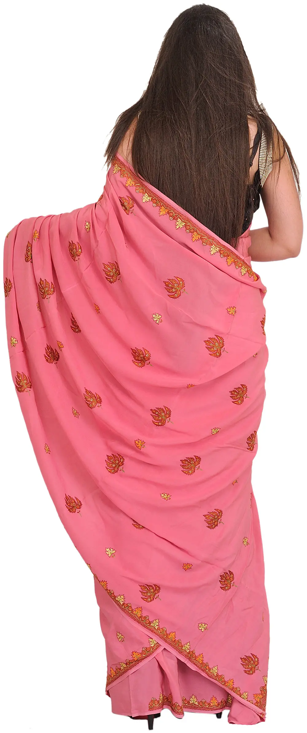 Earth-Red Sari with Kashmiri Floral Embroidery on Aanchal and Border