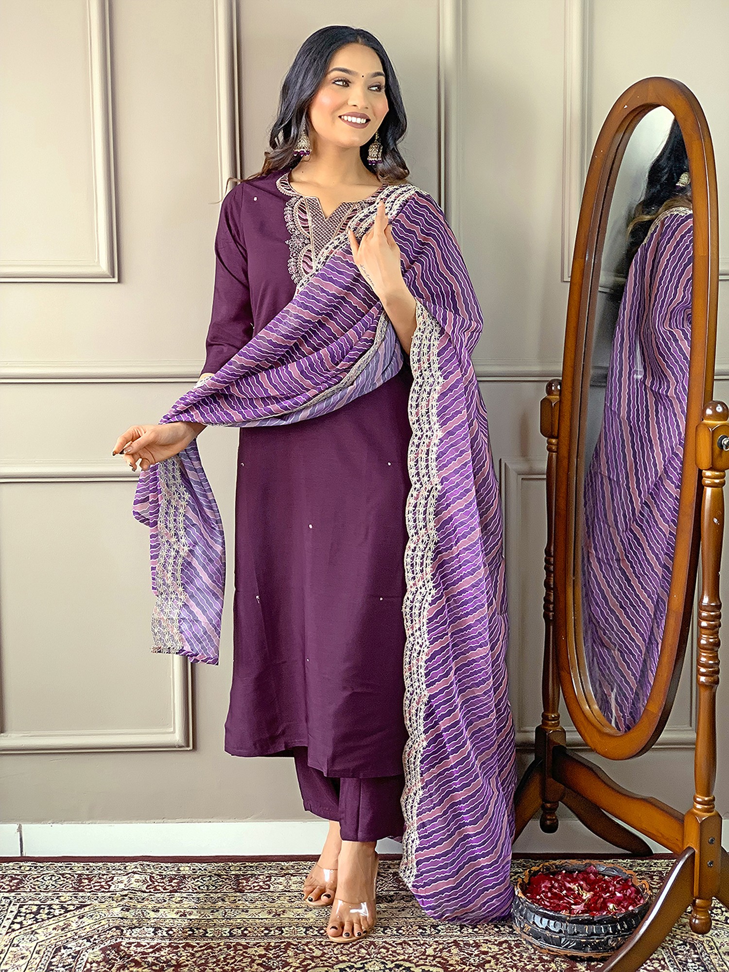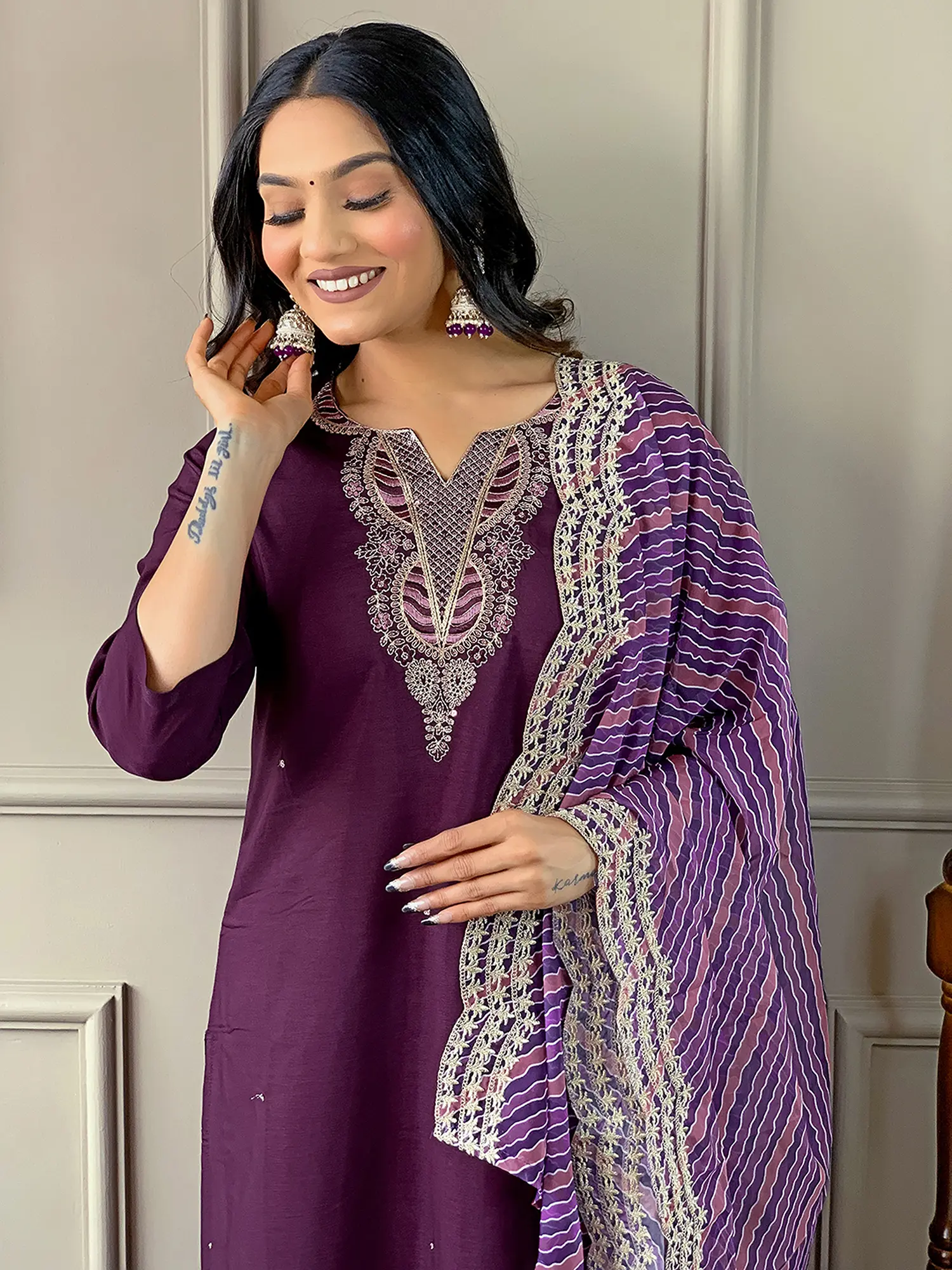 Stunning A-Line Embroidery Work Viscose Chanderi Festive Kurta Set With Dupatta