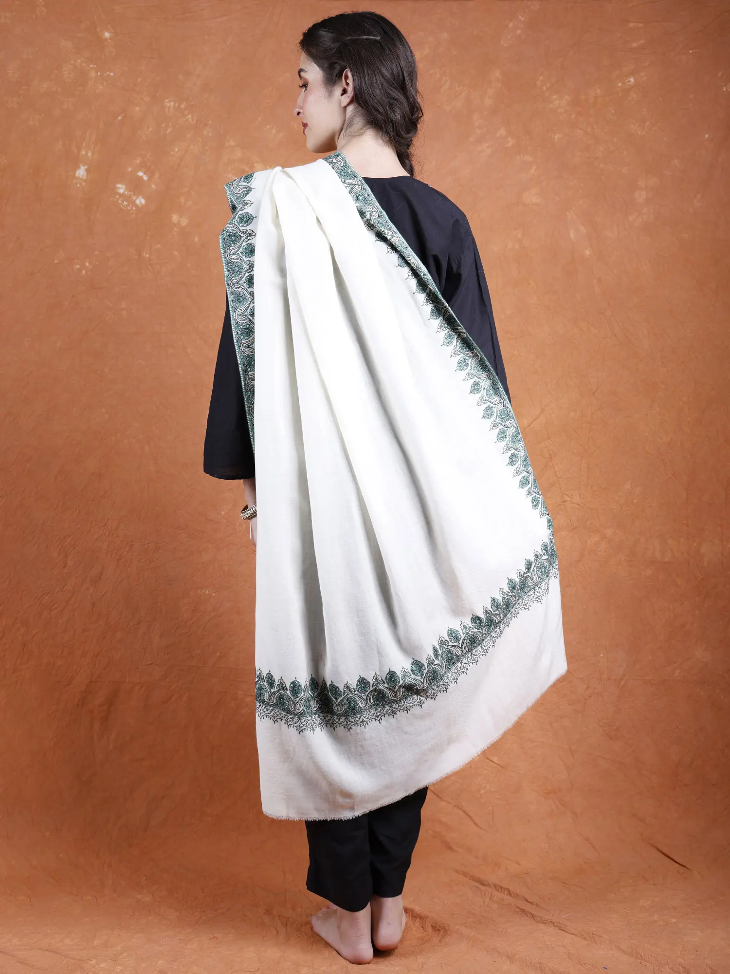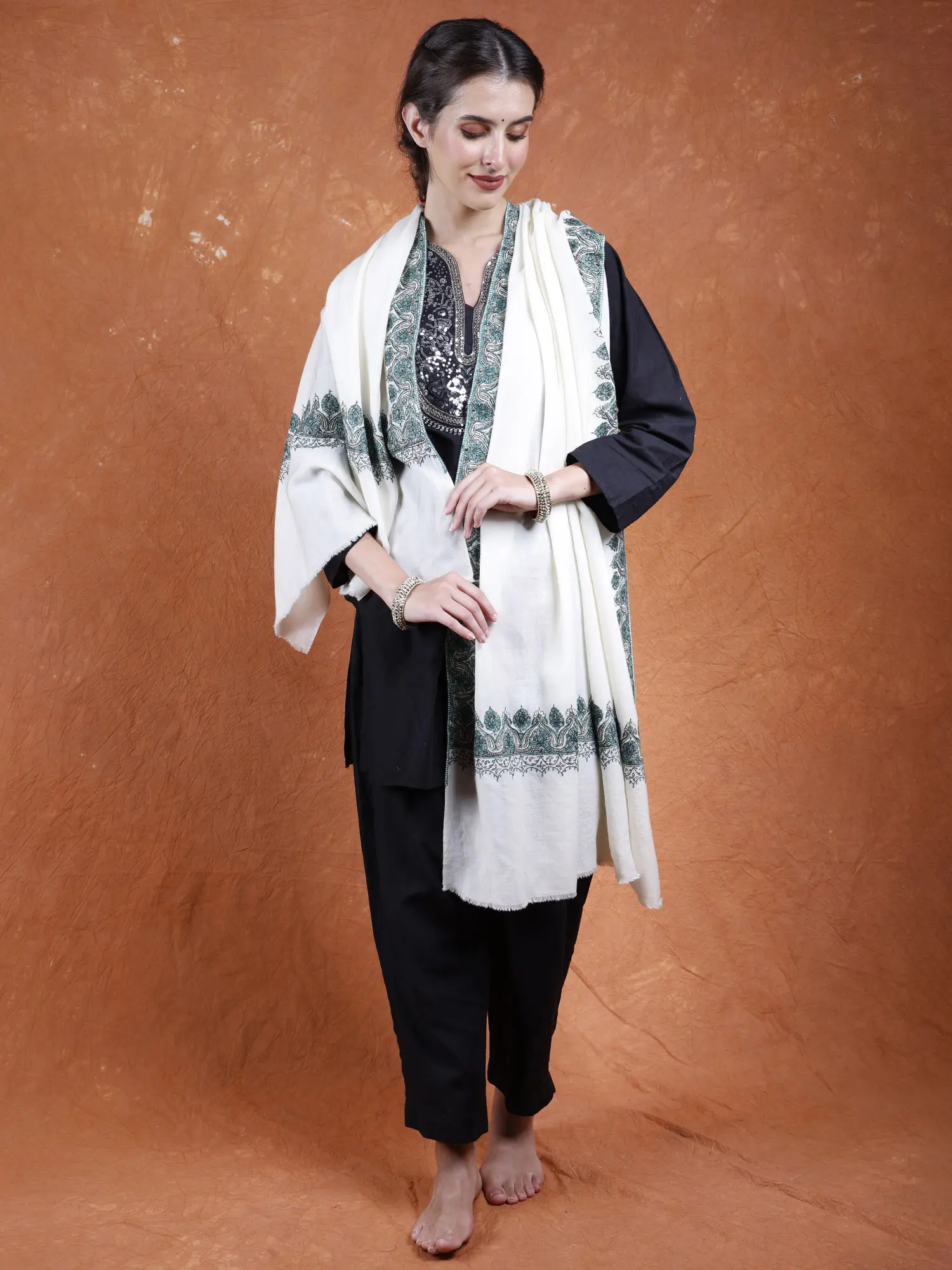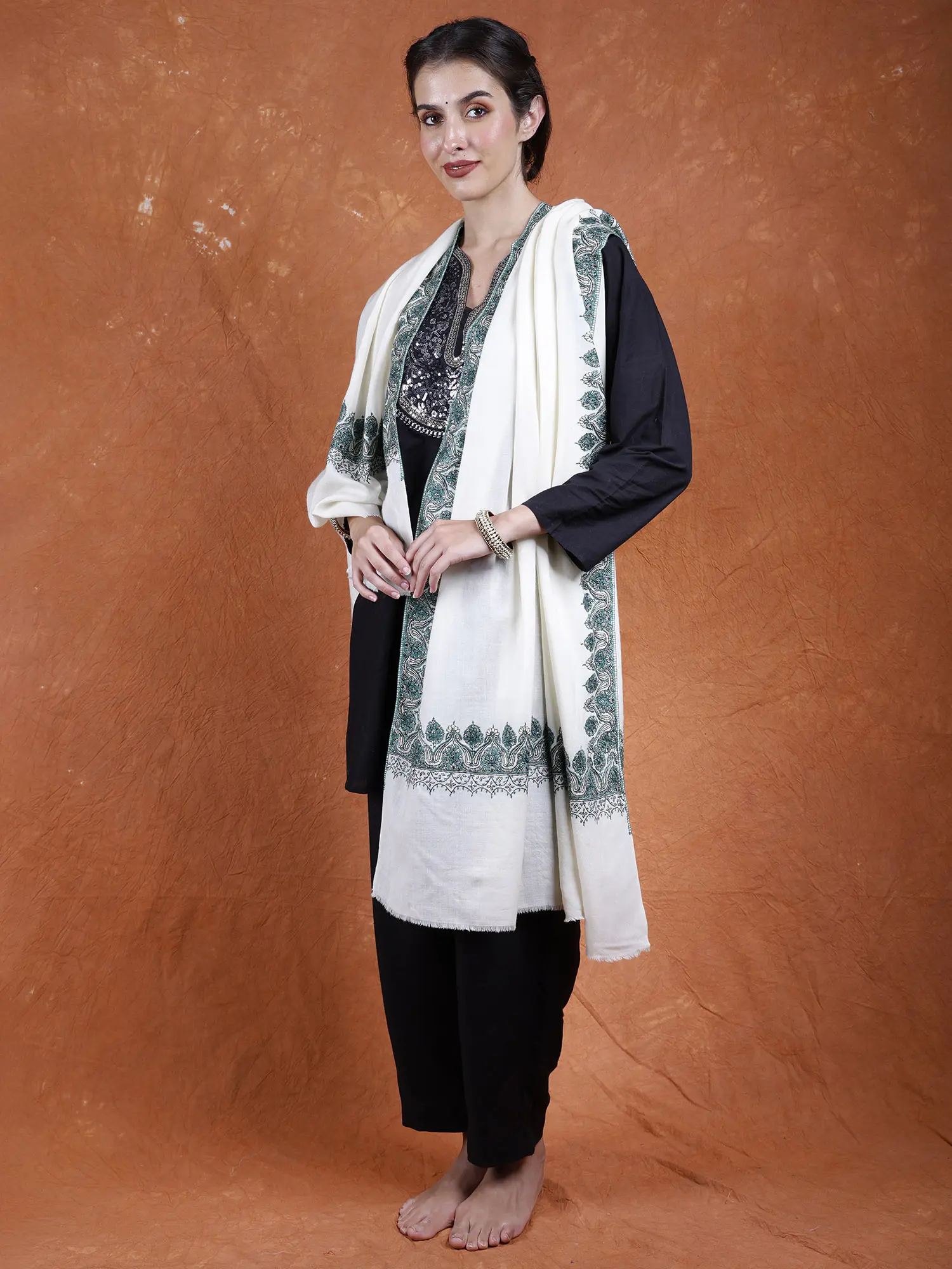 Paisley holds a significant cultural place in the realm of shawls and carpets, particularly in regions like Kashmir and Persia. Originating from Persia, the paisley motif symbolizes fertility, eternity, and the tree of life, carrying deep cultural and historical significance. This Winter-White Hand-Aari Embroidered Pure Wool Shawl with Sozni Paisley Border beautifully harnesses the brilliance of this iconic motif.