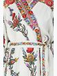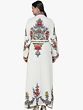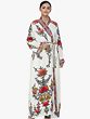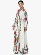 An elegant wrap-style body with a kimono-like collar makes for a silhouette you cannot go wrong with. The edge of the robe is lined with a thick panel of embroidery - colourful flowers, each of them woven from multiple shades and tints of the same threads. A palette of cheerful pastels such as blues and reds and greens and yellows. Note the full-length sleeves, flared at the edges which are just shy of touching the knuckles. Indeed, such a robe is slated to start conversations about you even after you have long left the room.